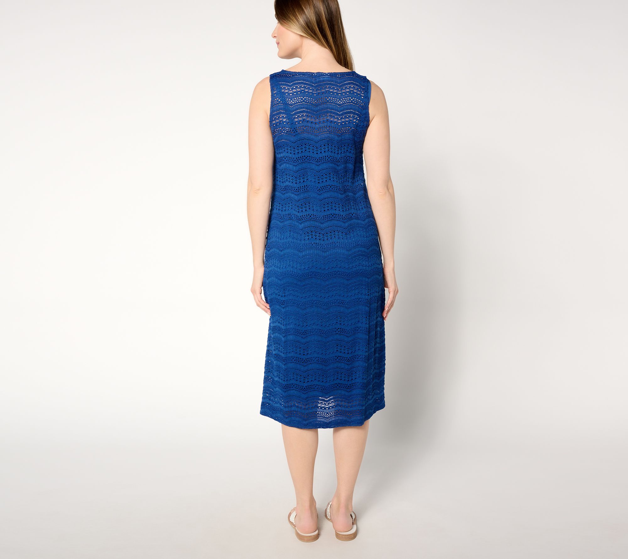 Loving the idea of allover lace -- but a little too sheer for your social outings? Susan Graver's crochet midi dress has (literally) got you covered! A sleek and smooth lining attached underneath saves the day, giving you the modesty and confidence to turn heads -- for all the right reasons. From Susan Graver.