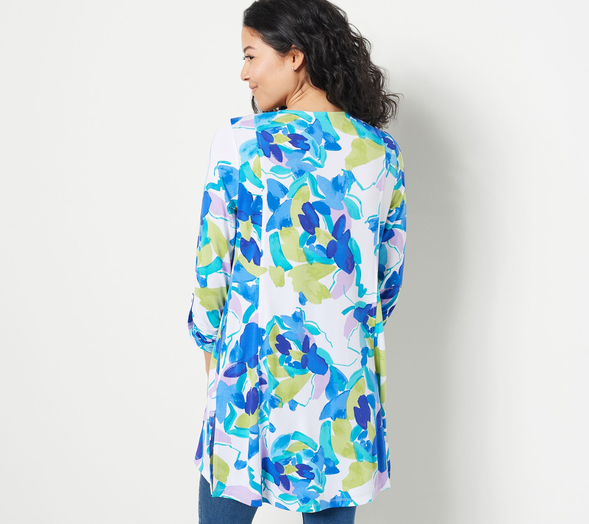 Features: allover print, 3/4-length sleeves, open-front design, elastic ruched detail at top and bottom sleeve openings, non-functional one button at top sleeve openings, sleeve tab detail, front and back princess seams with on-seam pockets, high-low hemline, side vents