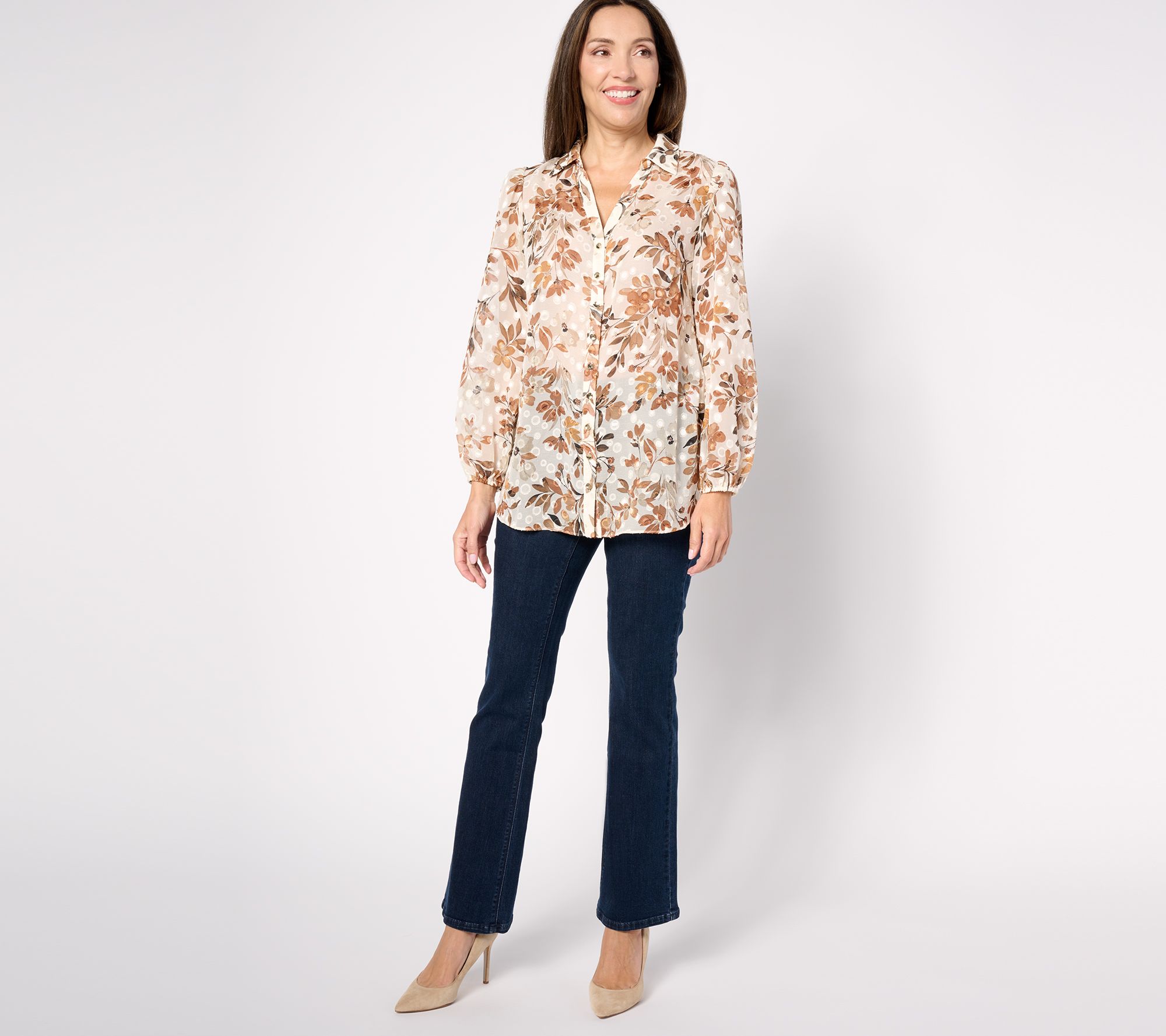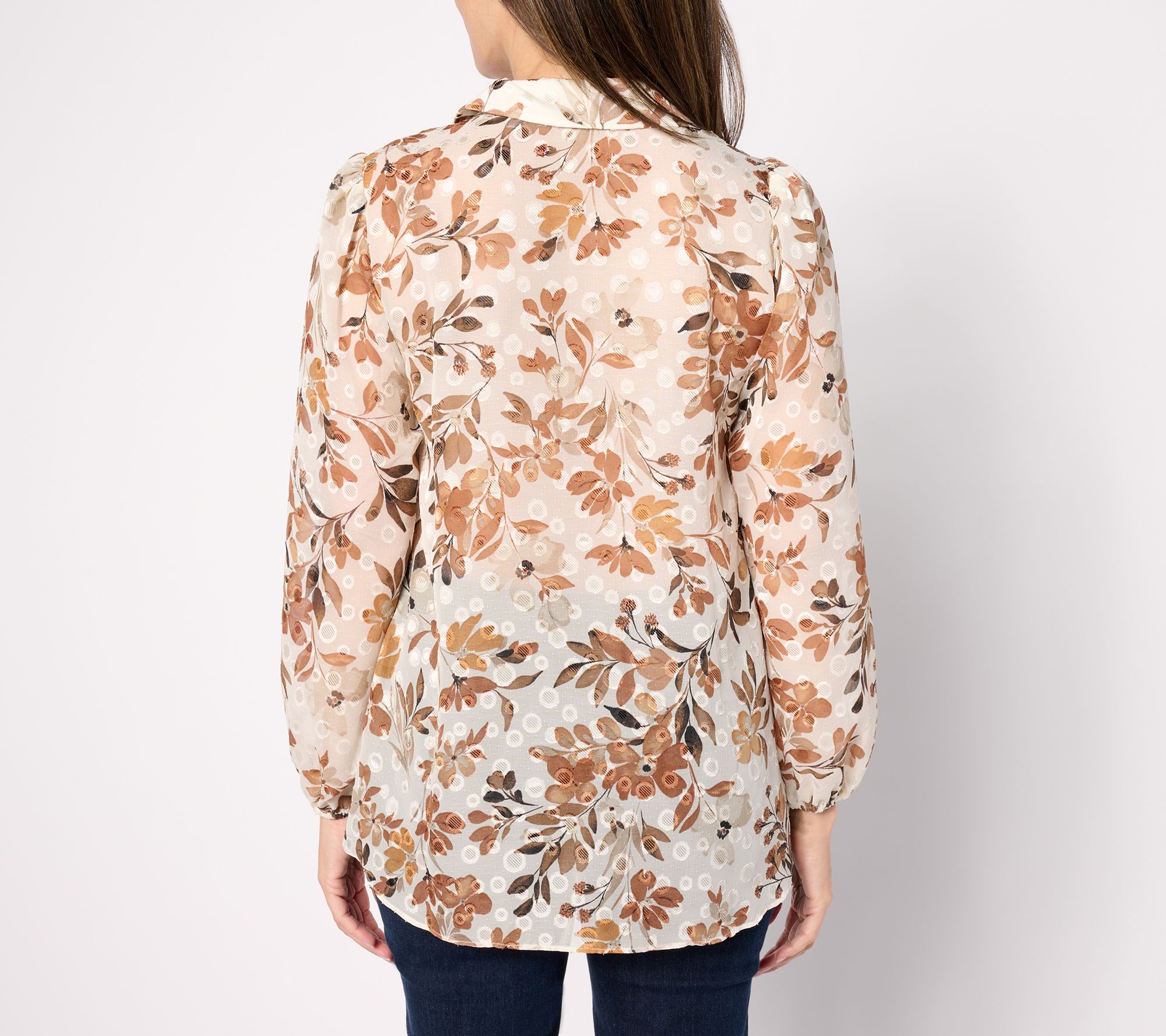 Present a pretty, polished picture of sophistication when you don this button-front blouse with straight-leg trousers and a pair of pumps. The clip dot design combined with an alluring print are a match made in heaven. From Susan Graver.