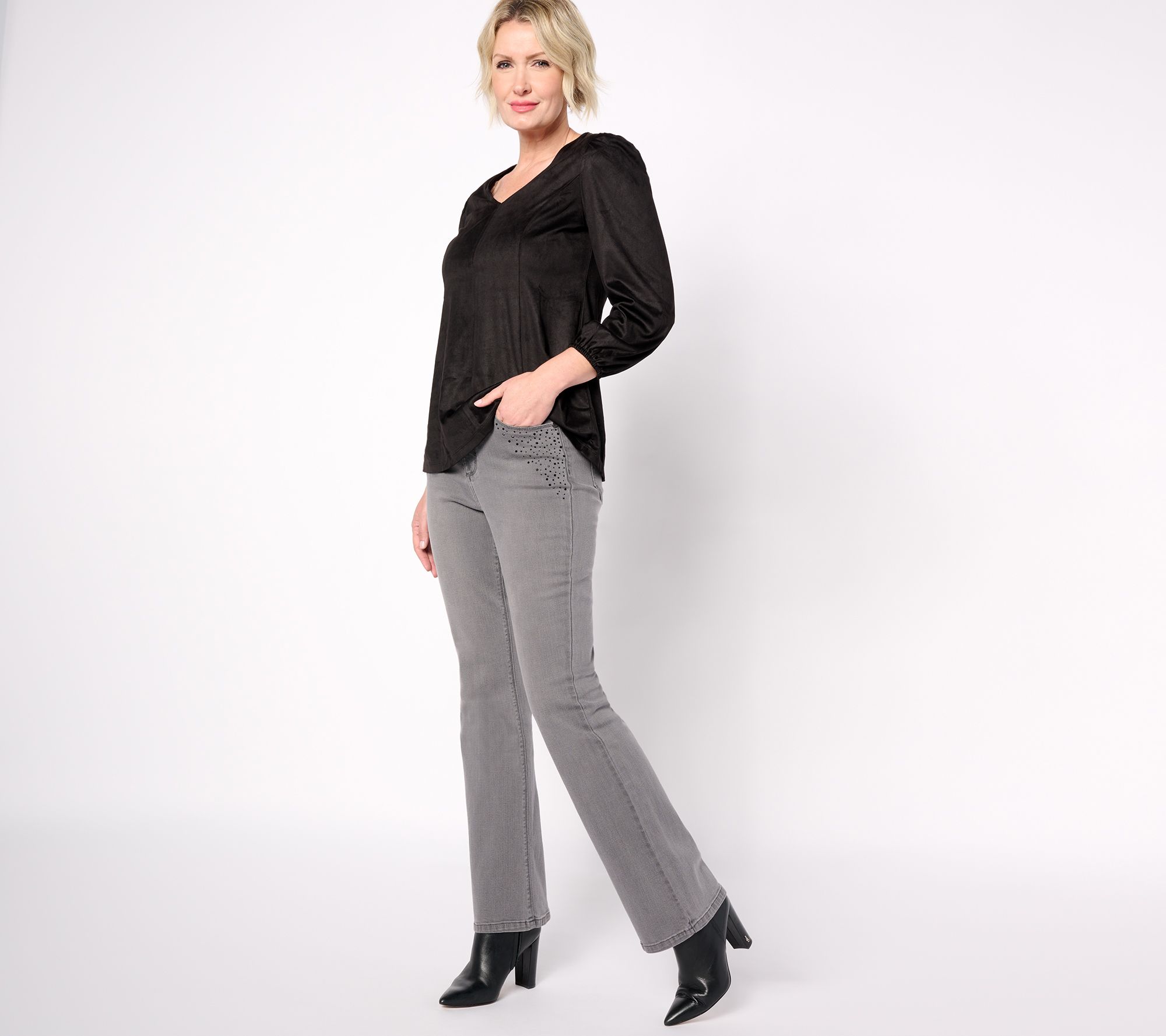 "As Is" Susan Graver Petite Embellished Pocket Boot-cut Jeans