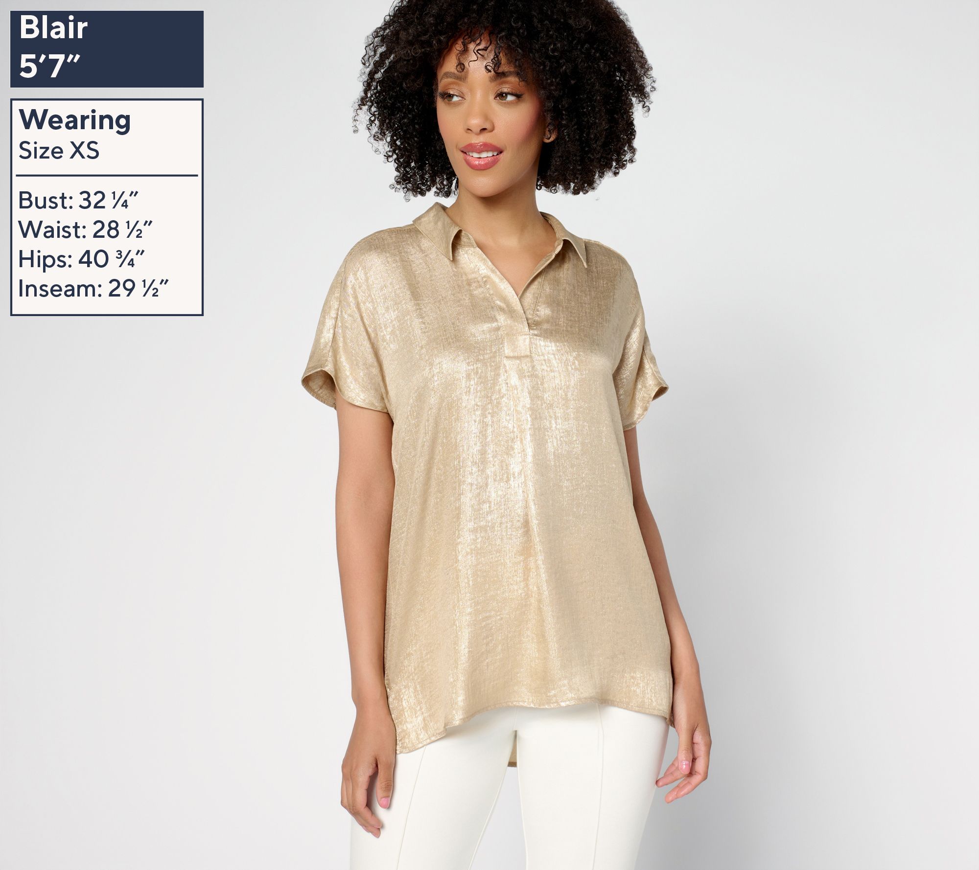 When your day calls for a little shimmer, this foiled henley-style top rises to the occasion. With polished touches like a collared open placket and modern details -- including a curved shirttail hem -- it's an effortless pick for dressing up denim or layering under a blazer for dinner out. From Susan Graver.