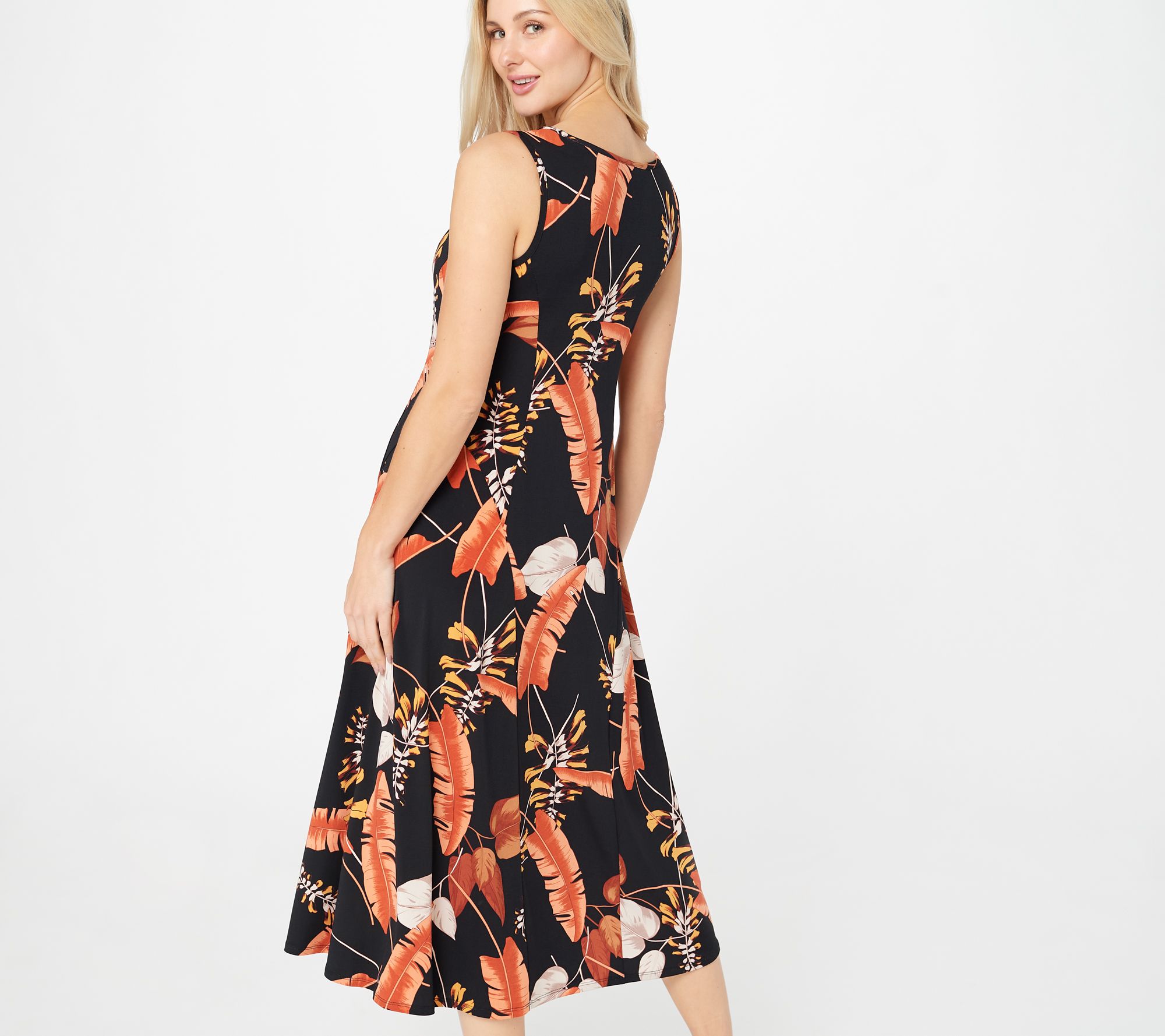 • Features: square neckline, allover printed, sleeveless, front and back princess seaming detail, hip seam detail, midi-length
