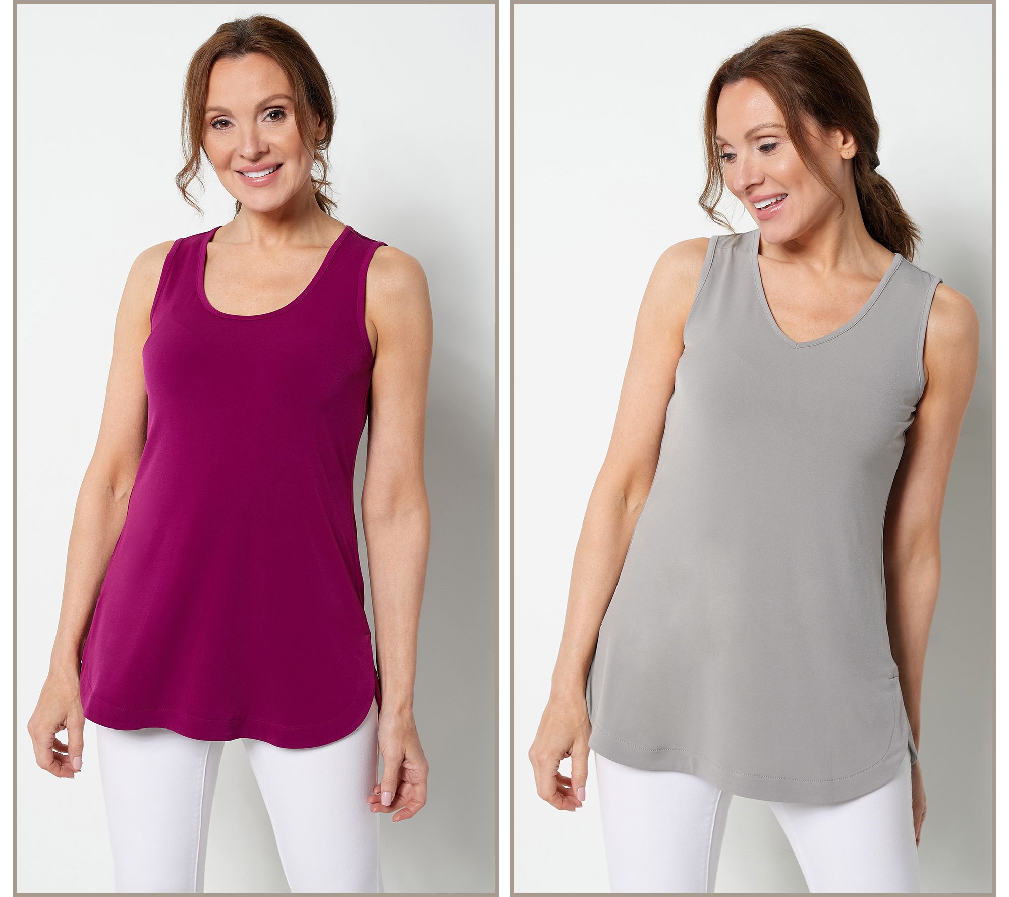 The champions of your basics: these tunic tanks -- one with a V-neck, and one with a scoop-neck. They'll equip your closet with an unbeatable versatility. From Susan Graver.