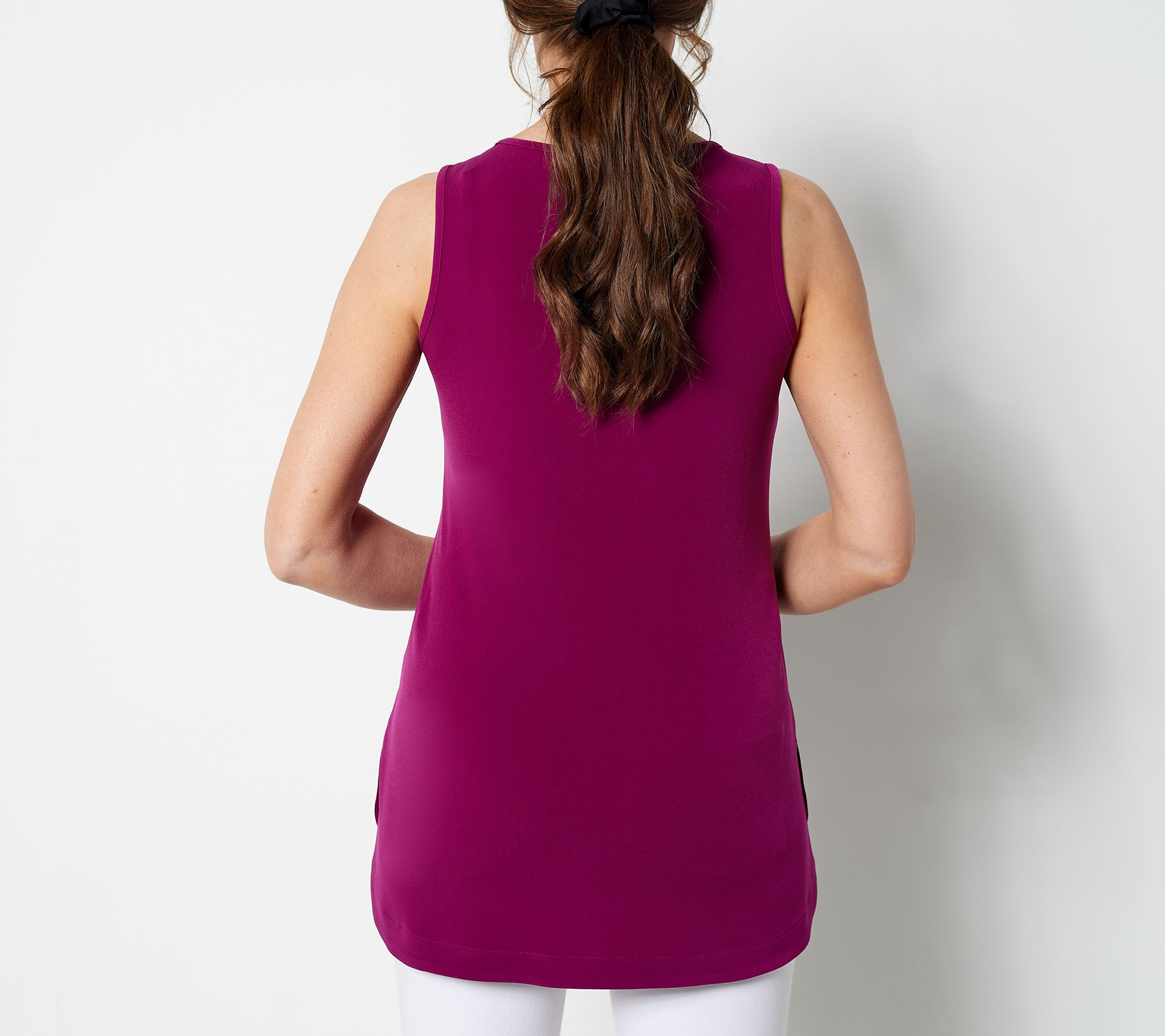 • Features: solid color, sleeveless, overlapping curved side vents, shirttail hemline, tunic-length