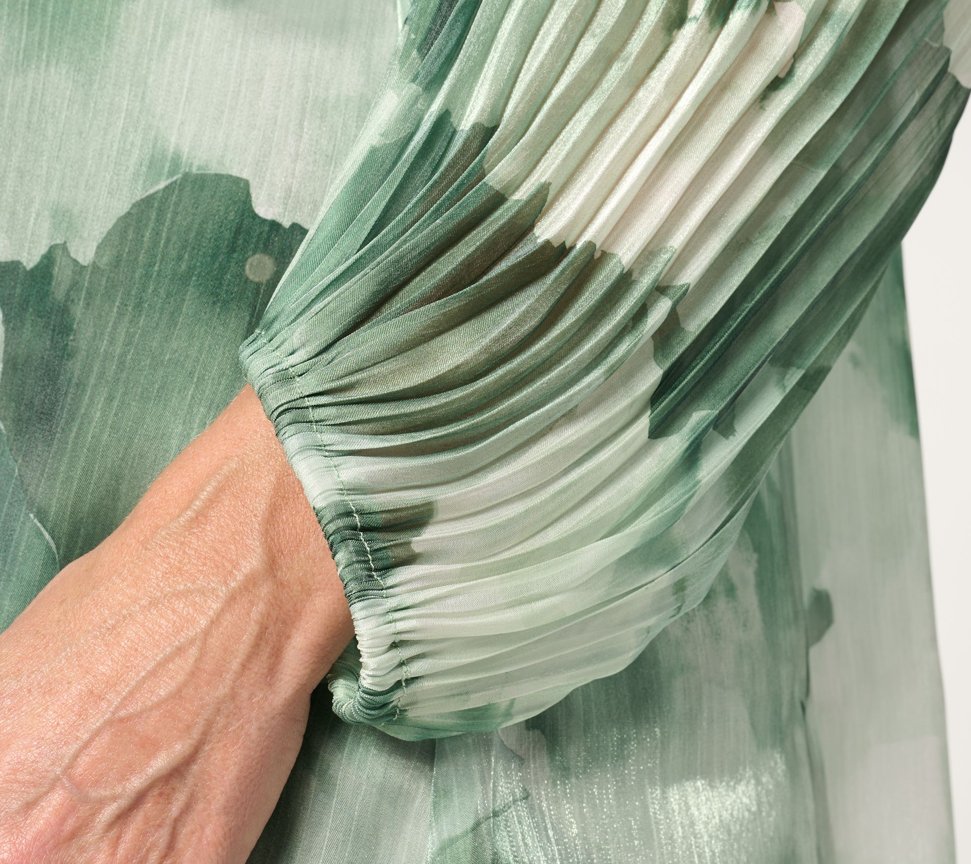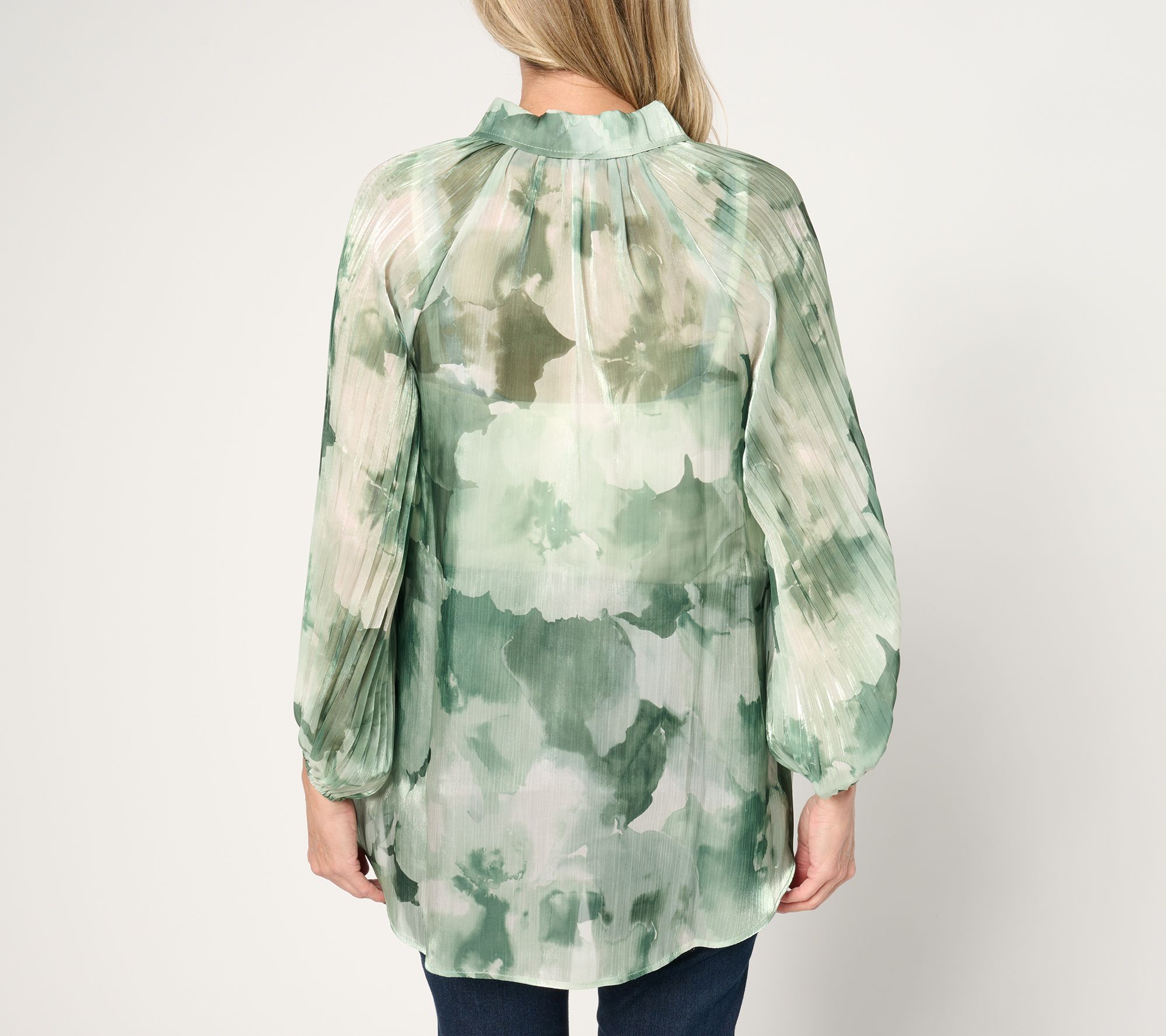 A little bit chic, a little bit fun -- this printed sheer tunic is the best of all worlds. Pleated sleeves are joined by an elastic-encased sleeve opening to create a distinctive look. From Susan Graver.