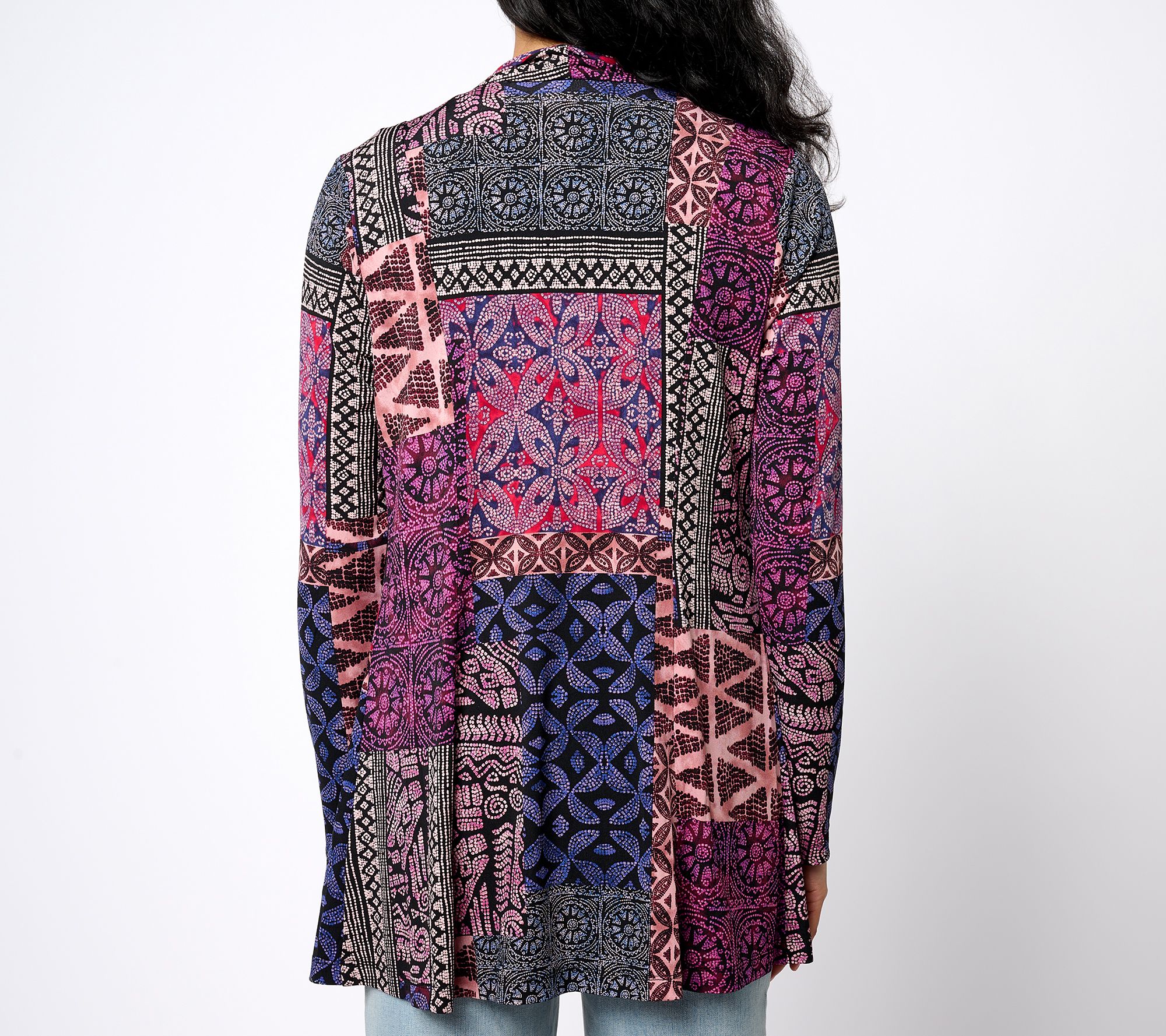 • Cardigan Features: allover print, long sleeves, open front, front and back princess seams, on-seam pockets, shirring at center back