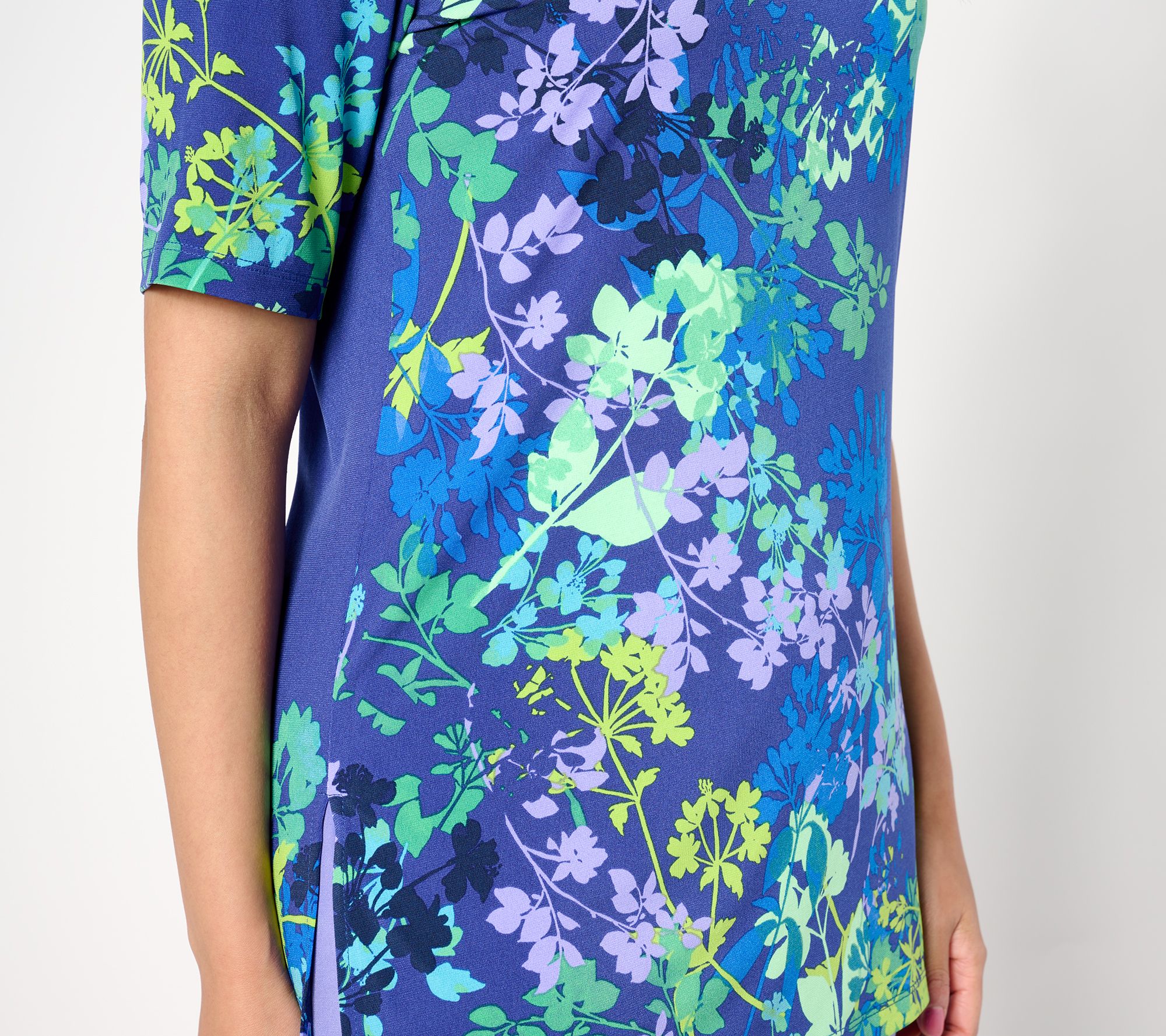 • Features: printed design, elbow-length sleeves, bateau neckline, side slits
