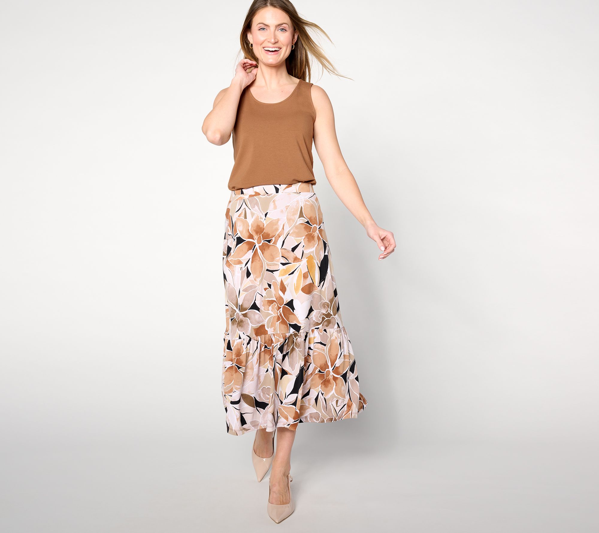Covered in a fresh floral pattern and tiered for Bohemian flair, this Liquid Knit® midi skirt will be a hit at all of the events on your summer social calendar. From Susan Graver.