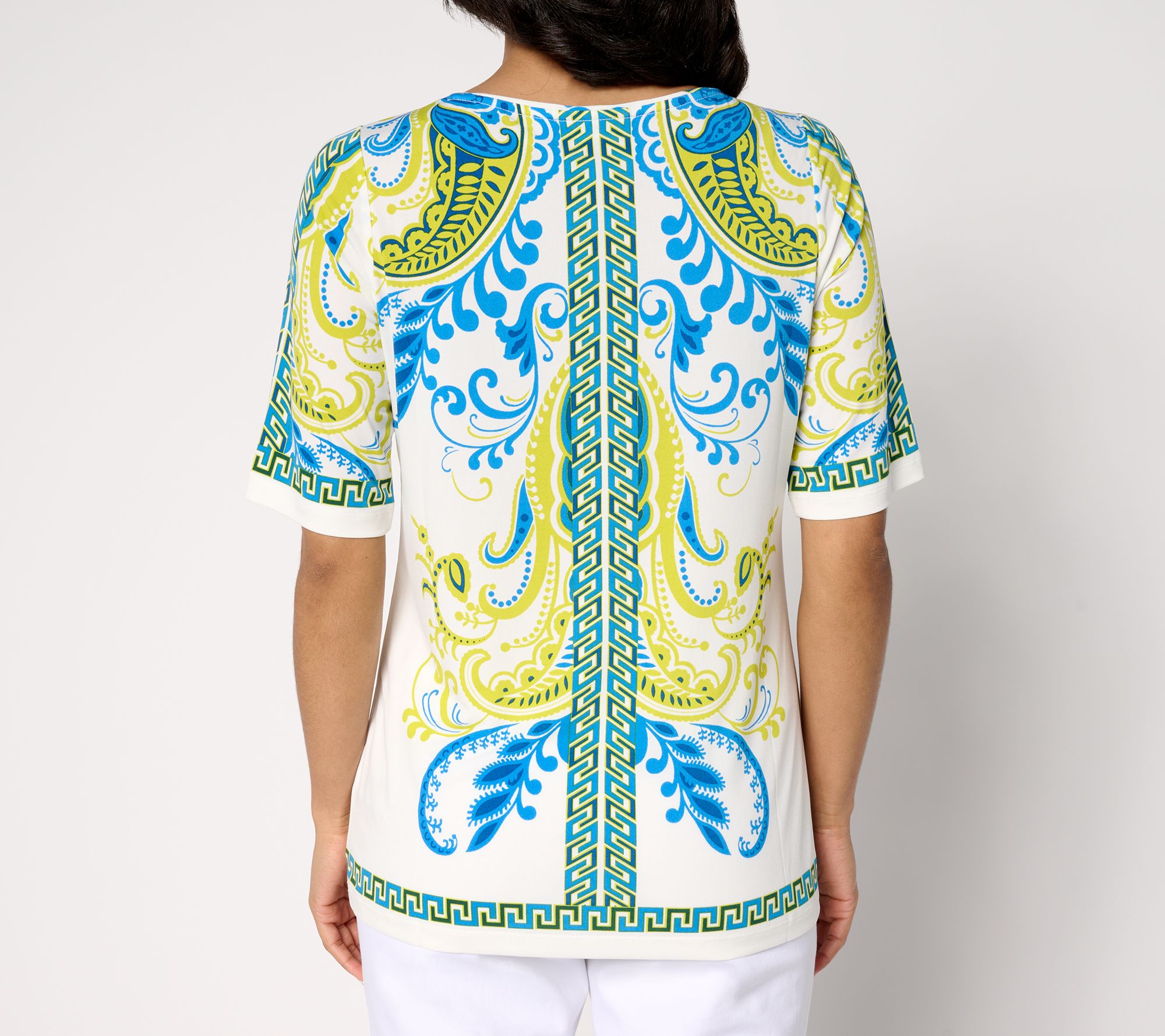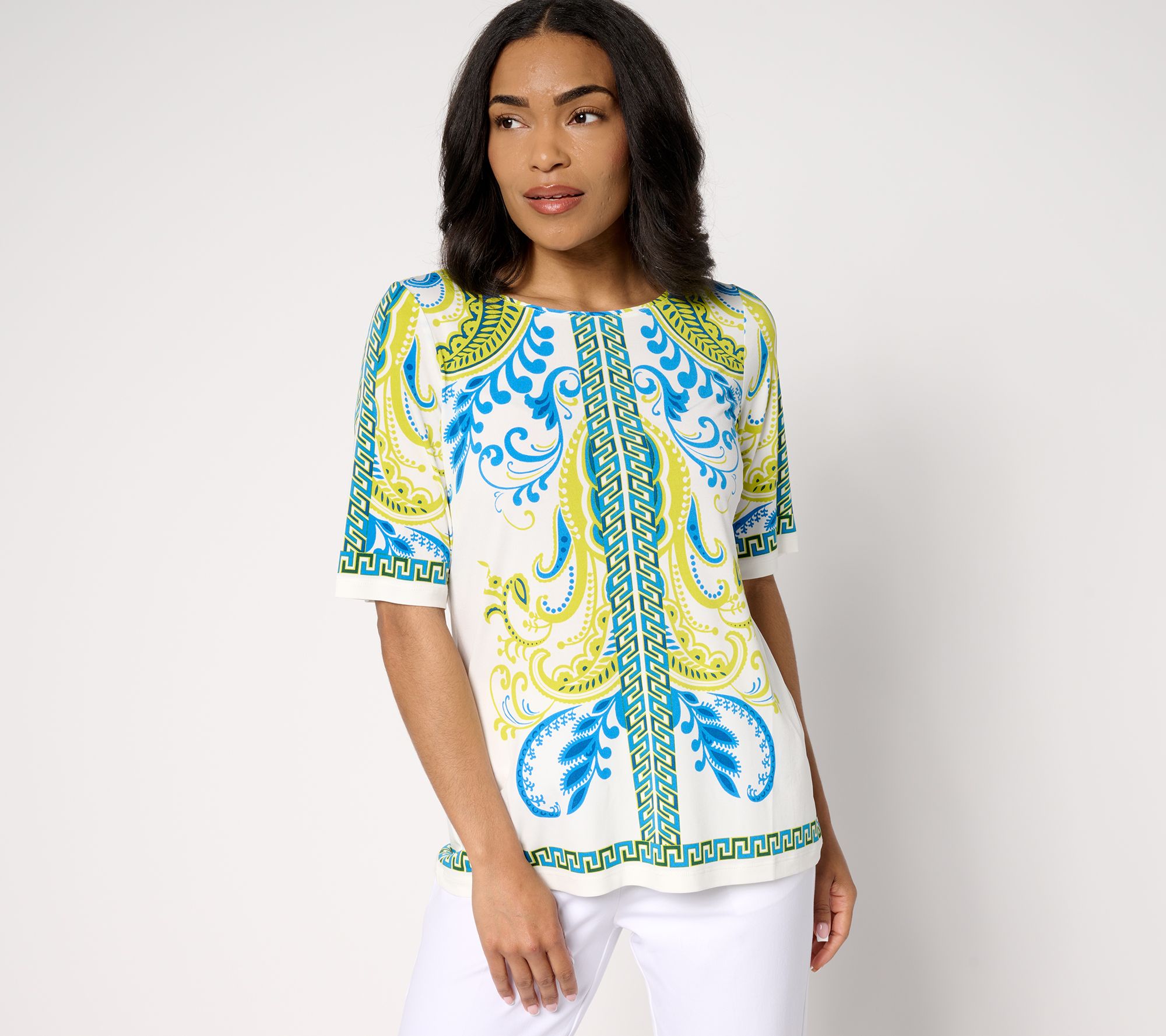 In search of a more sophisticated piece for work or social commitments? You don't have to travel abroad, just slip into this Liquid Knit® tunic with a fab fashion house-inspired print. Add some shiny chains, a silk scarf, and leather sandals to go all out. (Aperitivo spritz optional!) From Susan Graver.