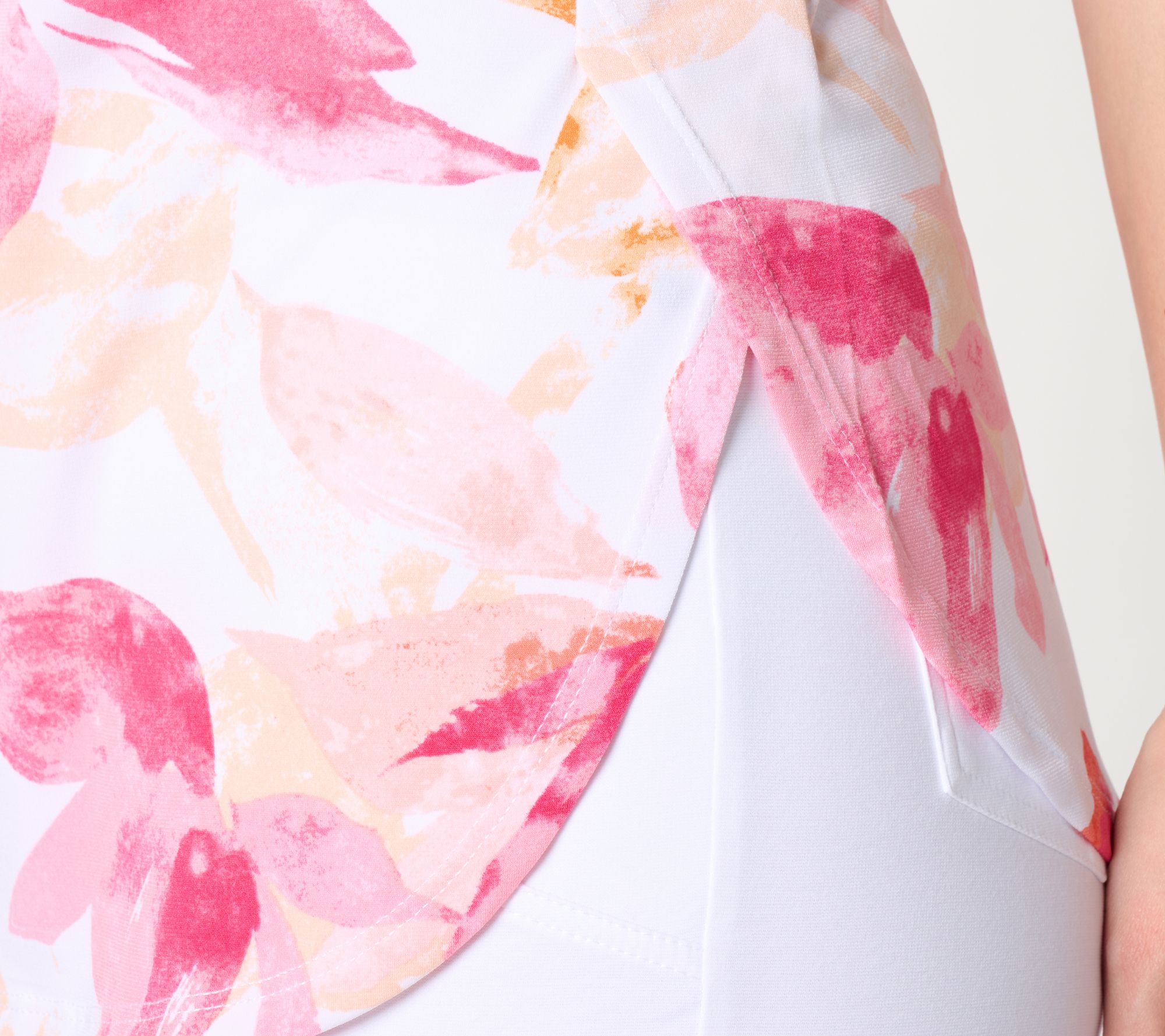 • Features: pullover style, bateau neckline, elbow-length sleeves, random print, overlapping forward side seams, slit details, curved bottom hem