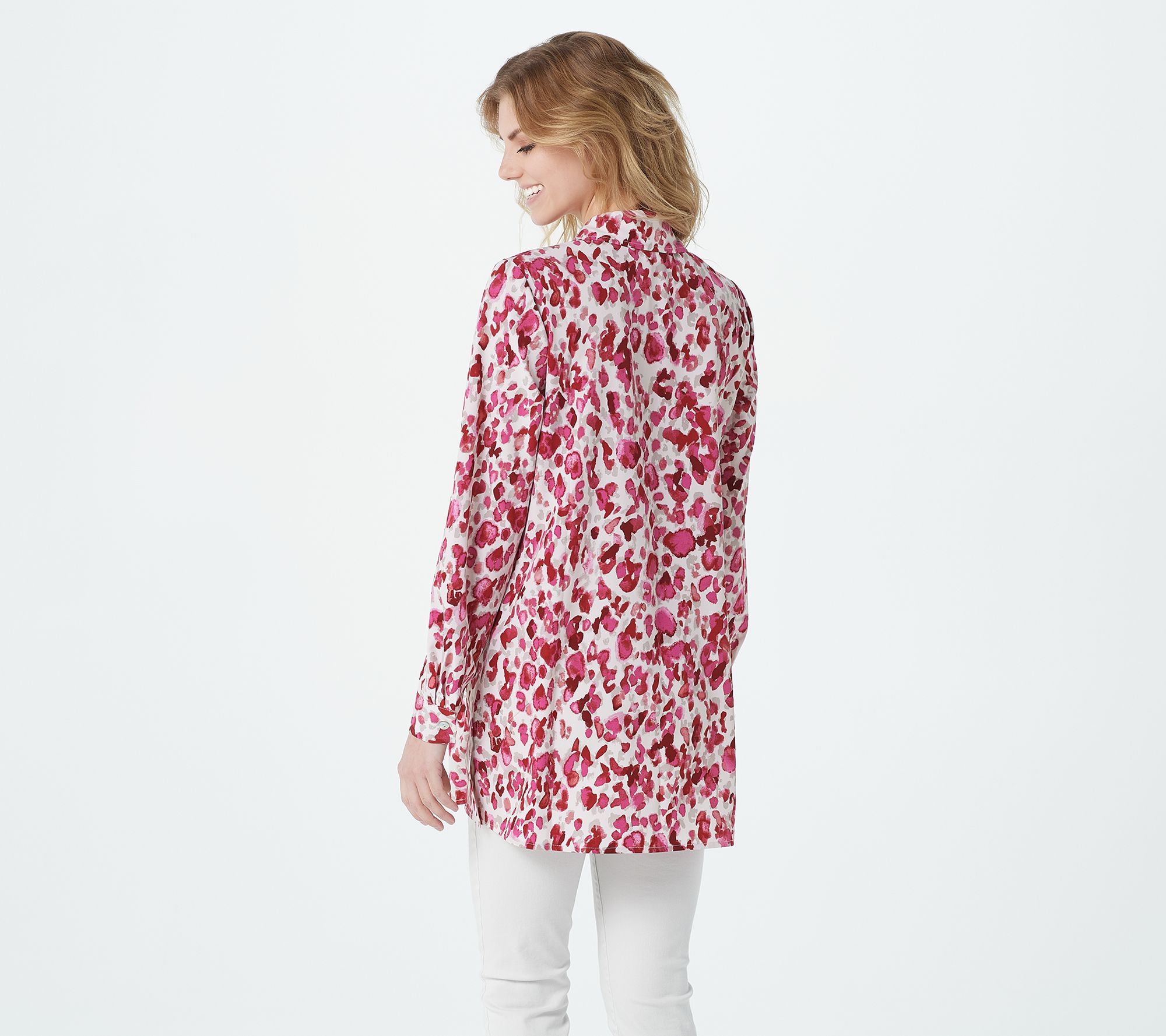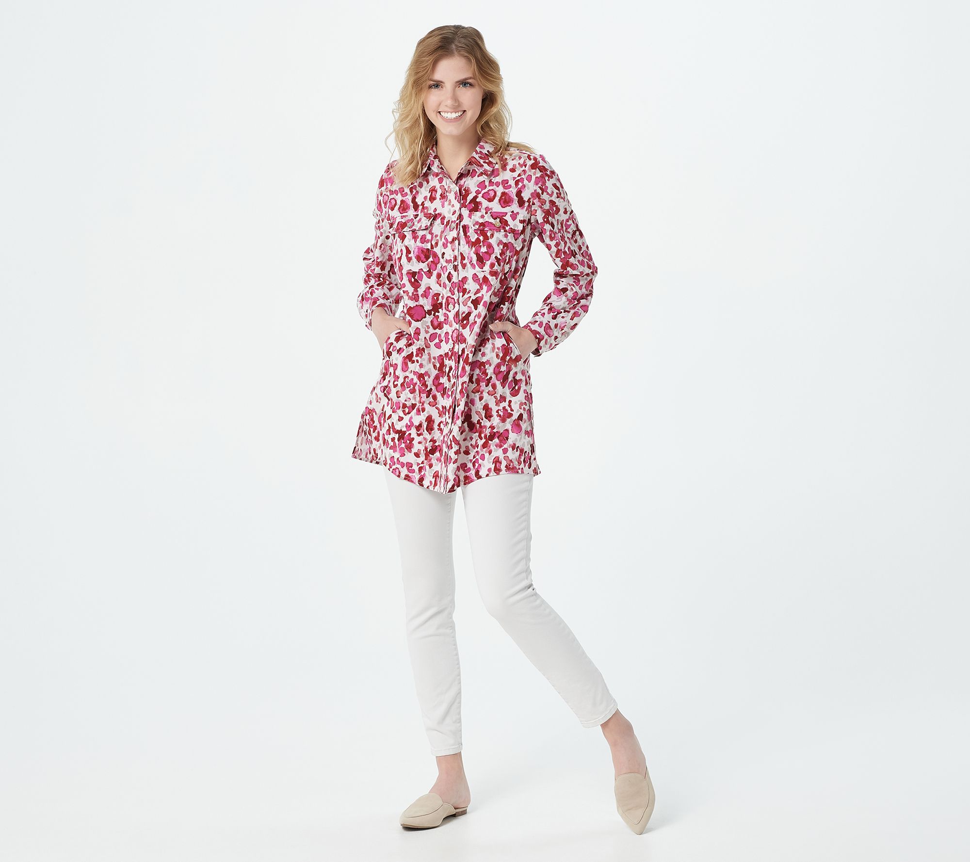 Play with pattern in this pretty printed duster -- the perfect on-trend staple that works year round. From Susan Graver.