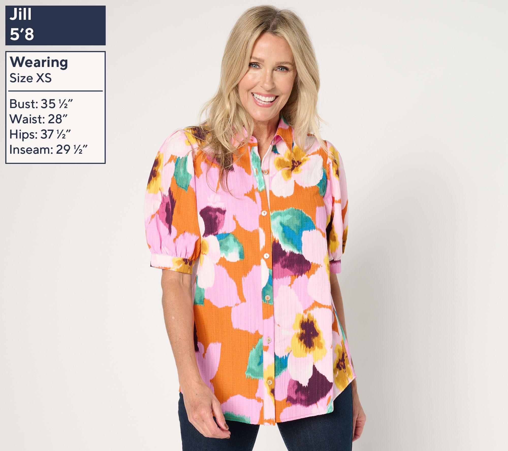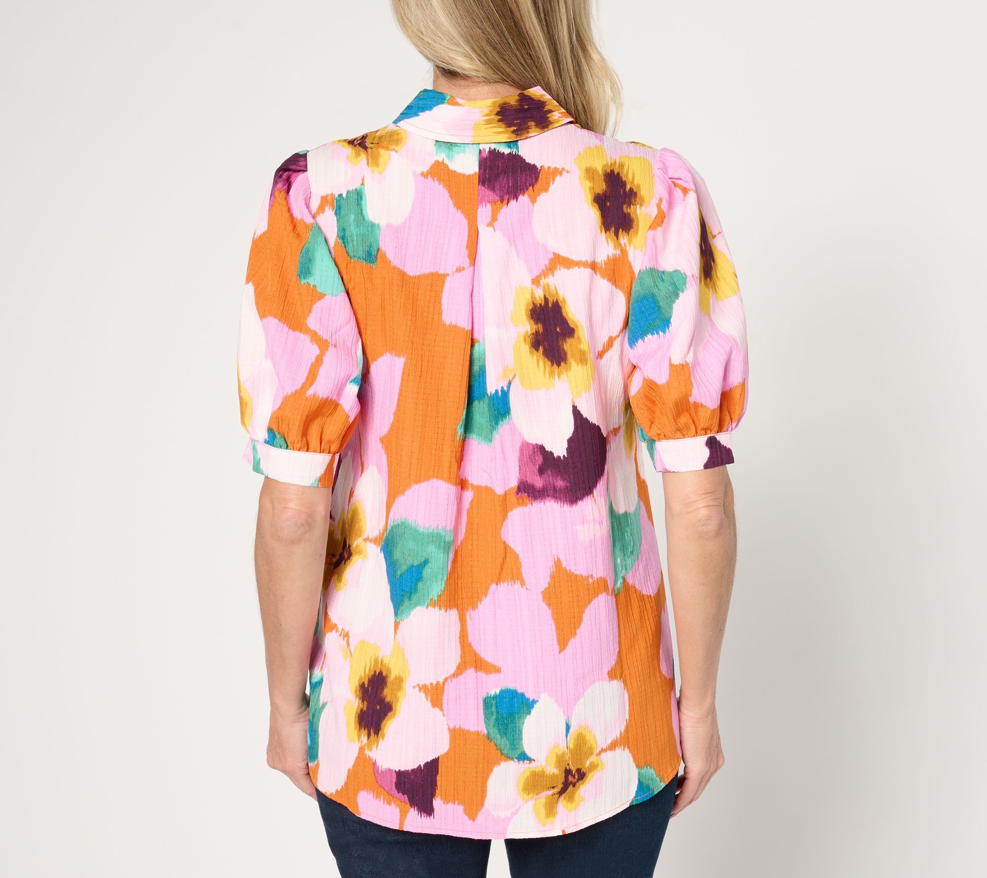 A little bit polished, a little bit relaxed, this woven button-front tunic combines pleated pouf sleeves and a showy print to create a memorable look. From Susan Graver.