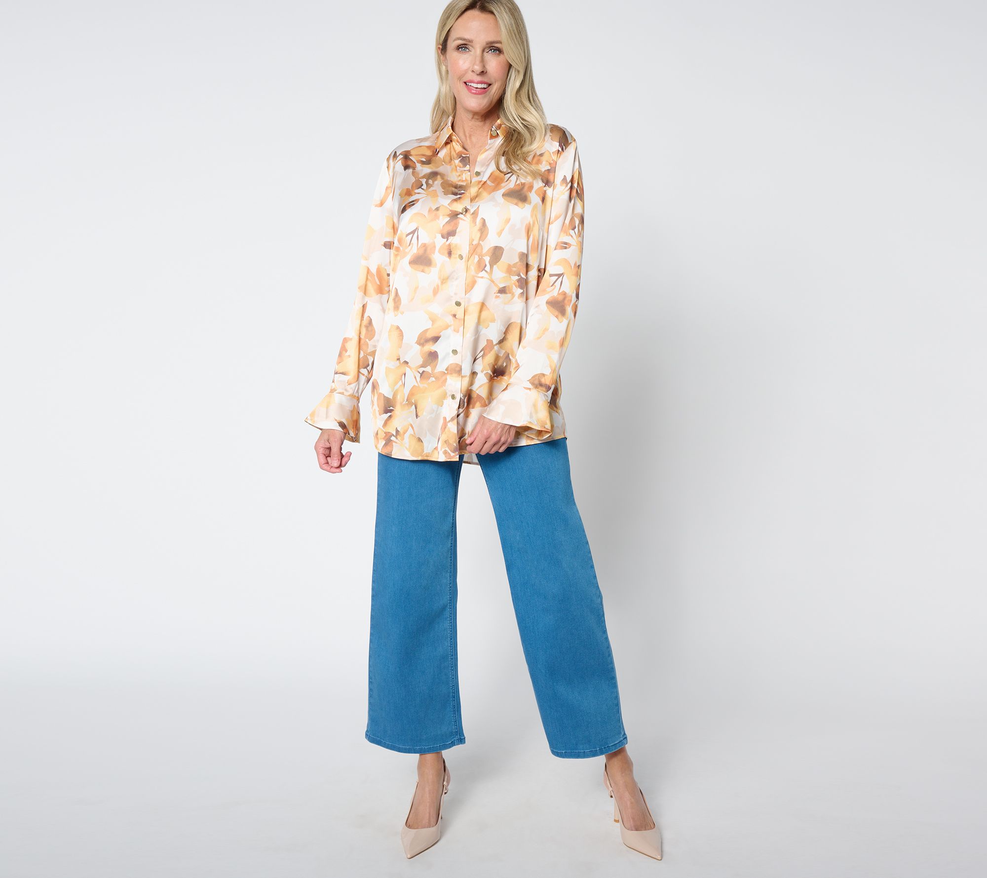 There's something just so perfect about this printed charmeuse top. Is the muted yet notice-me print? The just-right length? The flirty flounce cuffs? Or the splash of stretch? Hmmmm.... maybe it's allll the things. We'll take it in allll the colors. From Susan Graver.