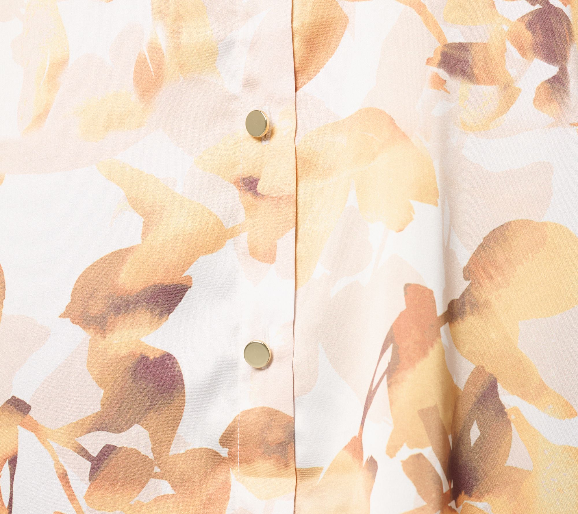 • Features: collar, button front closure, allover print, long sleeves with flounce cuff, inverted box pleat at back yoke, shirttail bottom hem