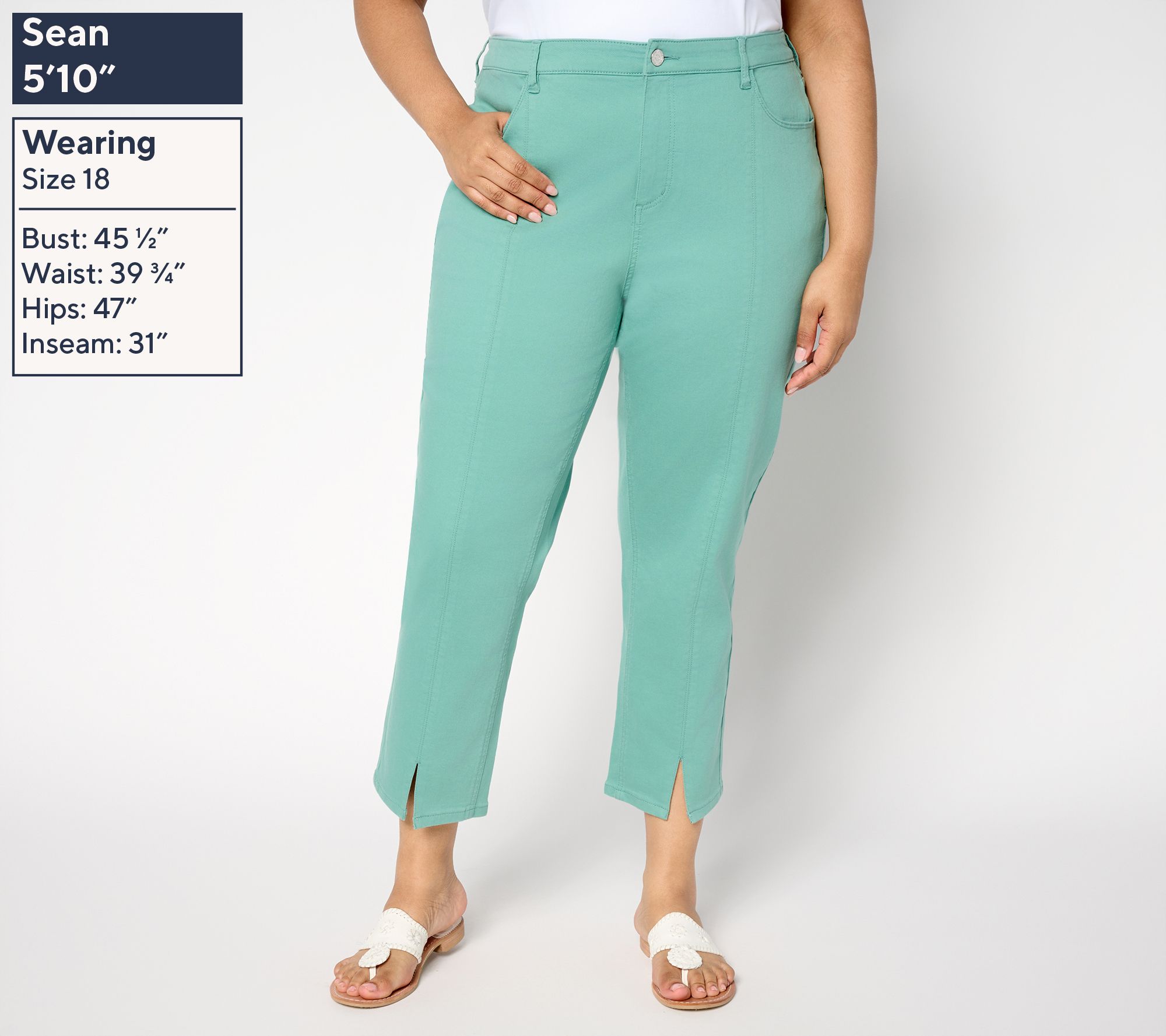 • Features: ankle length, two-piece contour waistband with belt loop, front scoop pockets, back angled patch pockets, front seam with single needle stitching, slit at front leg opening