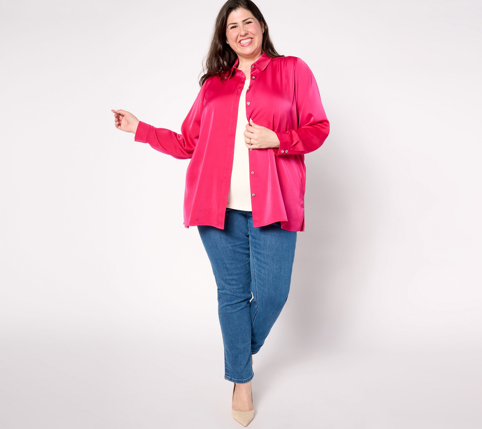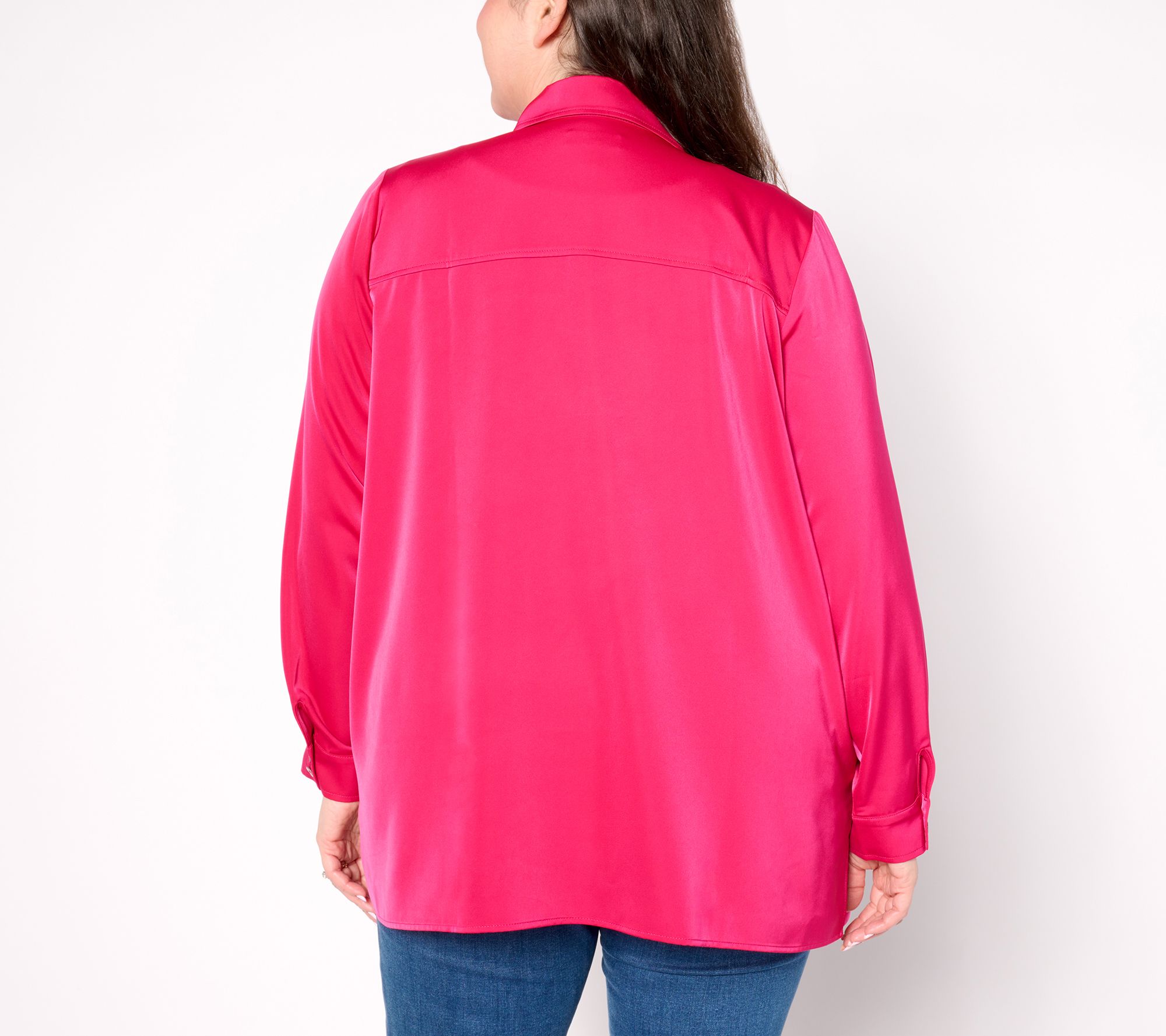 A stretch satin fabrication elevates this shacket and takes it up a few notches. Combining comfort and style, it can be layered over all your favorite tanks and tees. From Susan Graver.