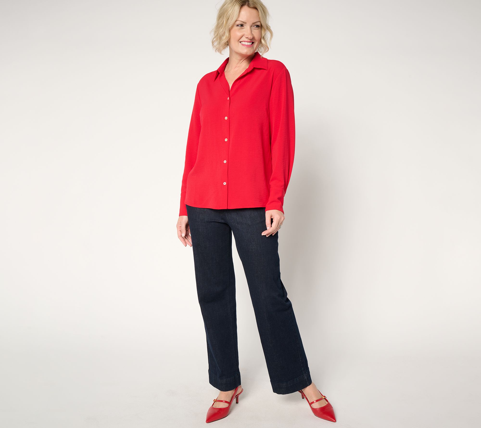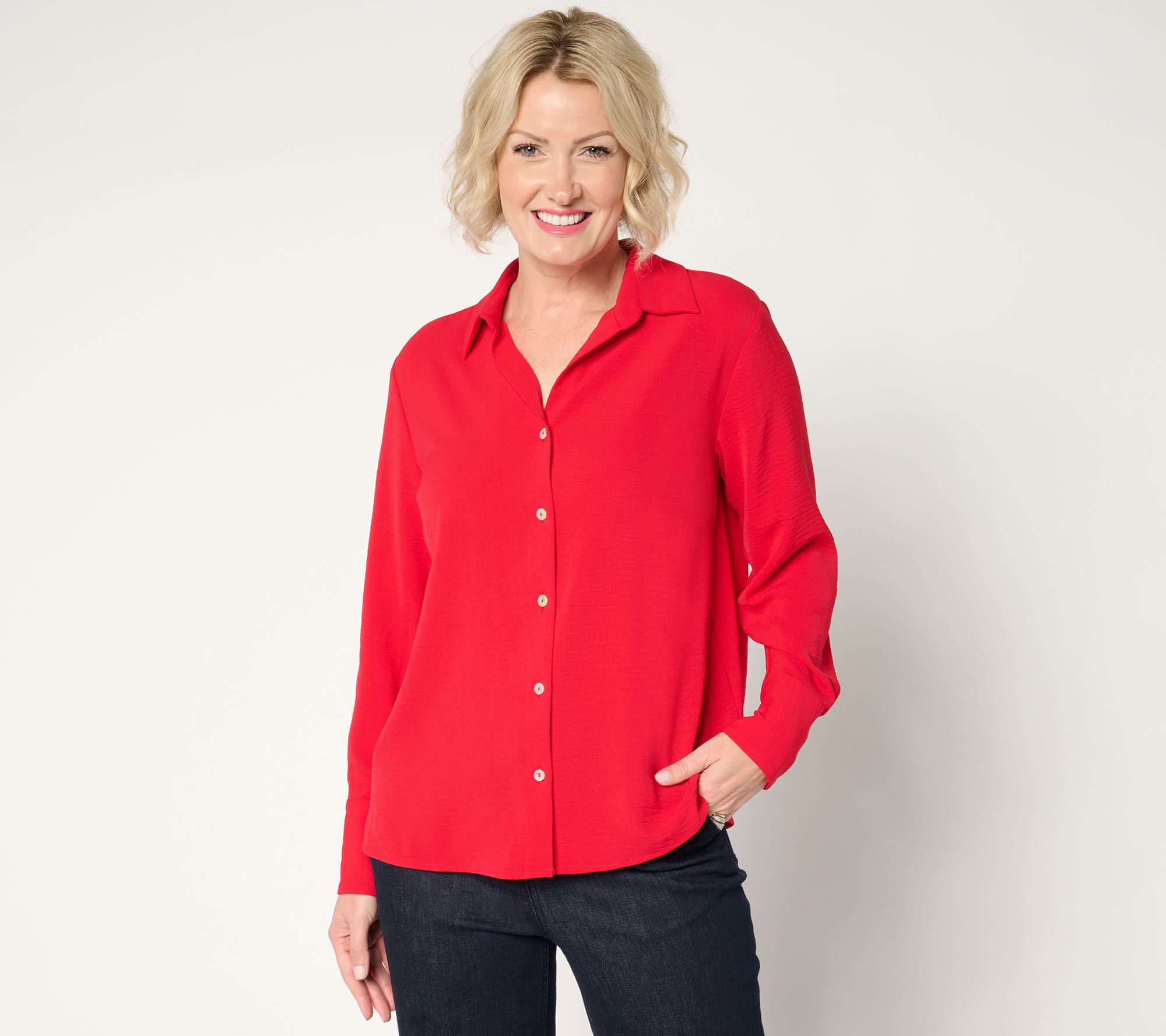 Take a stroll through downtown or head to a cafe brunch with friends in this breezy St. Tropez woven shirt. A crisp collar and button-front design give it a polished look, while drapey fabrication achieves that certain je ne sais quoi. From Susan Graver.