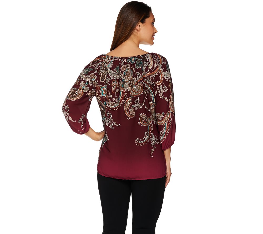Every woman needs something breathtaking in her closet--like this Feather WeaveTM fabric peasant top by Susan Graver. A mesmerizing allover print is what truly defines this piece. Raglan 3/4-length sleeves with elasticized cuffs, and a tie and tassel detail at the keyhole neck heighten its drama. From Susan Graver.