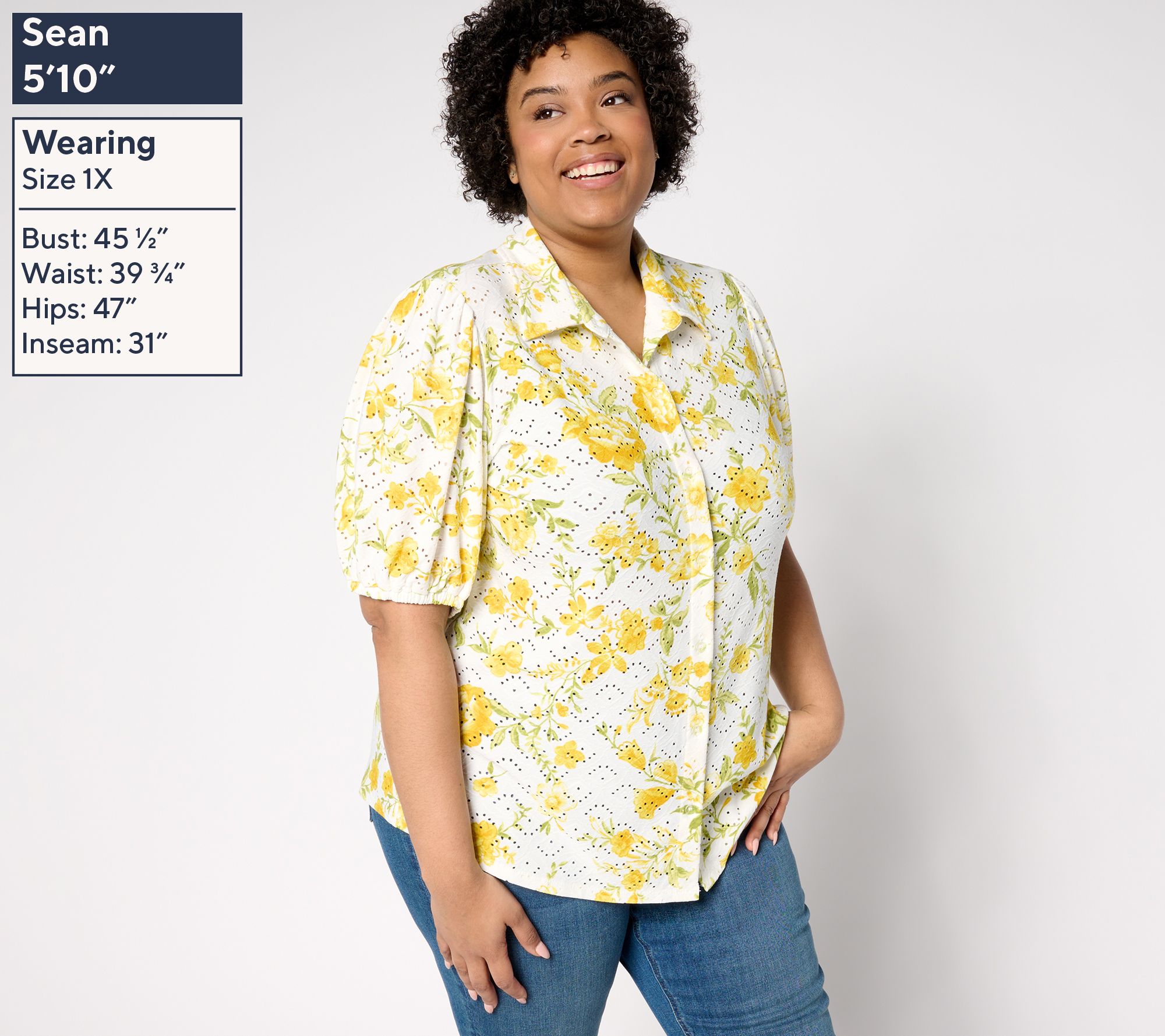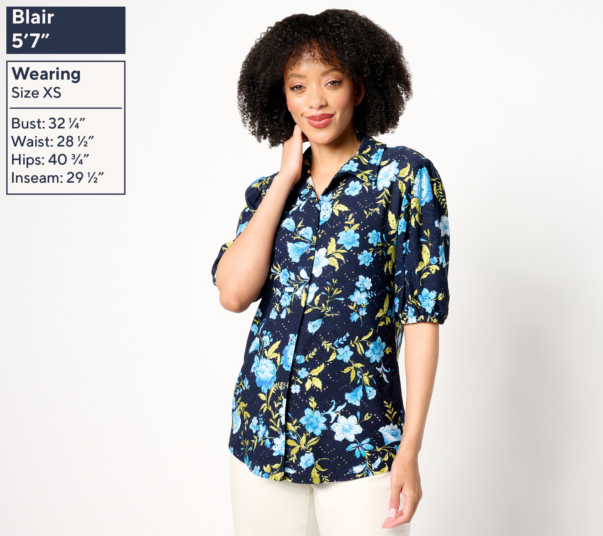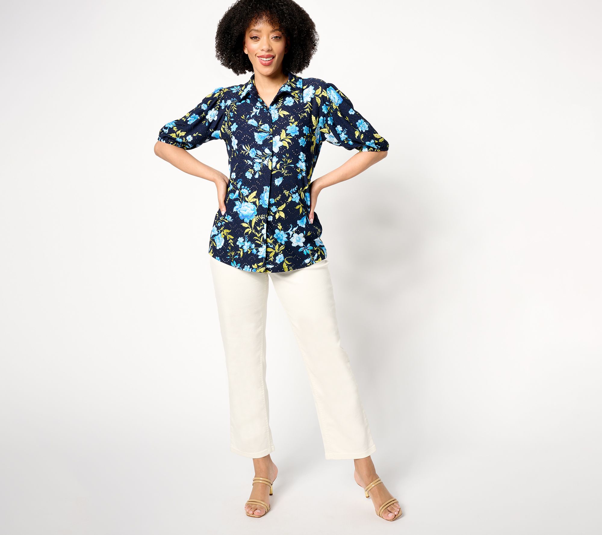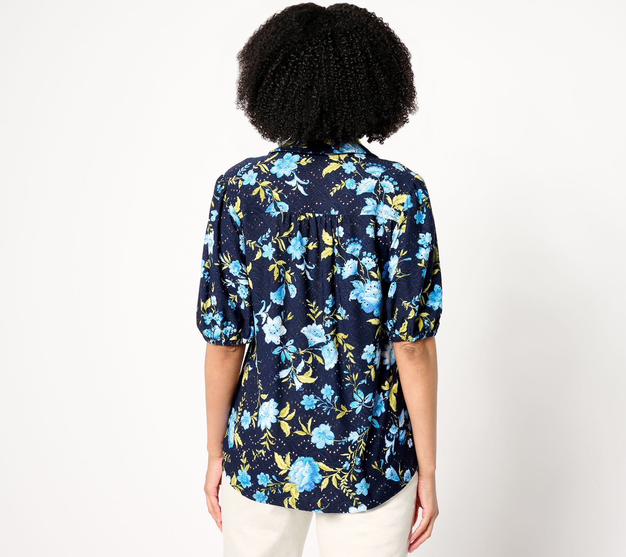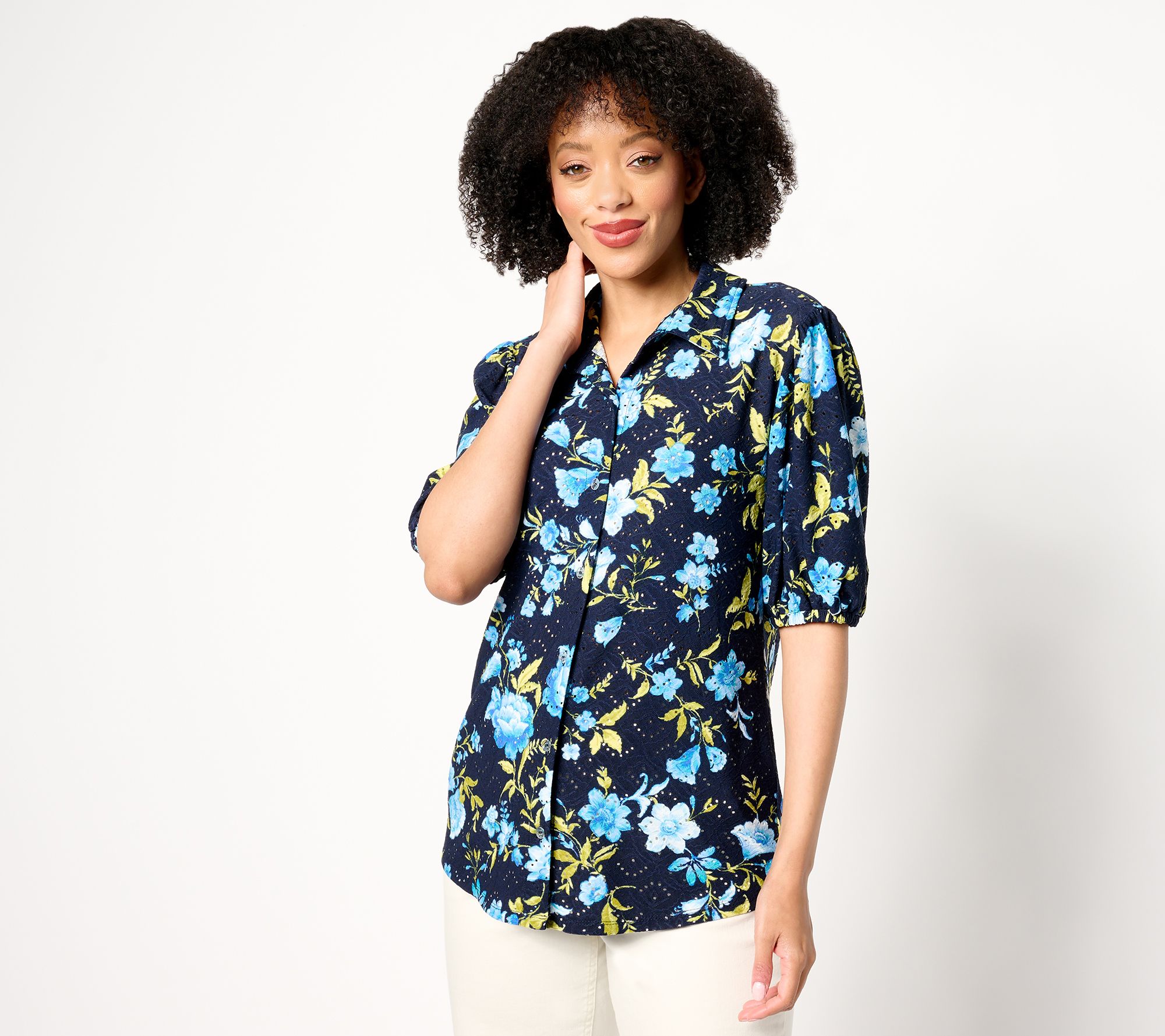 "As Is" Susan Graver Printed Knit Eyelet Button Front Puff Sleeve Top