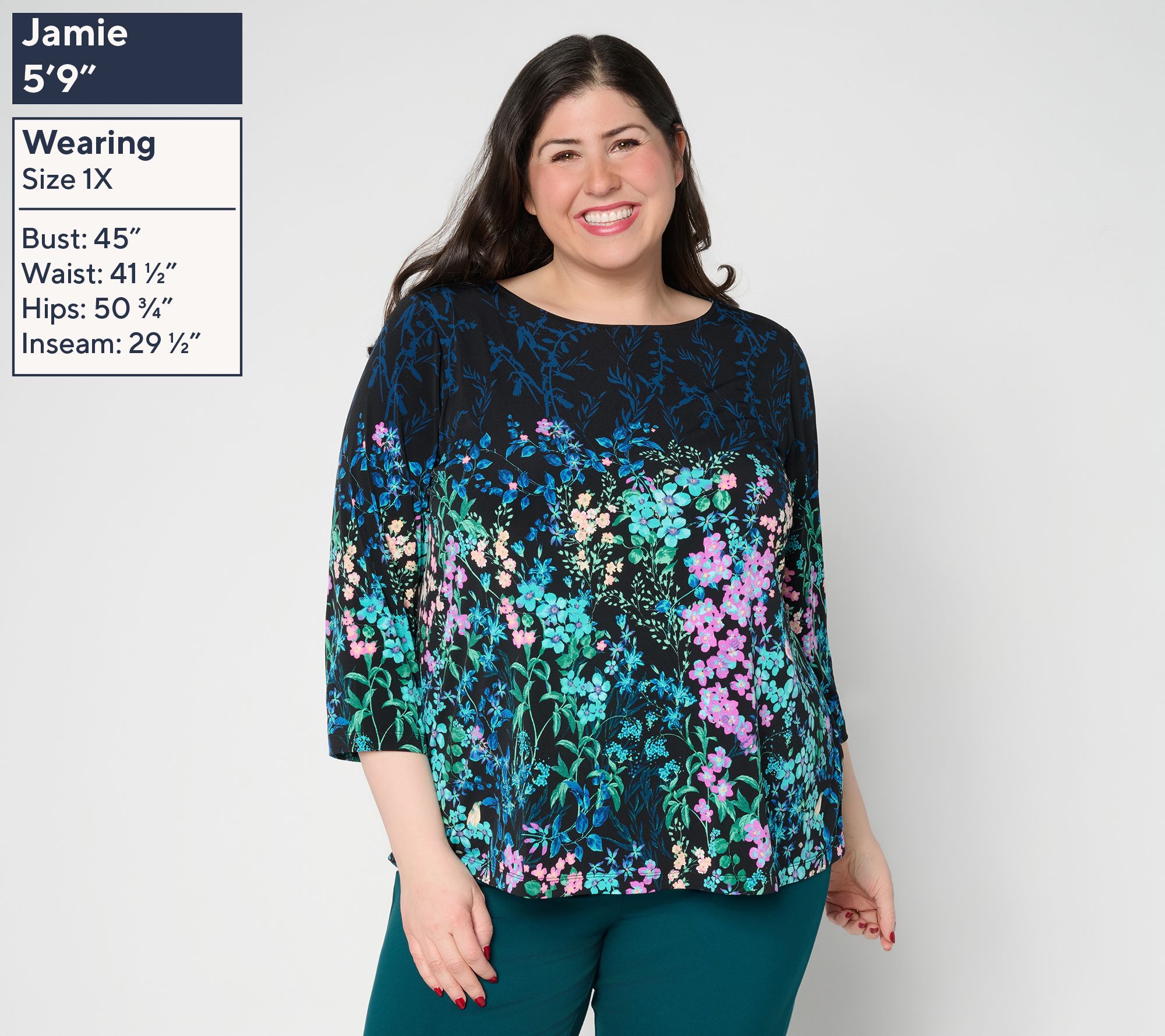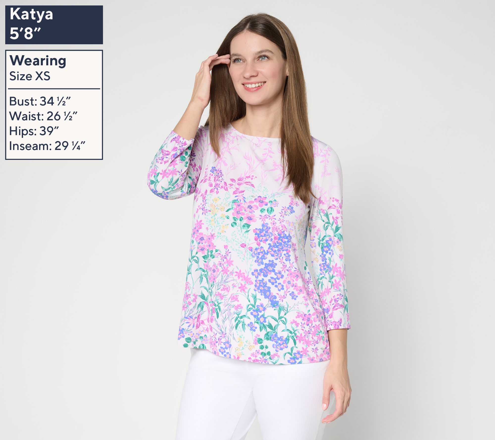 Bring along a bouquet of blossoms wherever you go! Whether you're meeting friends for coffee or heading out for an afternoon of errands, this printed A-line knit top brings a fresh pop of color and ease to every outing. The fluid Liquid Knit® drape and bateau neckline offer a figure-flattering silhouette with elegant movement, while 3/4-length sleeves and a pullover style make it a breeze to wear from season to season. From Susan Graver.