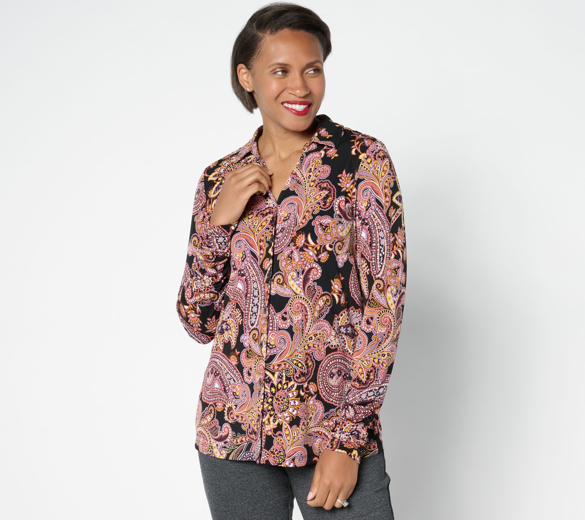 This must-have button-front top splashed with a paisley print and fresh ruching at the sleeves is enough to grab our attention. But add in Liquid Knit®? This fab find went from must-have to need (right) now. From Susan Graver.