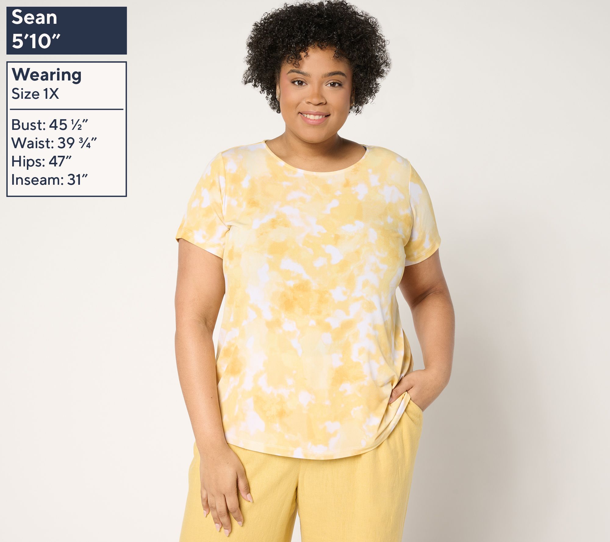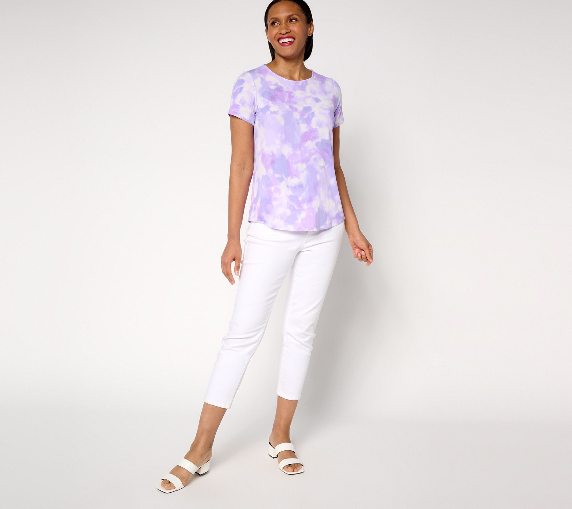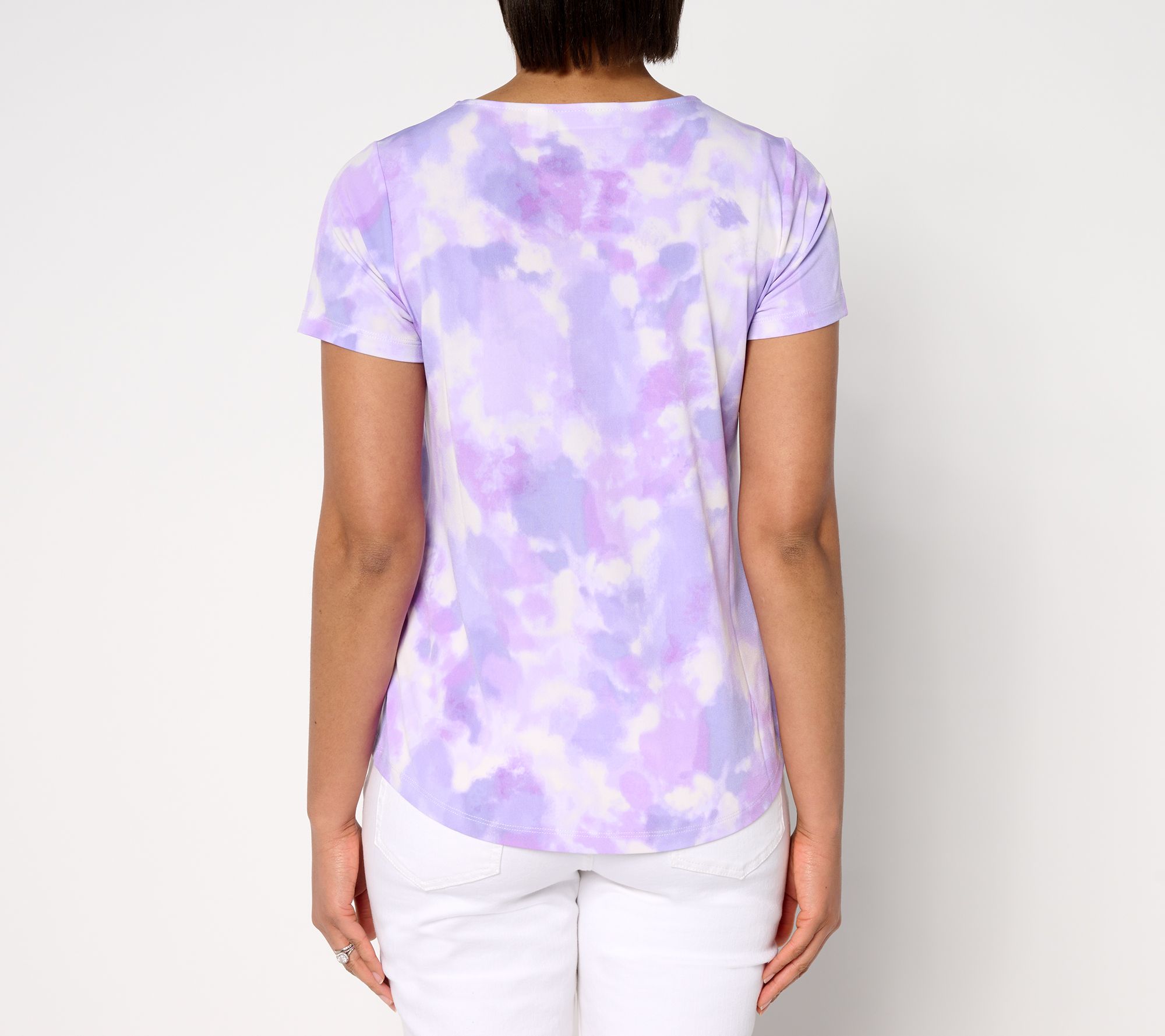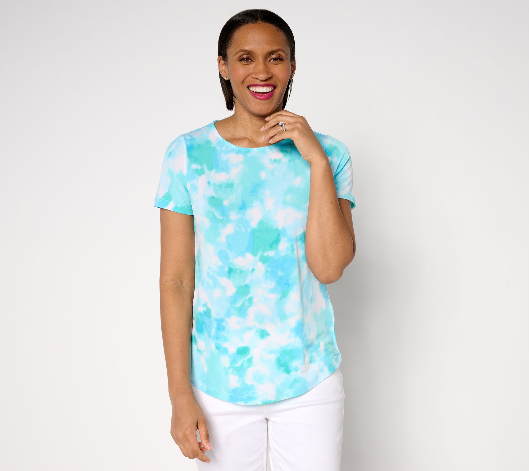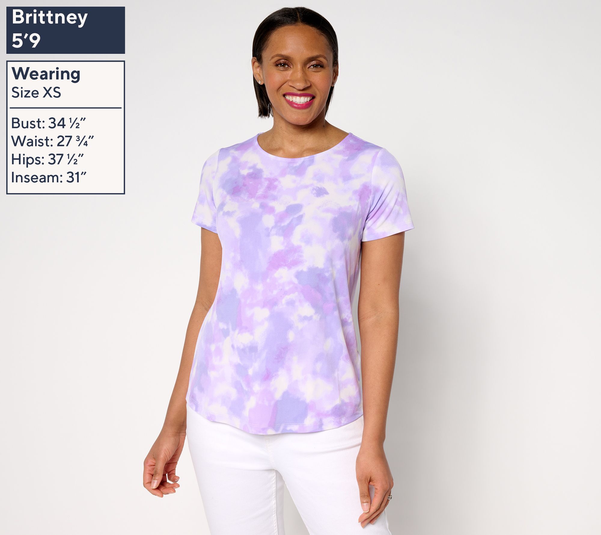 Style or comfort? Comfort or style? Why not both?! For those days when you want a balance of notice-me fashion paired with a comfy fit and feel, this cap-sleeve crewneck top is the answer. Featuring a playful printed design on soft Liquid Knit®, it's perfect for everything from brunch with friends to casual Fridays at the office. From Susan Graver.