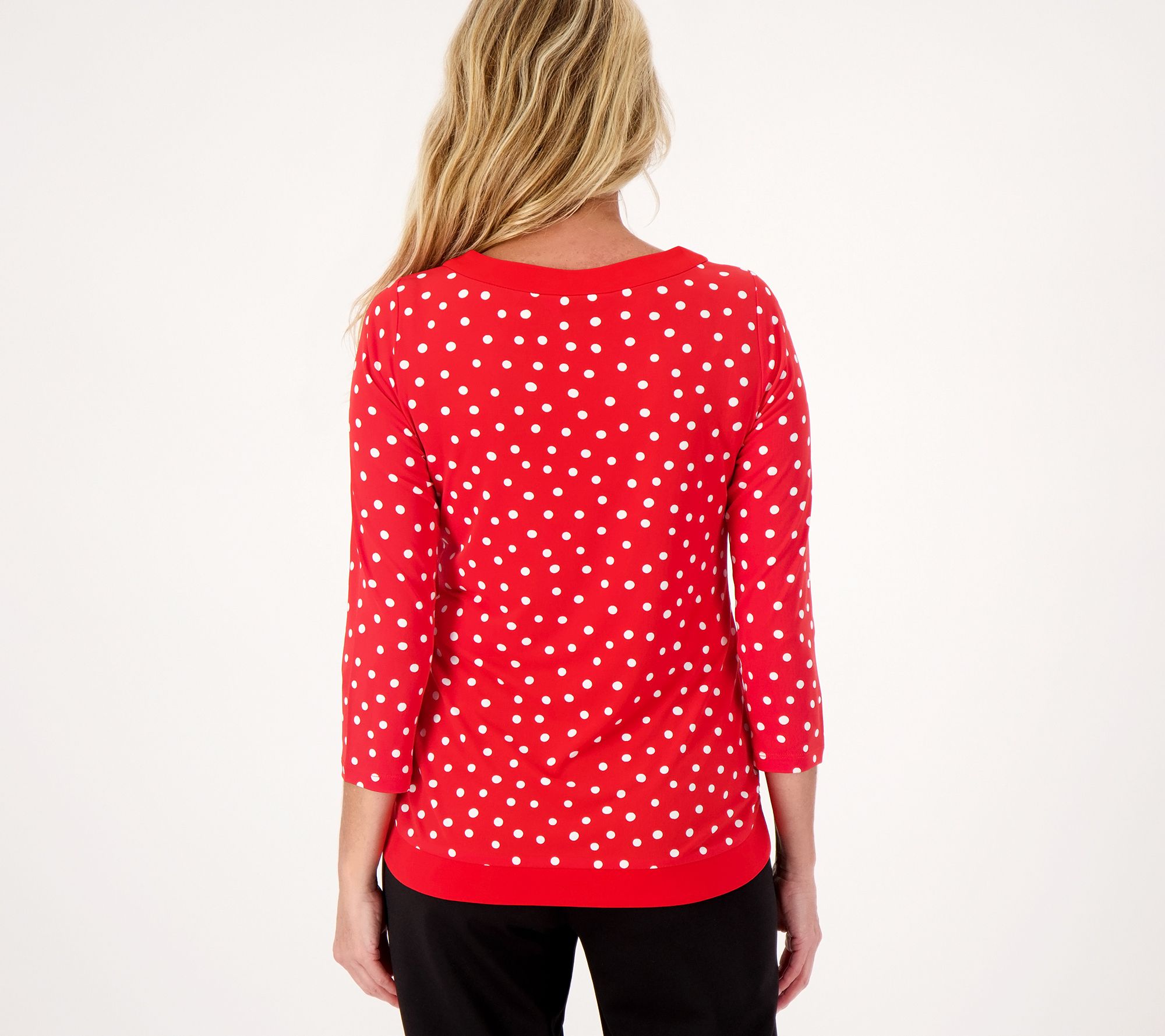 • Features: color block pattern, 3/4-length sleeves, solid neck and bottom banding, tulip-shaped hemline
