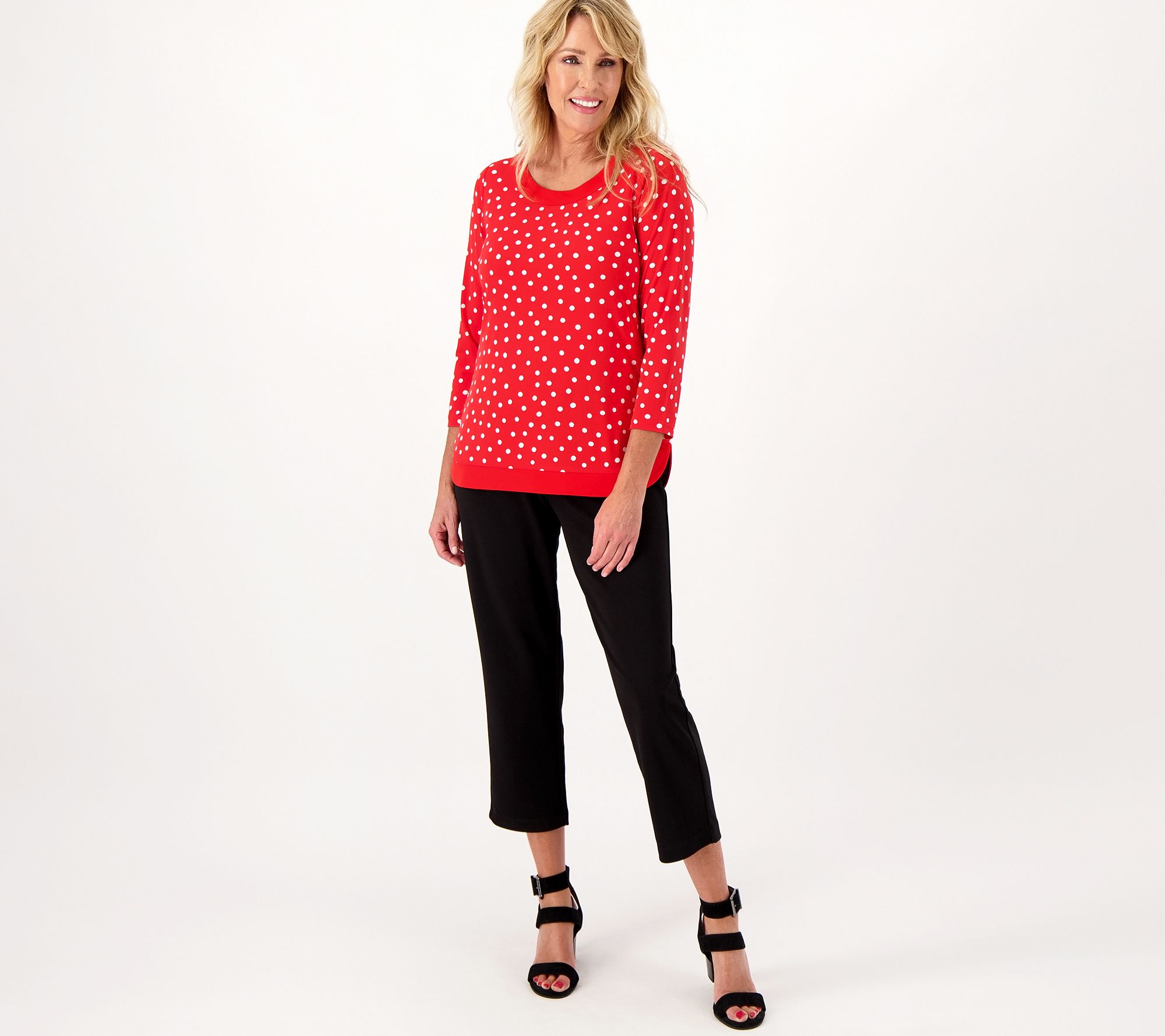 A fun colorblock pattern gives this tulip-hem tunic a vibrant look that goes great with ankle-length jeans and heels. From Susan Graver.