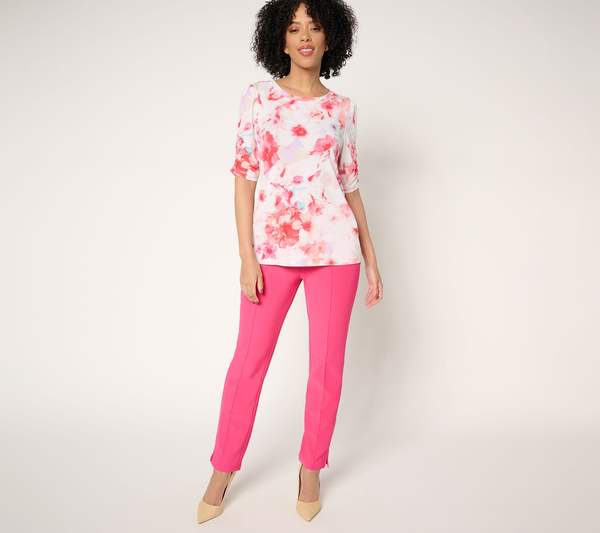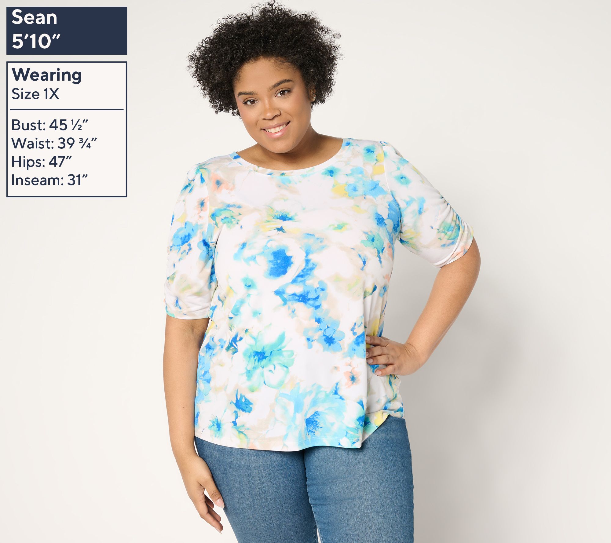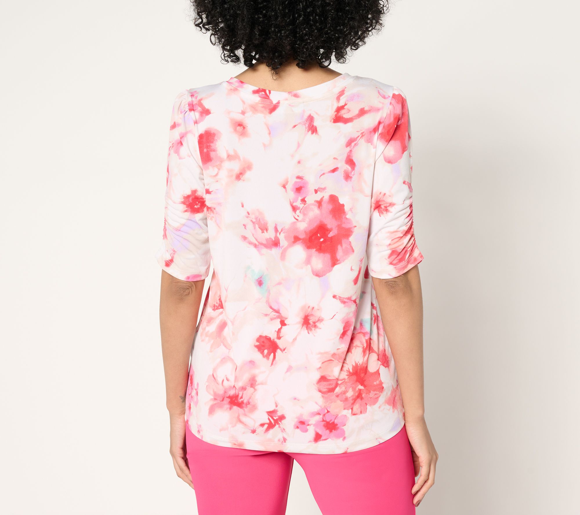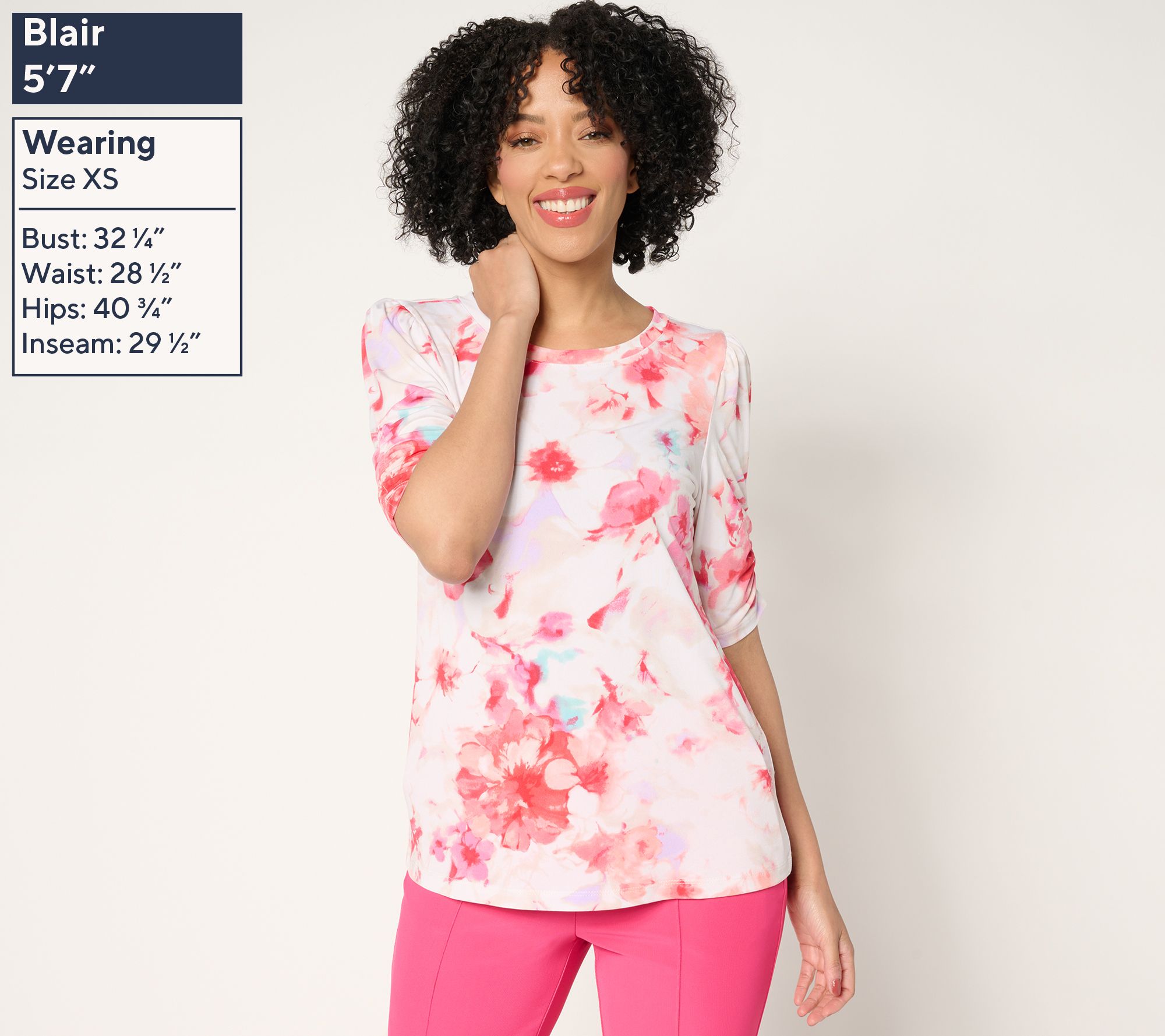 "As Is" Susan Graver Printed Liquid Knit Crew Neck Top w/Ruched Sleeve