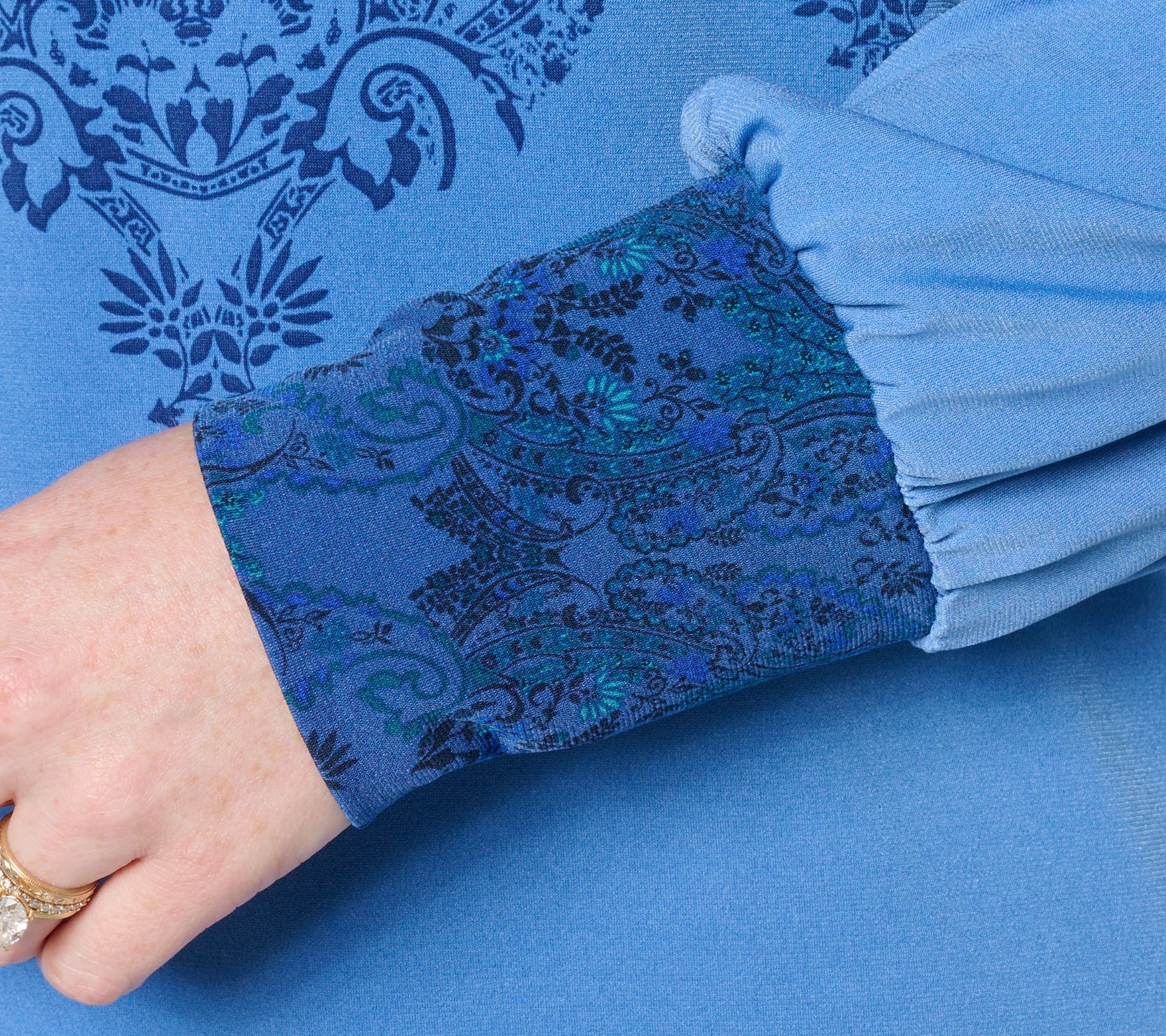 • Features: mock neckline, placement print on collar and upper bodice, shirred sleeve cap, full blouson long sleeves with printed shirred cuffs, straight hem, pullover style