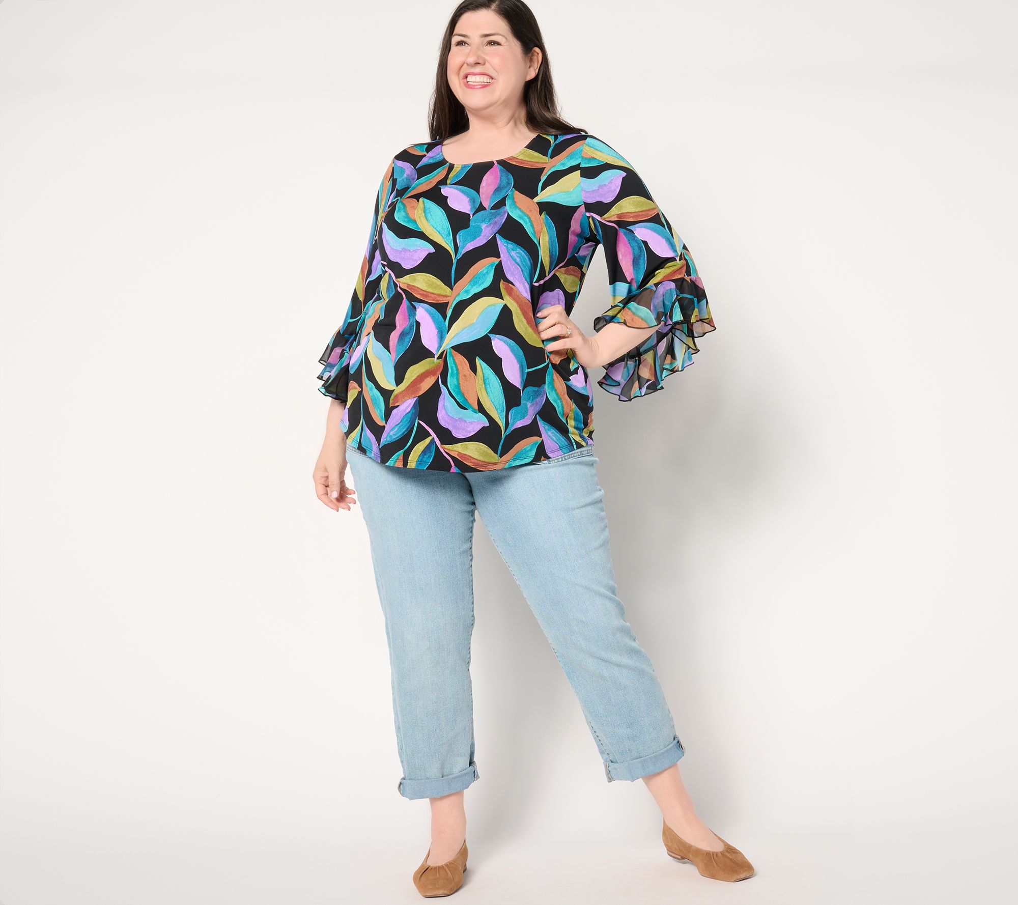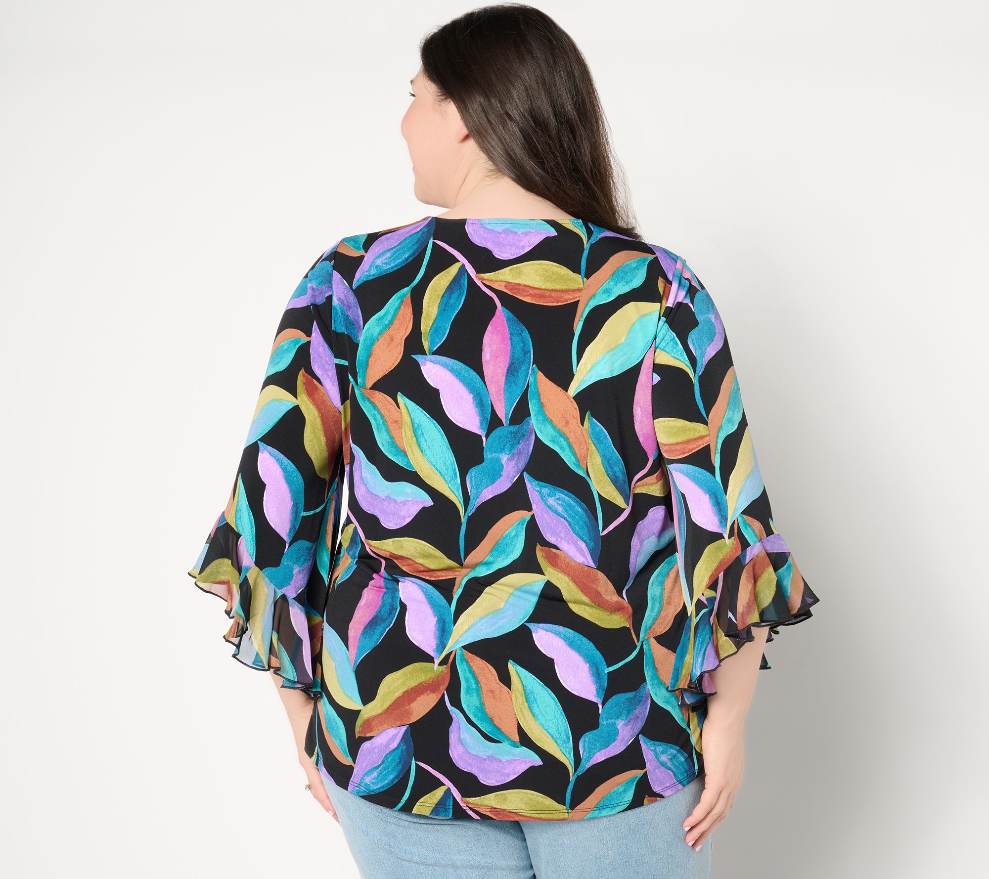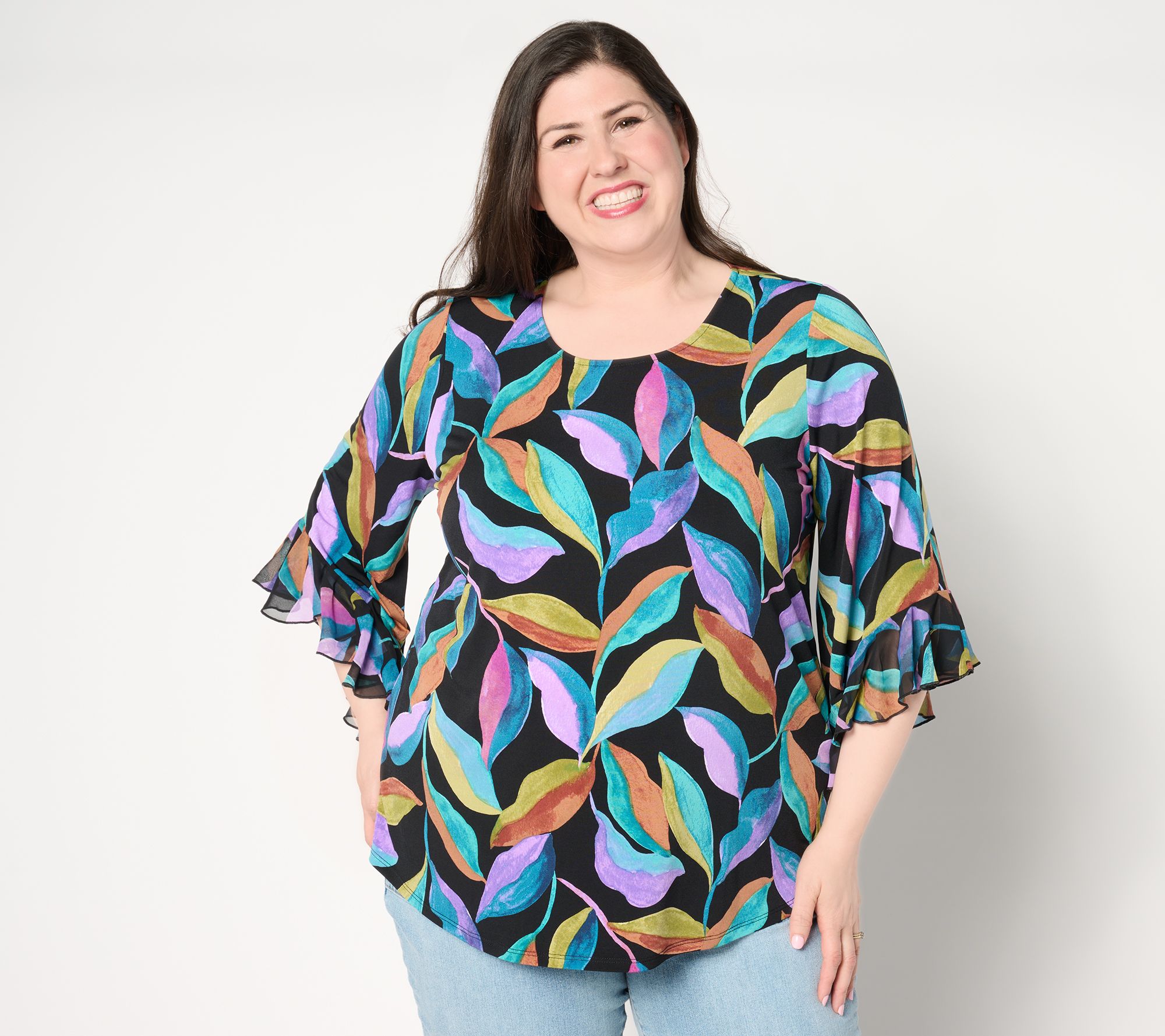 "As Is" Susan Graver Printed Liquid Knit Scoop Neck Top w/ Ruffle