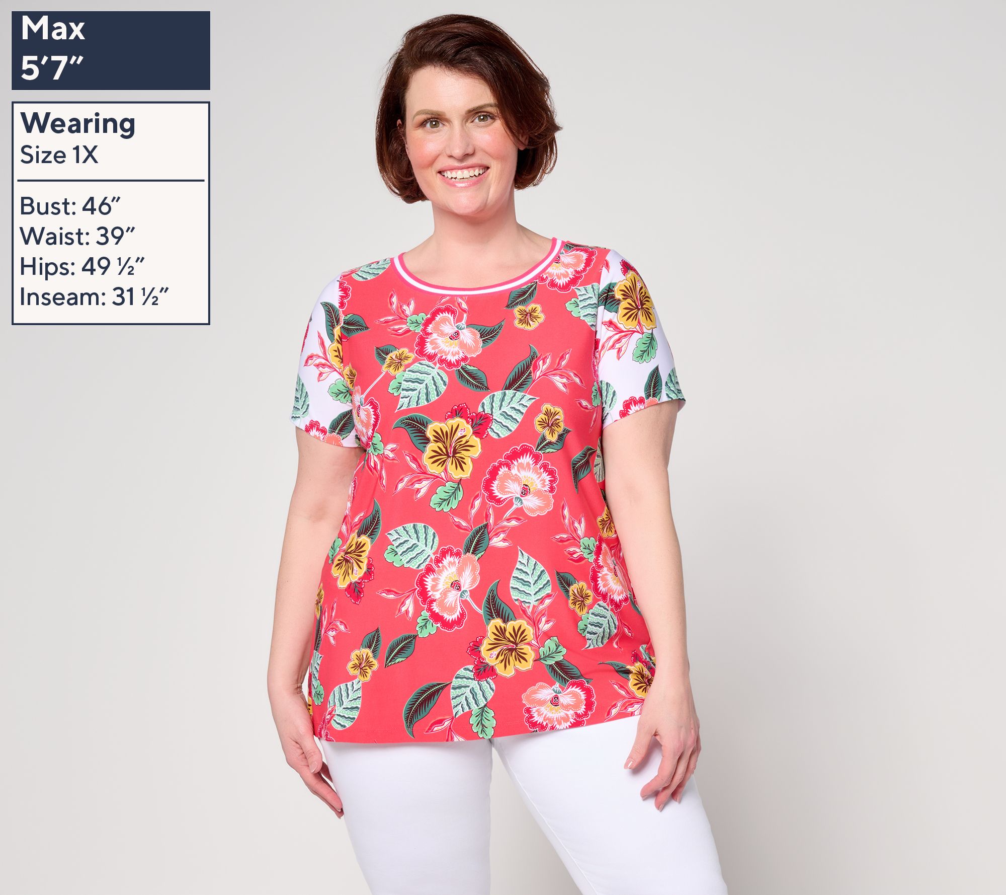 • Features: combo print short sleeves, crew neckline with novelty stripe rib trim, straight bottom hem, pullover style