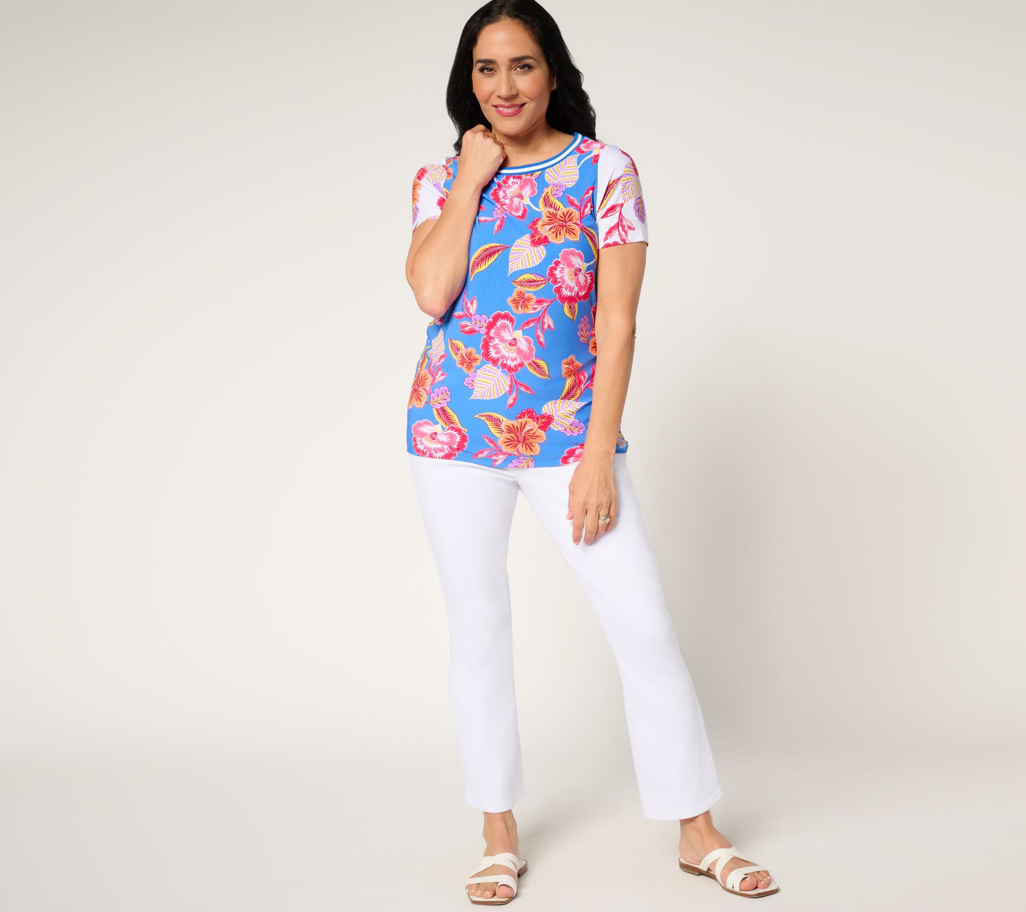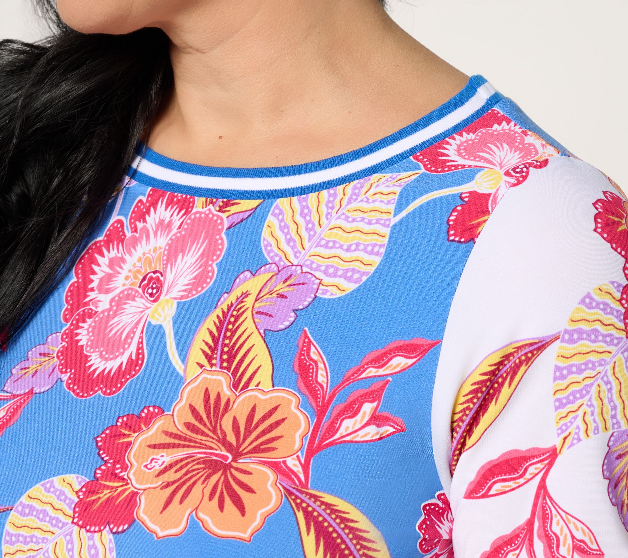 Bring bold energy to your lineup with this printed Liquid Knit® top from Susan Graver. The mix of cheerful prints and sporty ribbed trim at the crew neckline gives it a fun, casual vibe -- perfect for everything from brunches to after-work hangouts. Pull it on with sleek jeans or crisp shorts and let the combo print sleeves do the talking. From Susan Graver.
