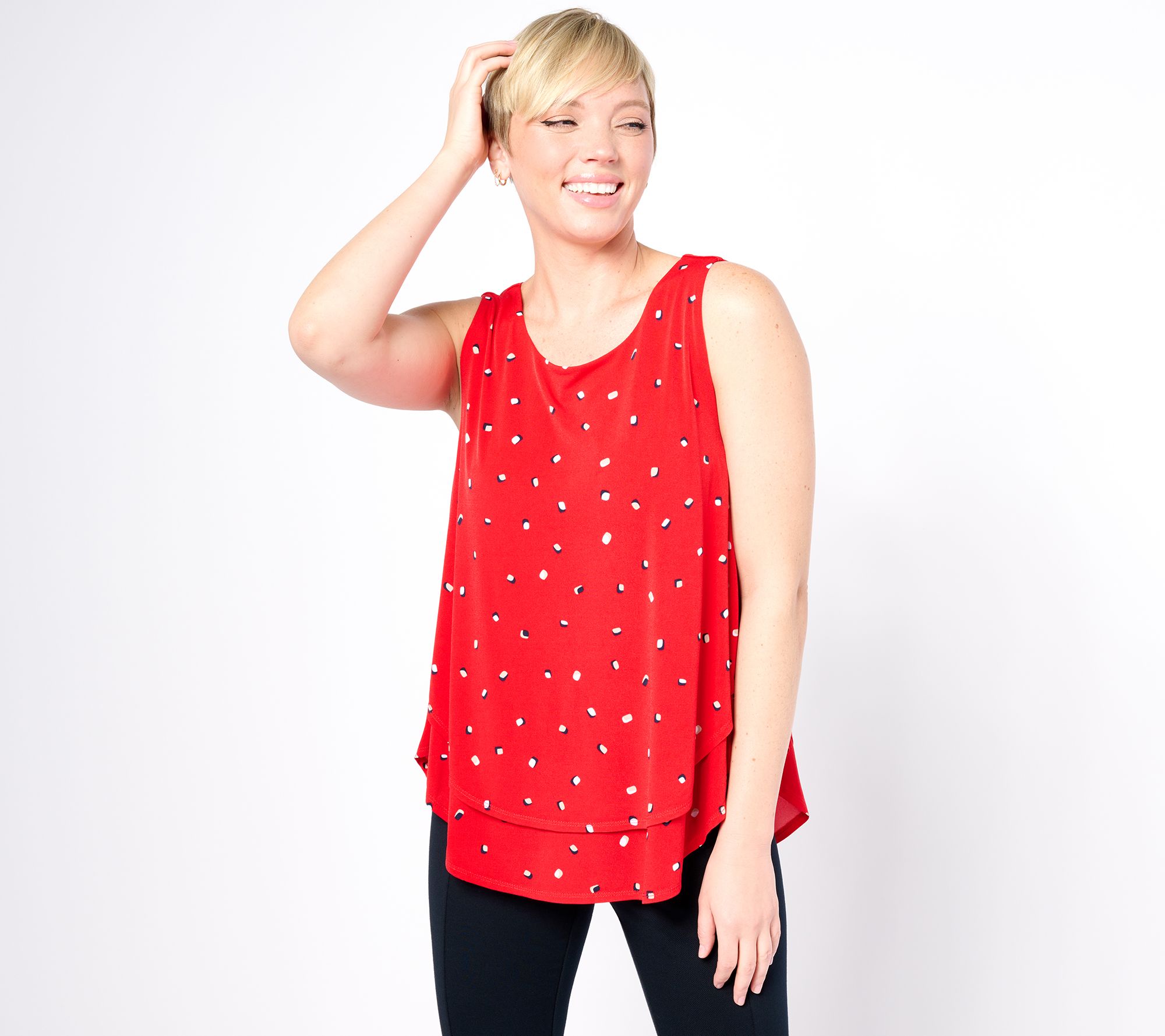 Three cheers for this two-tiered top that's fashioned in fabric-favorite Liquid Knit®! Its feminine flouncy style and pretty print is perfect for summertime celebrations from Father's Day brunches to Fourth of July picnics. And it's ready to go beyond the warm weather -- add a cozy layer on top of this sleeveless style staple and you're all set for cooler summer evenings and crisp autumn days. From Susan Graver.
