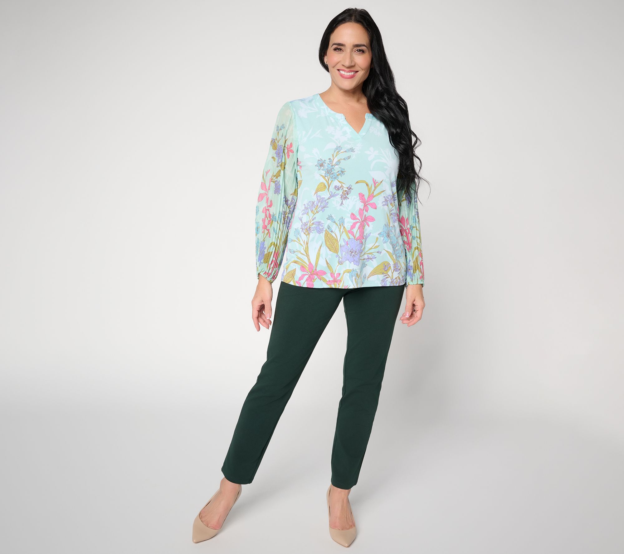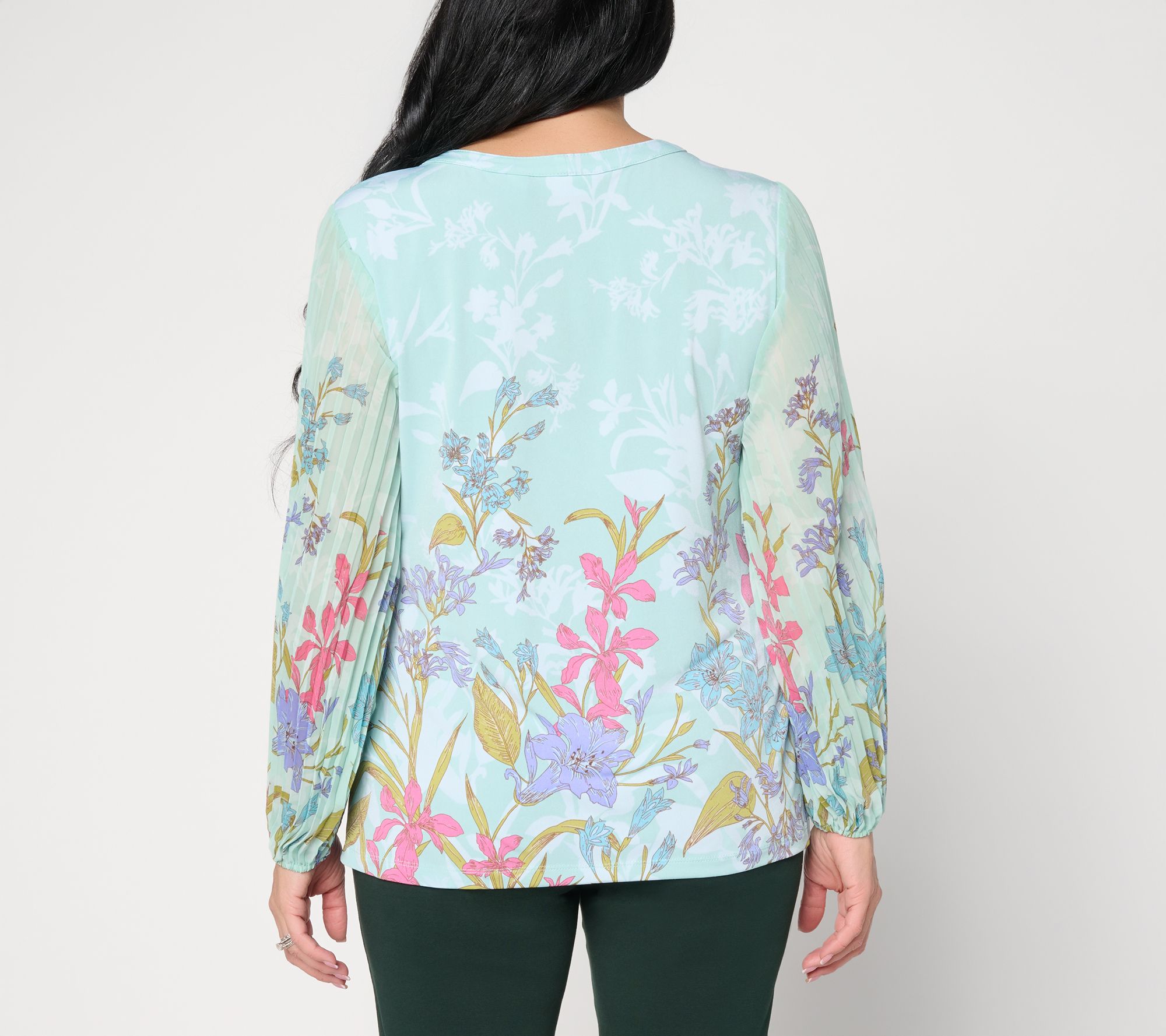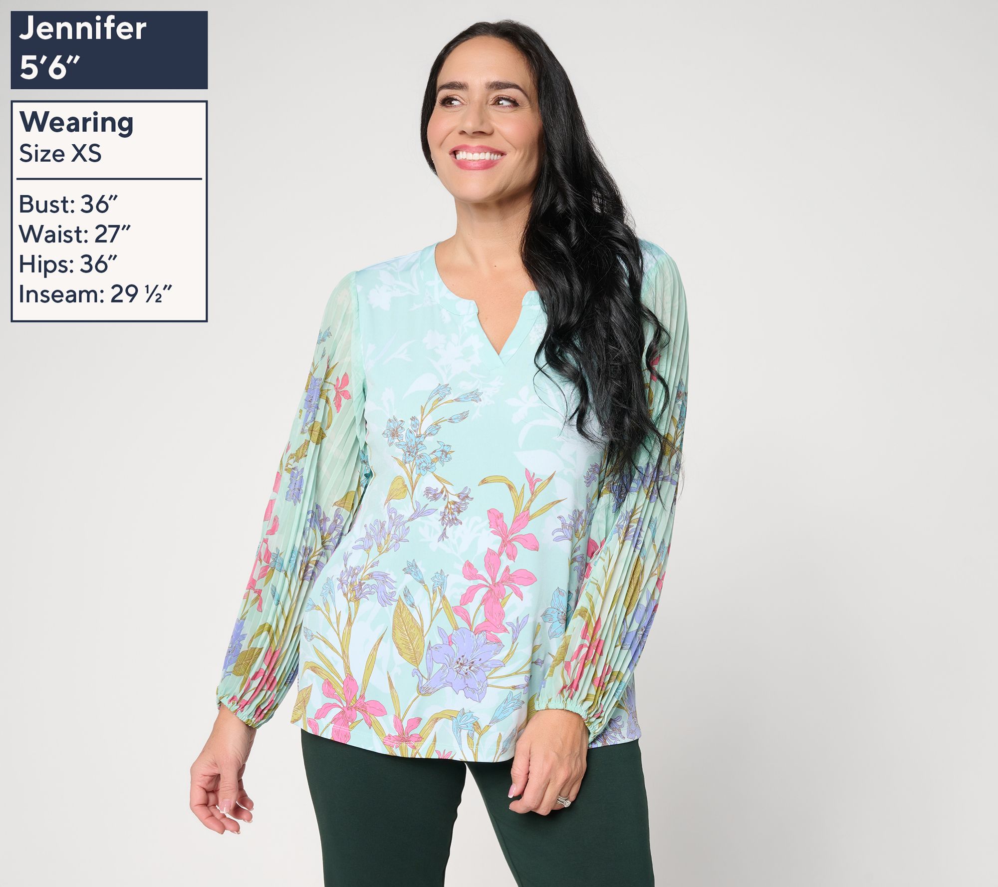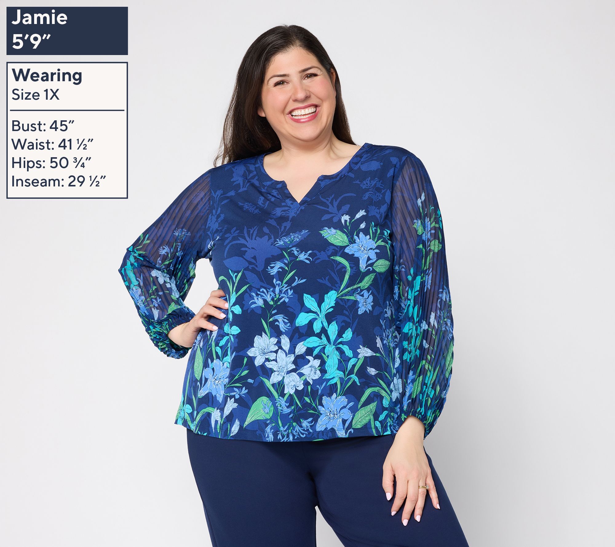 Weekend coffee dates and afternoon get-togethers call for a women's top that's all about versatile style and visual interest. This knit blouse stands out with a statement placed print and sheer, pleated sleeves that add an airy finish -- just right for pairing with classic pants or your favorite denim. From Susan Graver.