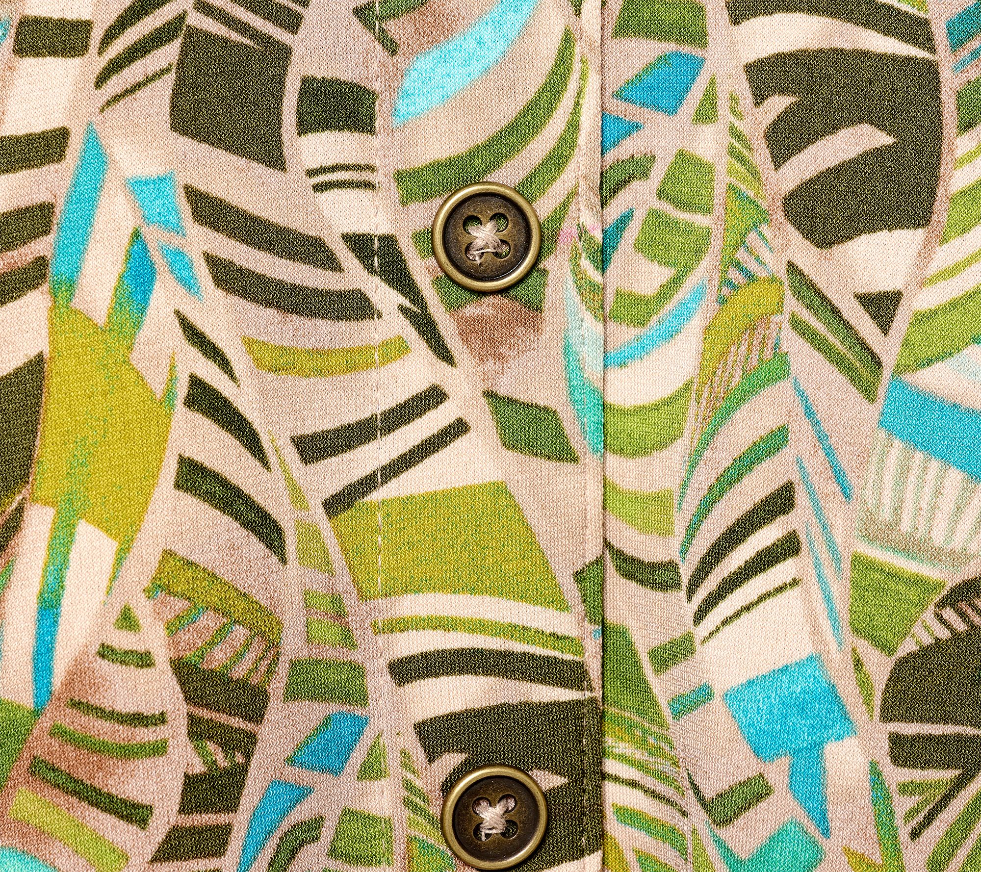 • Features: allover print, 3/4-length tab sleeves, button front, V-neckline, shirttail hem
