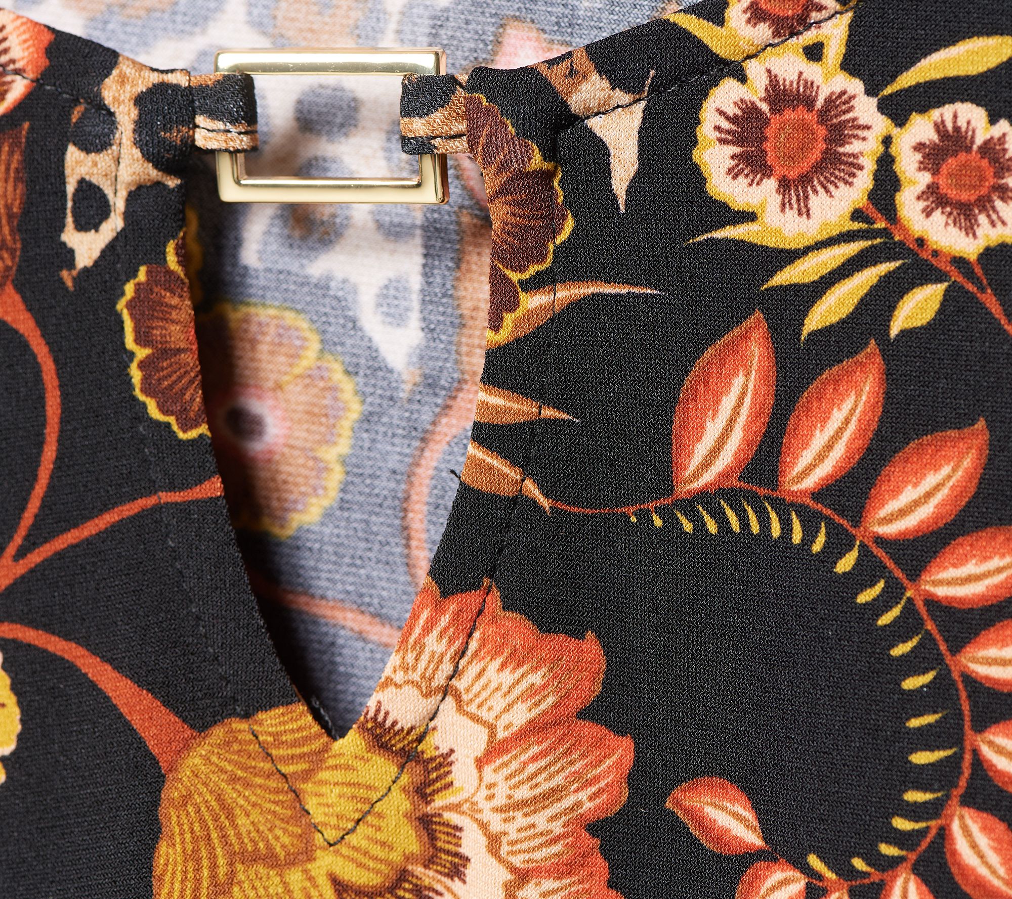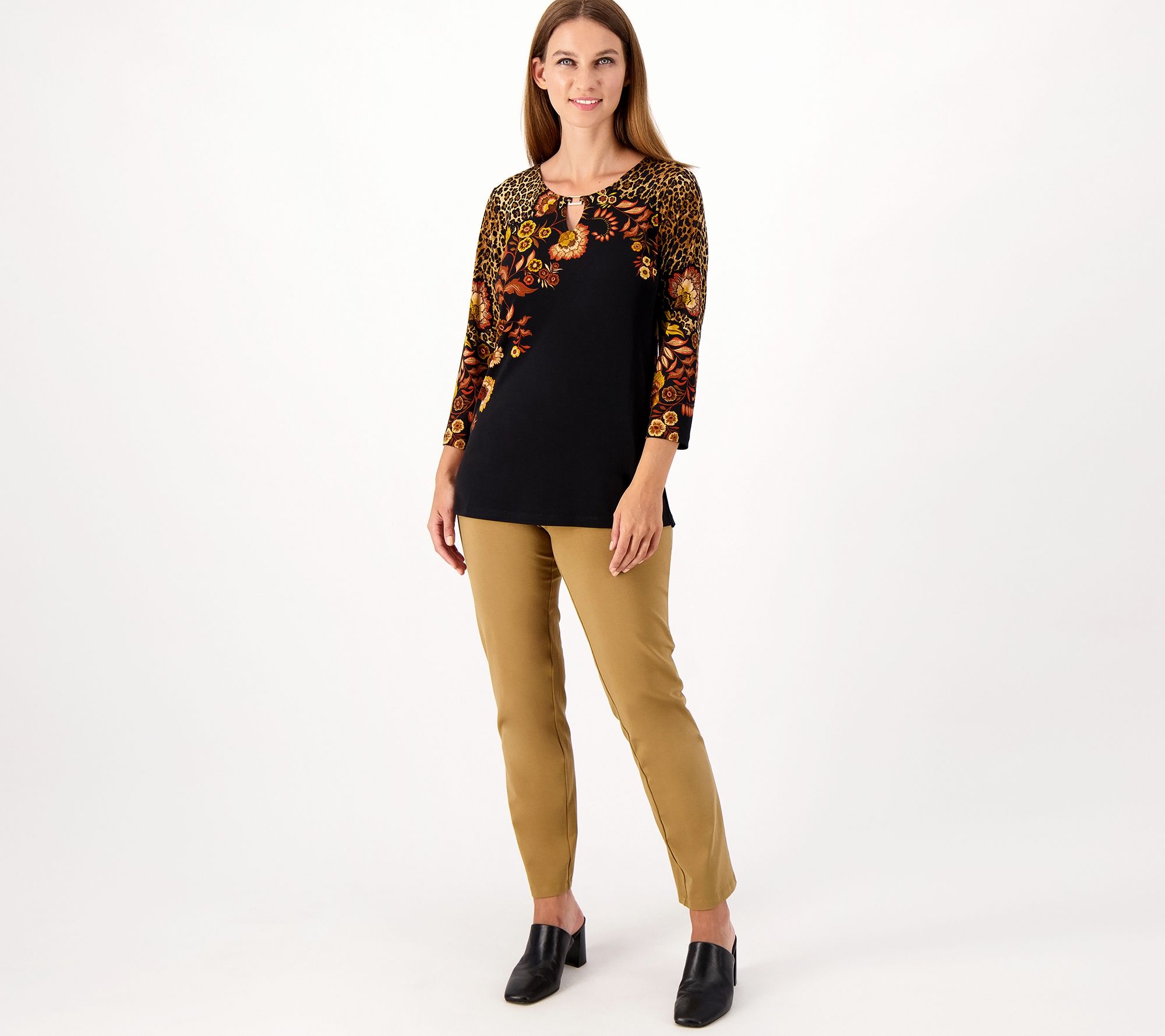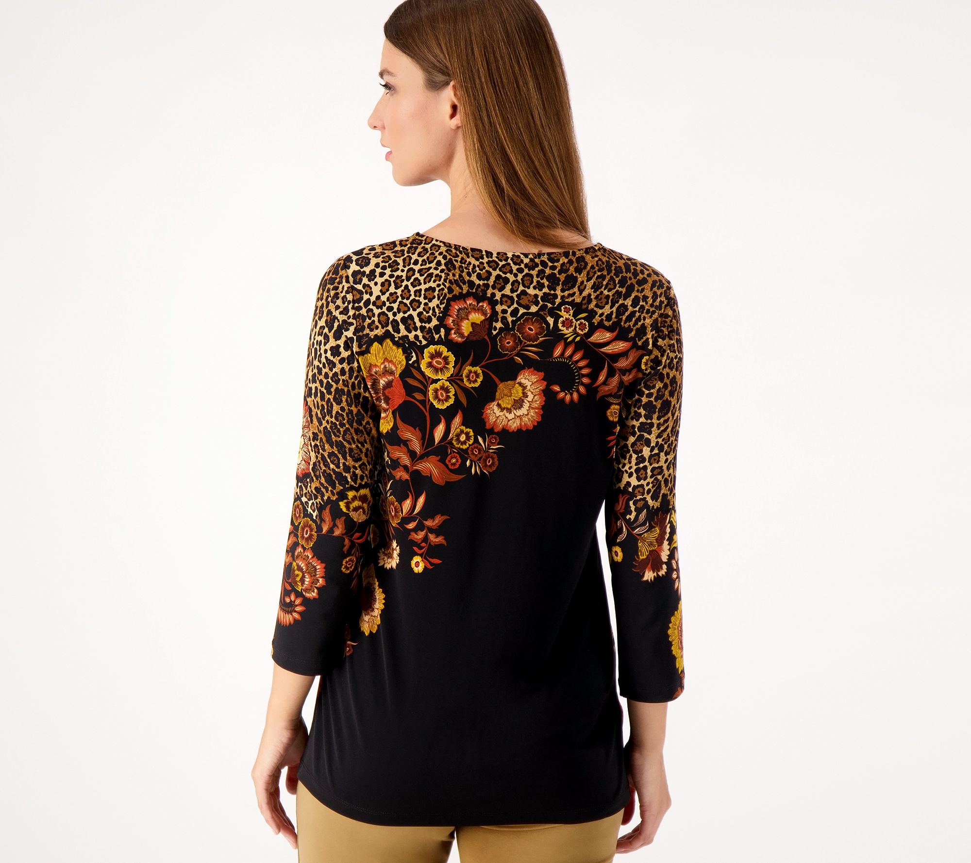 • Features: printed, V-shape keyhole, novelty bar trim at center front neckline, 3/4-length sleeves, straight bottom hemline, pullover style