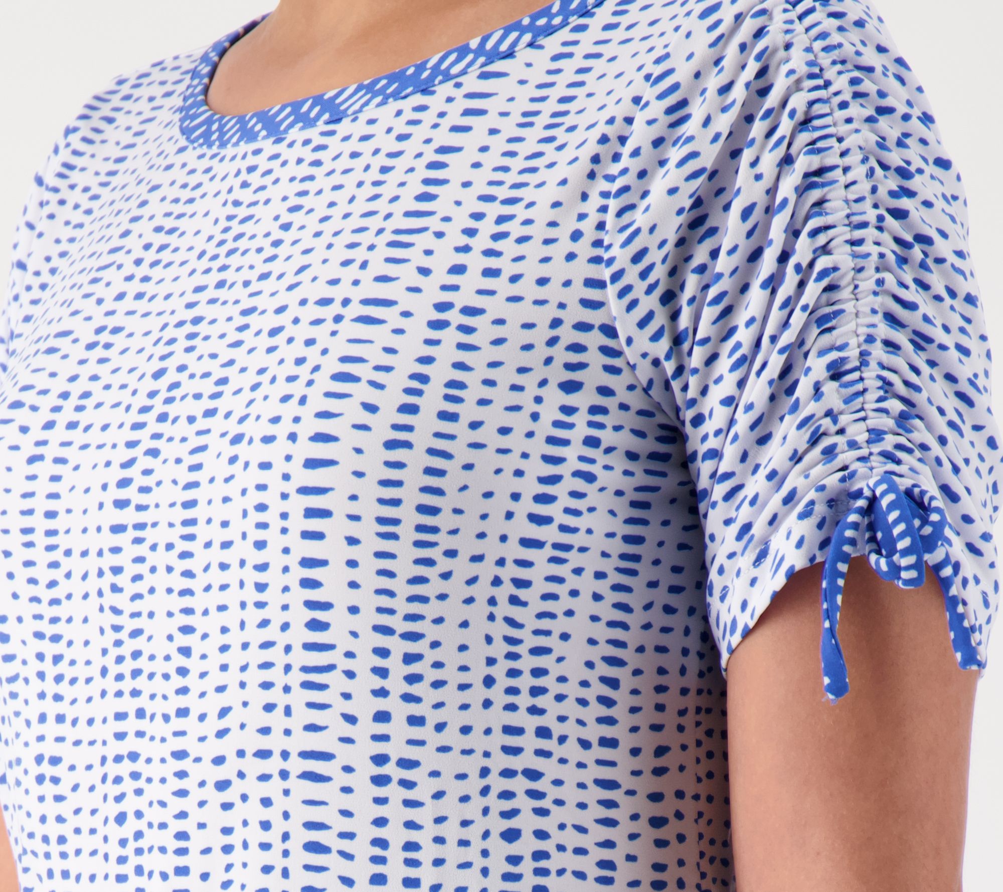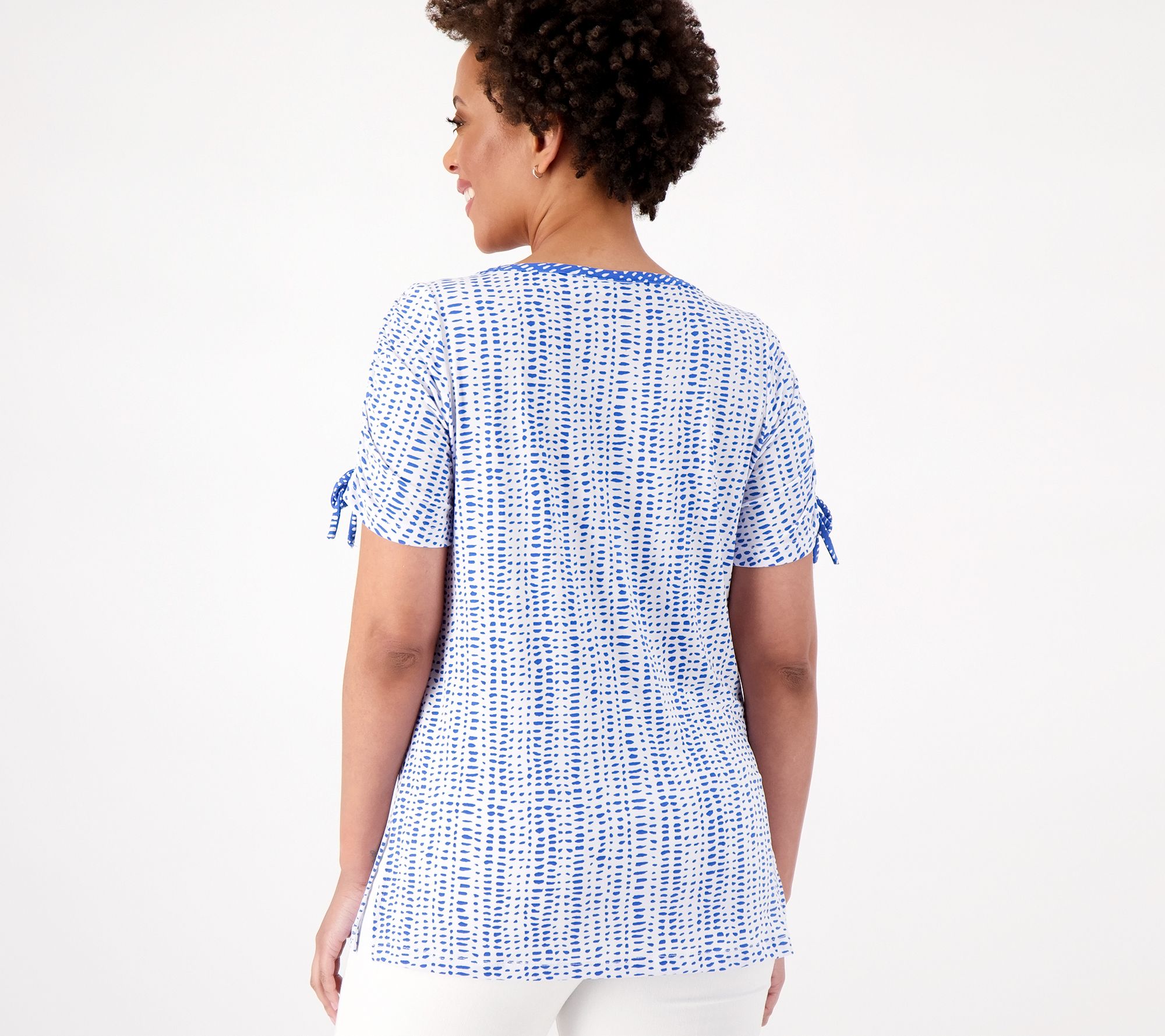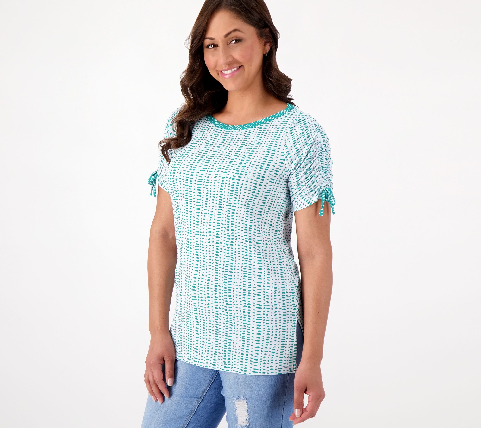 We love the sweet feminine vibes of this pretty printed top, featuring fab ruched short sleeves with bow tie details. From Susan Graver.
