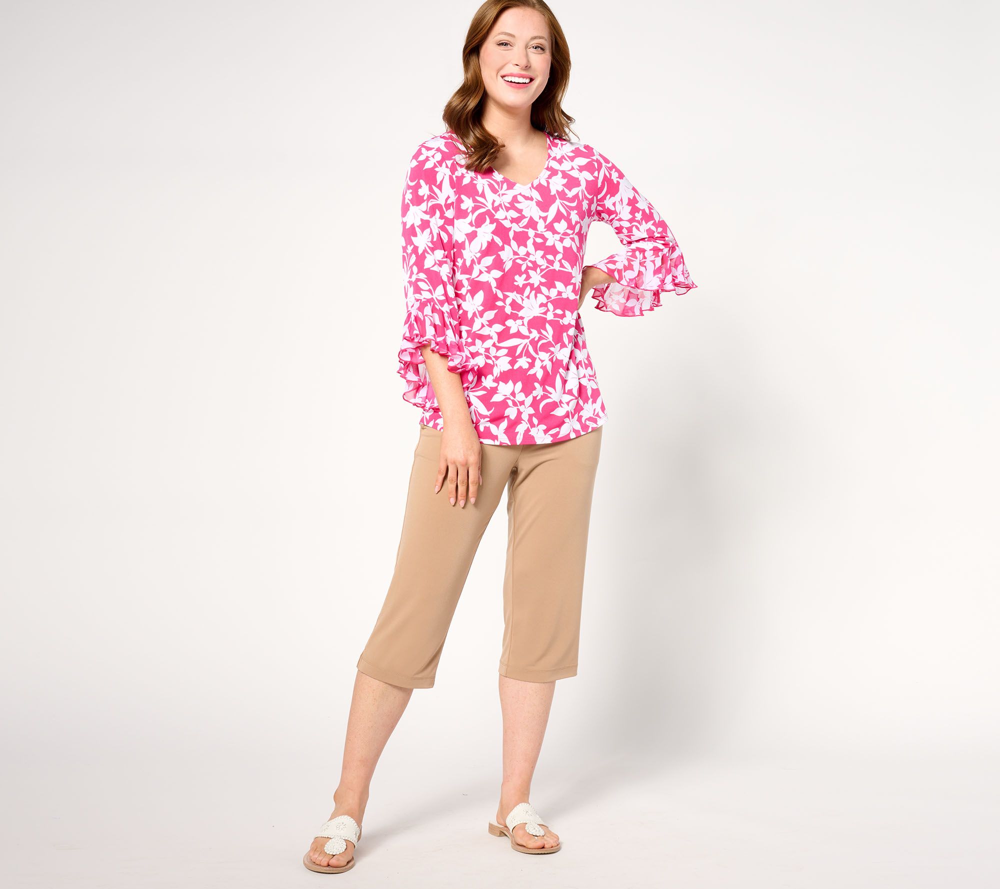 "As Is" Susan Graver Printed Liquid Knit Top w/ Chiffon Ruffle Sleeve