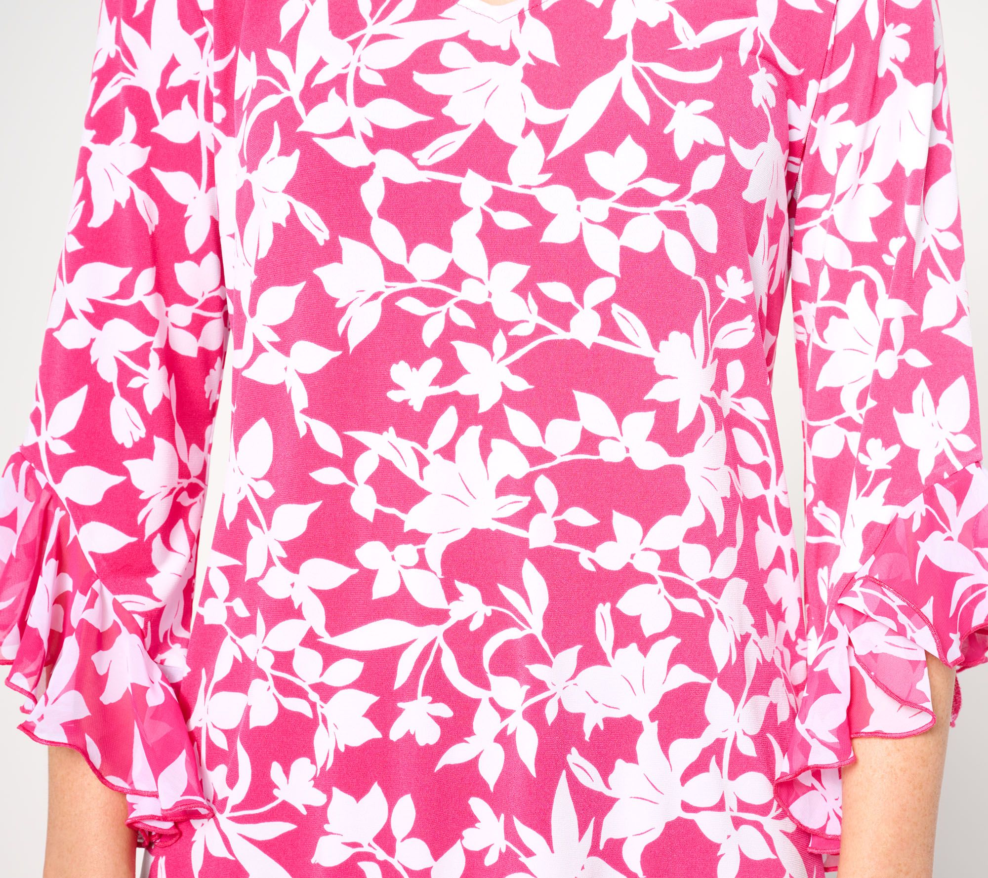 • Features: 3/4-length chiffon ruffle sleeves, V-neckline, shirttail hem