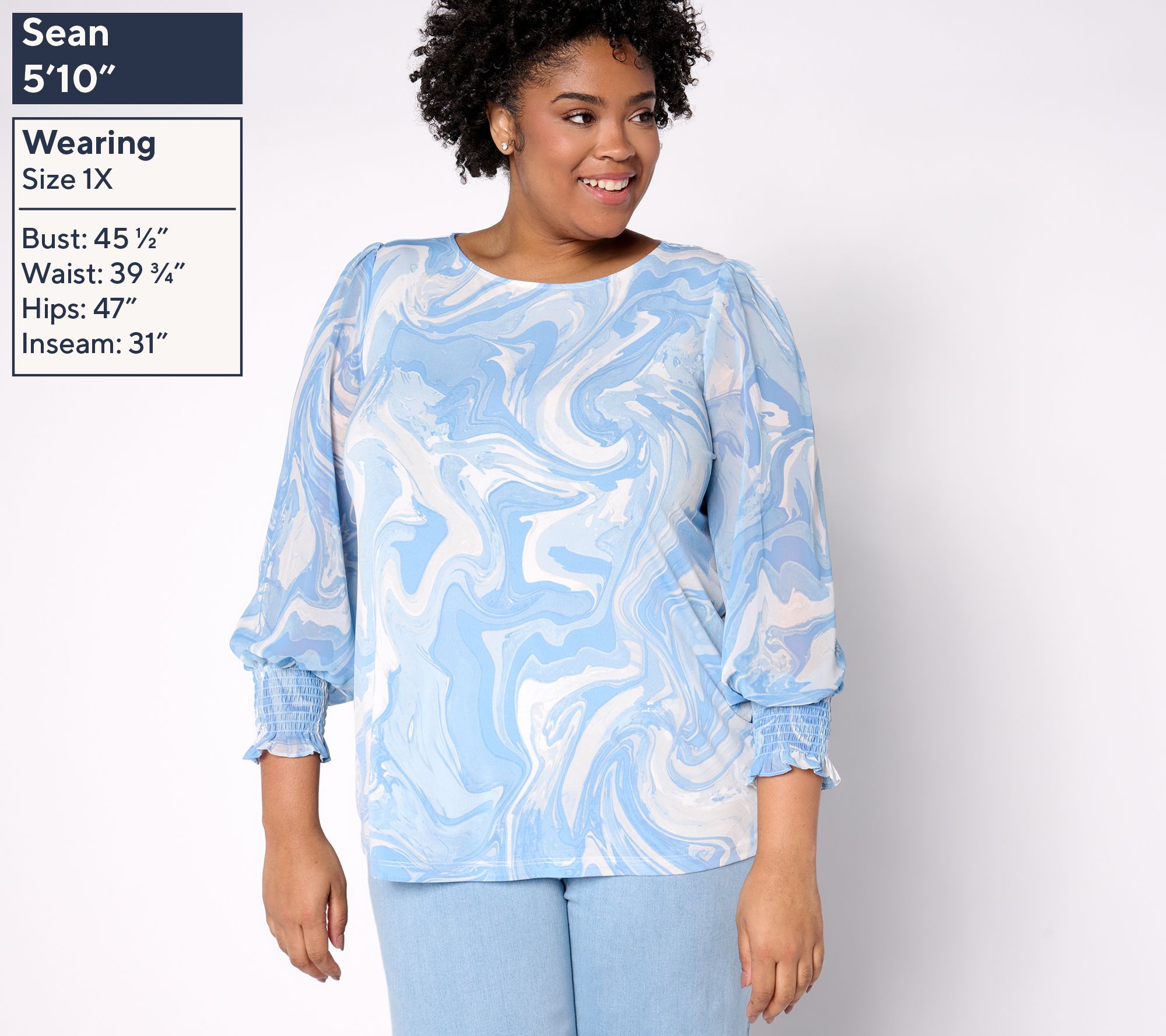 • Fabrication: printed Liquid Knit® body: soft, flattering knit with a smooth feel and fluid drape; woven blouson sleeves in a matching print
