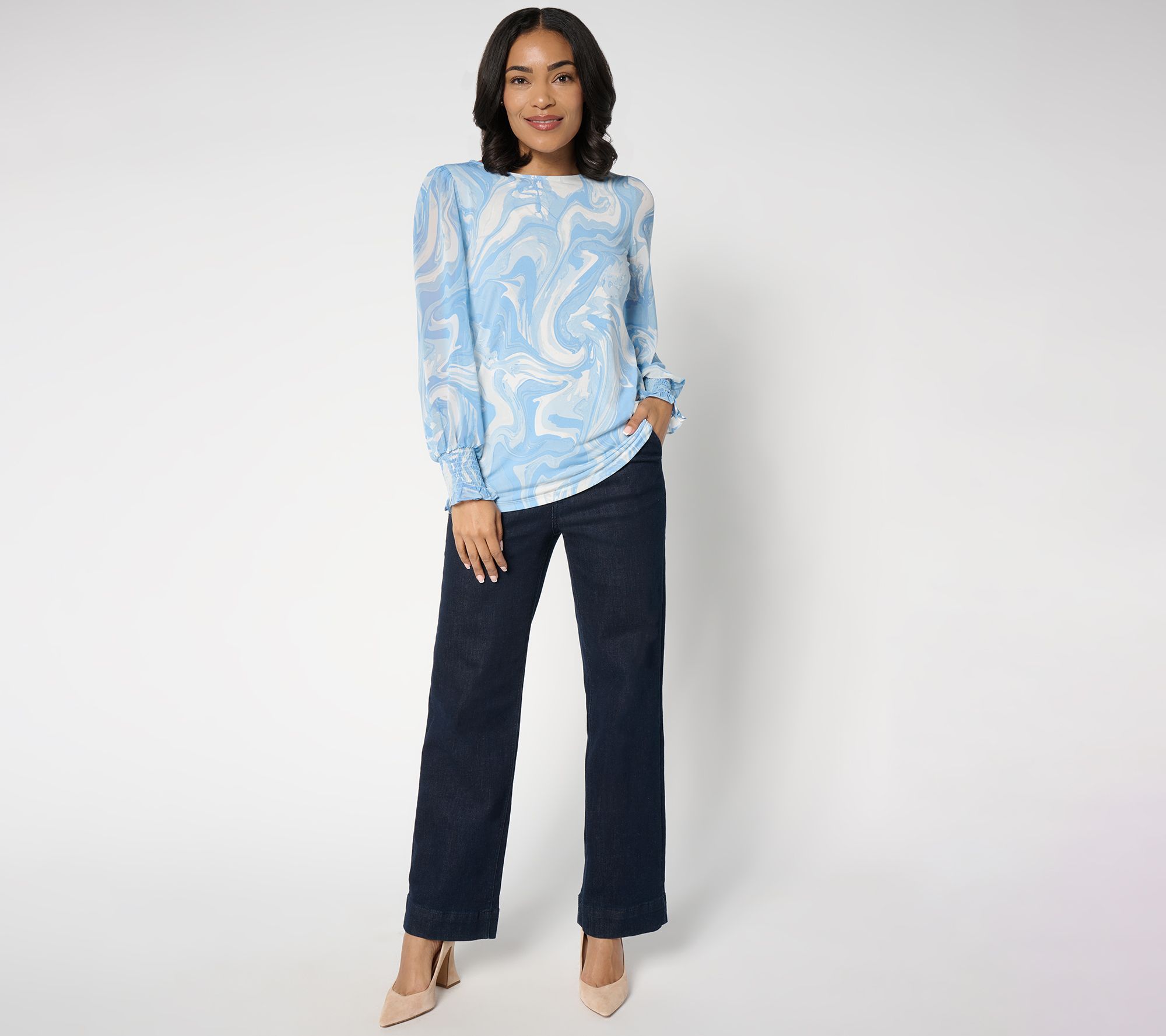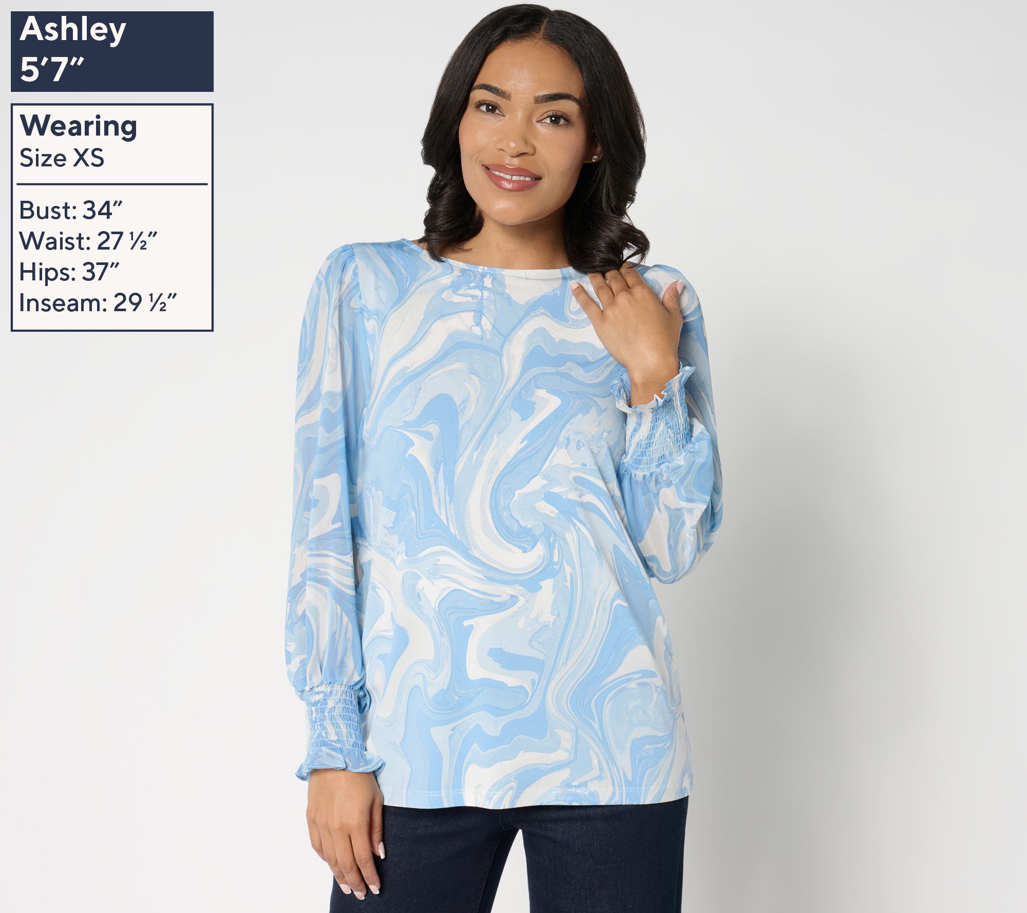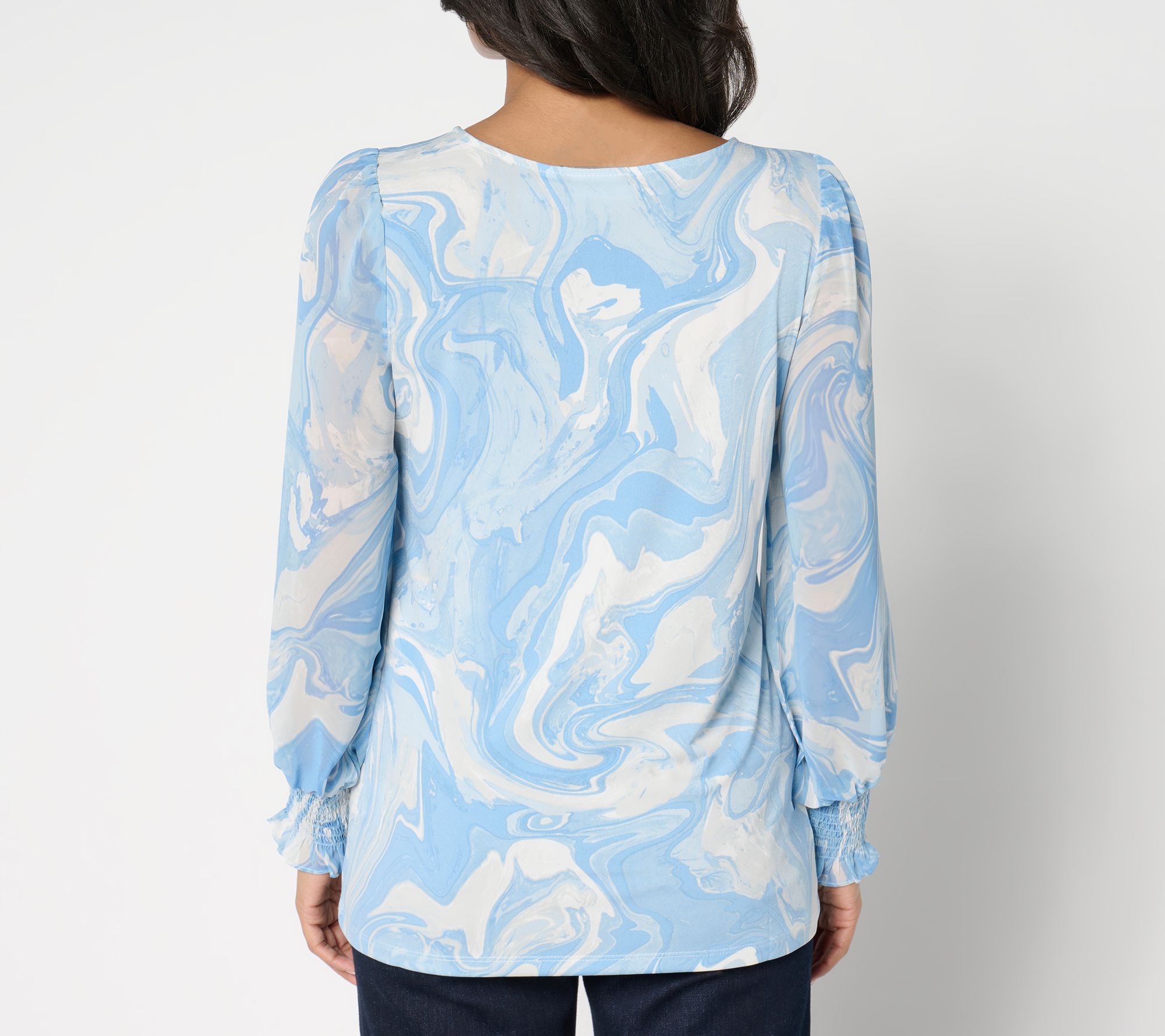 Work the room in this dreamy top. A flattering Liquid Knit® body makes for more comfortable extended mixing and mingling, while a refreshing print and sweetly detailed woven sleeves help it stand out from your everyday wardrobe options -- and look pretty in social pics! From Susan Graver.
