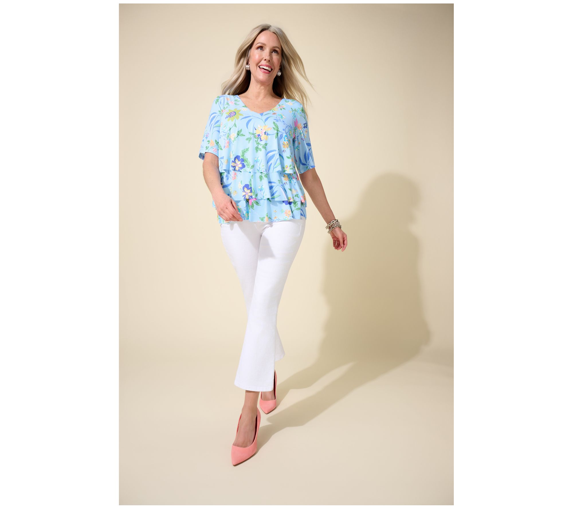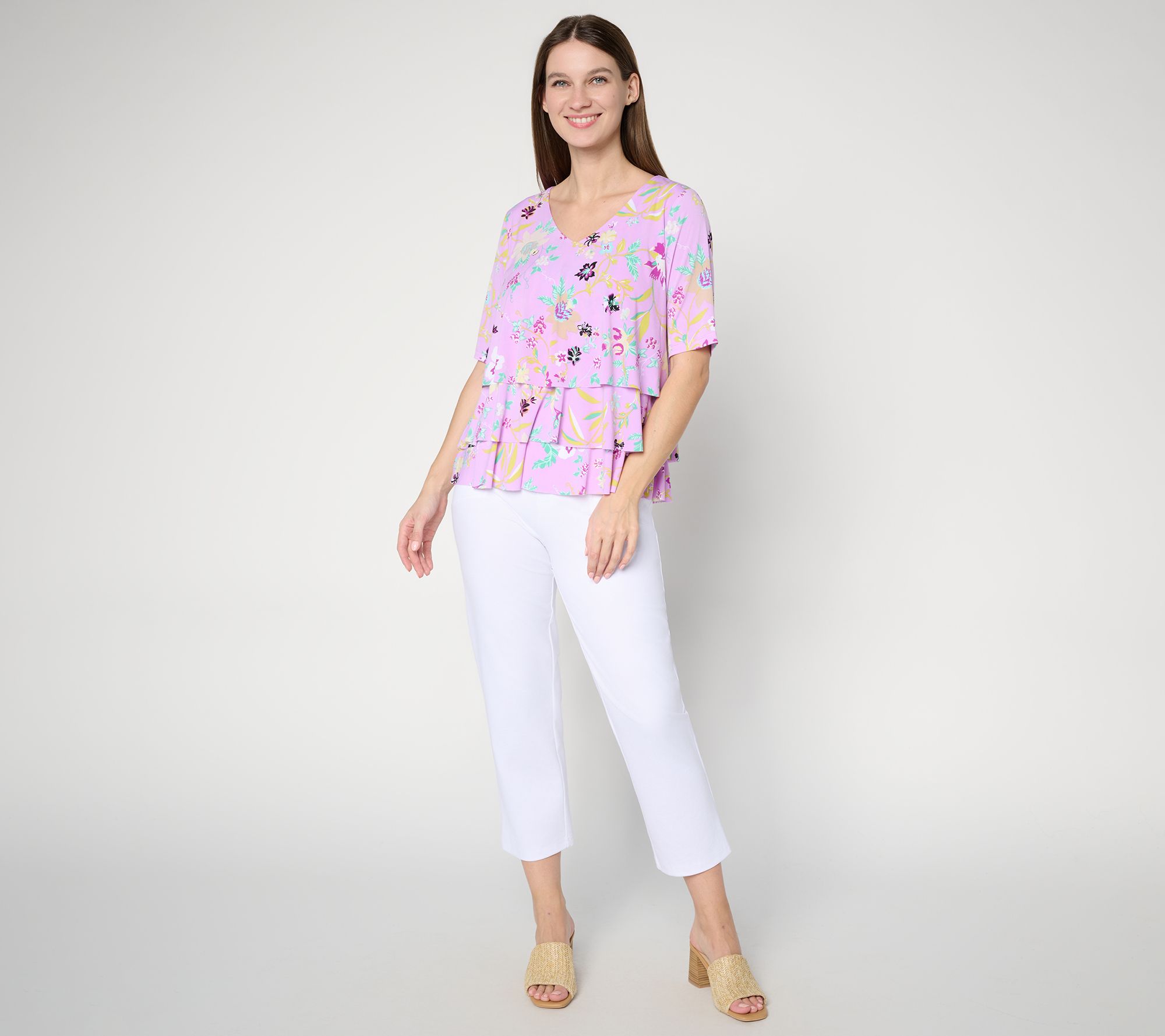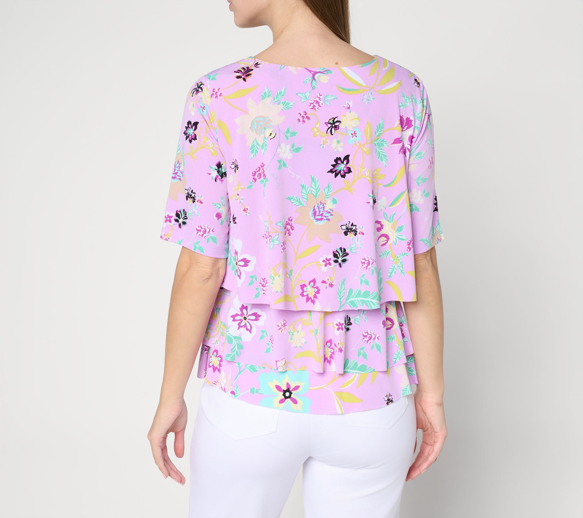 A pretty print and Liquid Knit fabrication make this top a must-have. But Susan Graver didn't stop there! She added in a flattering V-neckline and forgiving tiered design so you can sport springtime vibes and feminine flair for any event on your warm-weather calendar. From Susan Graver.