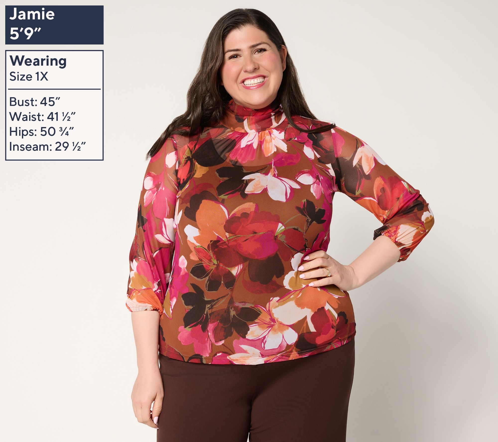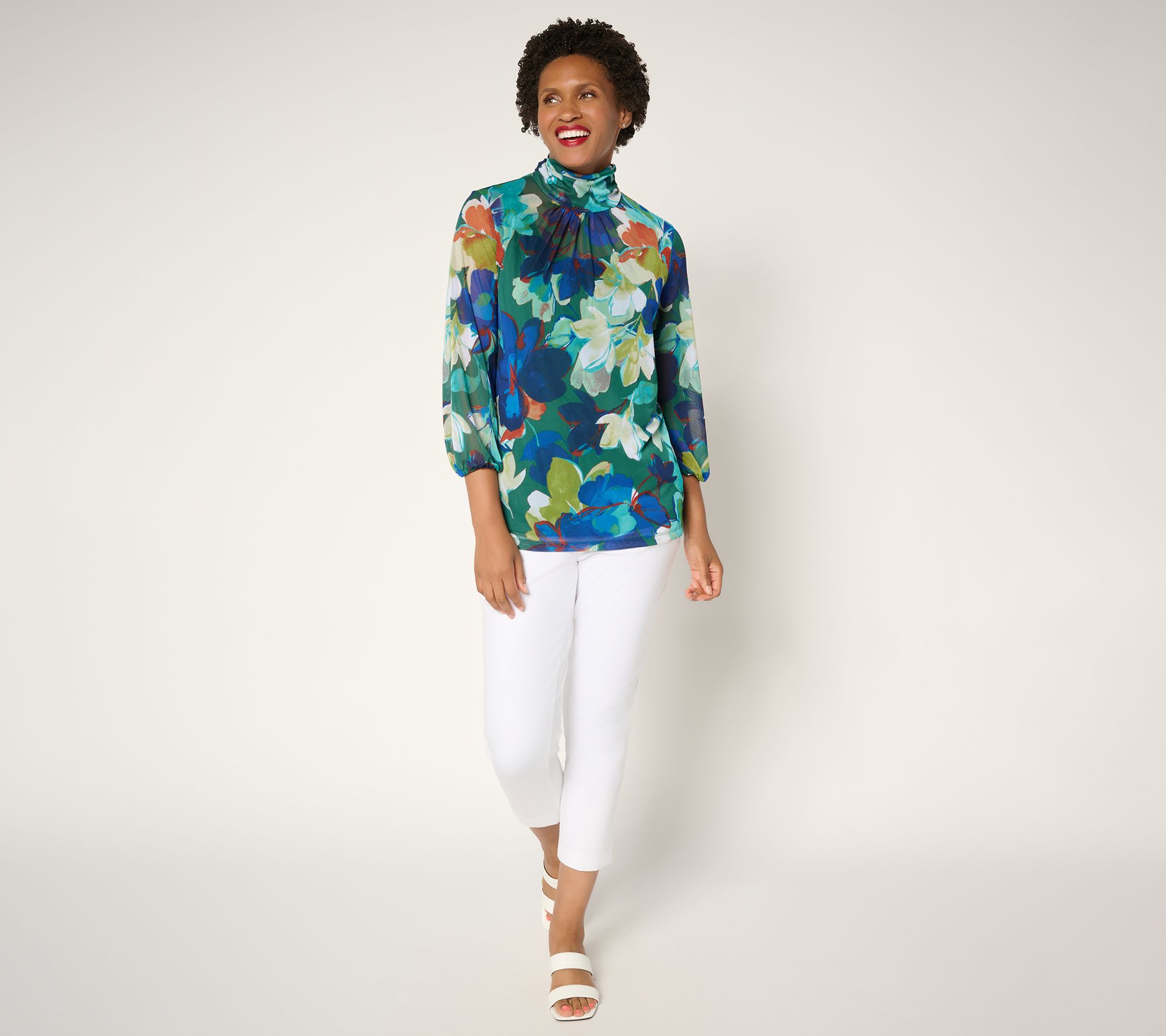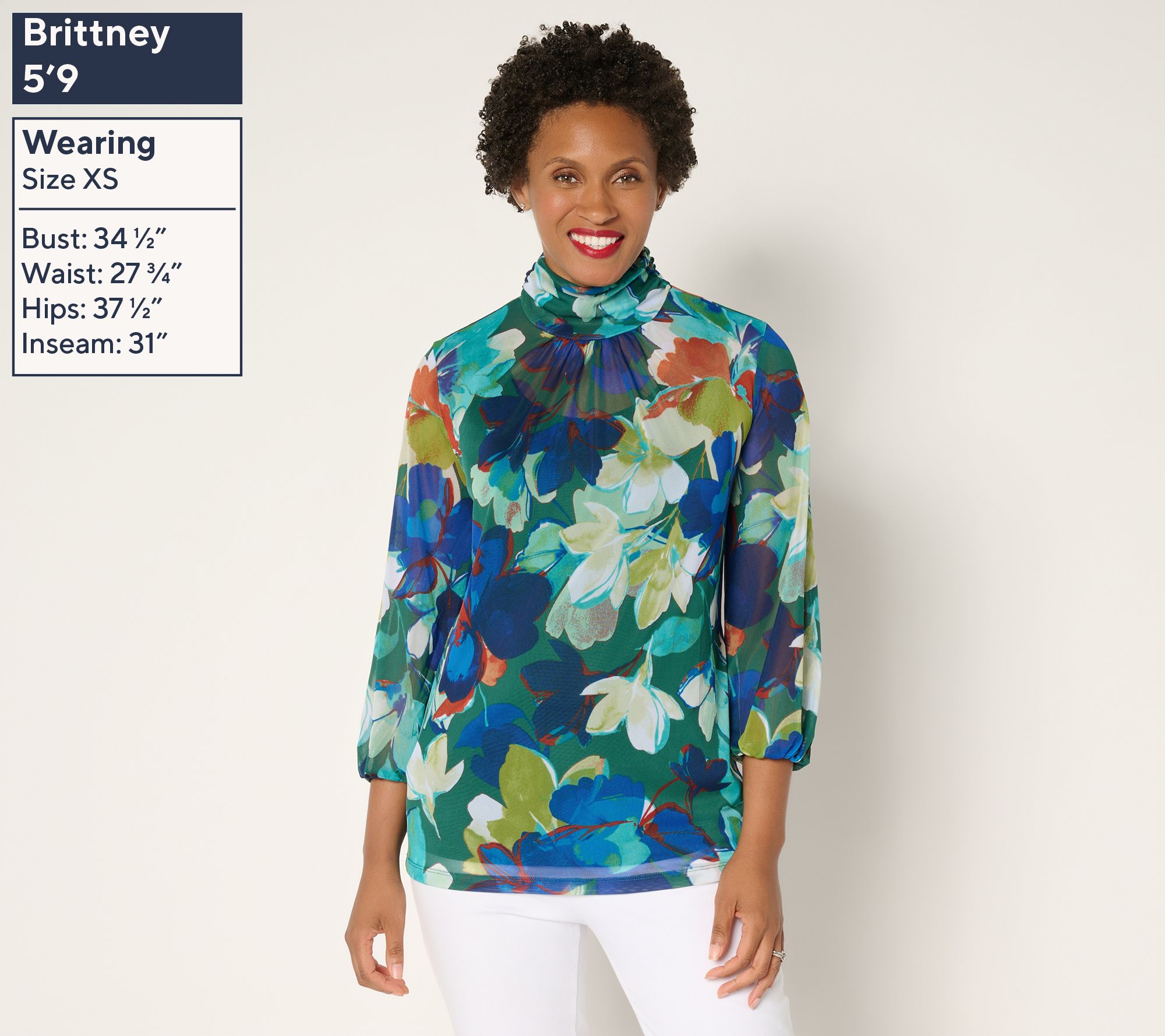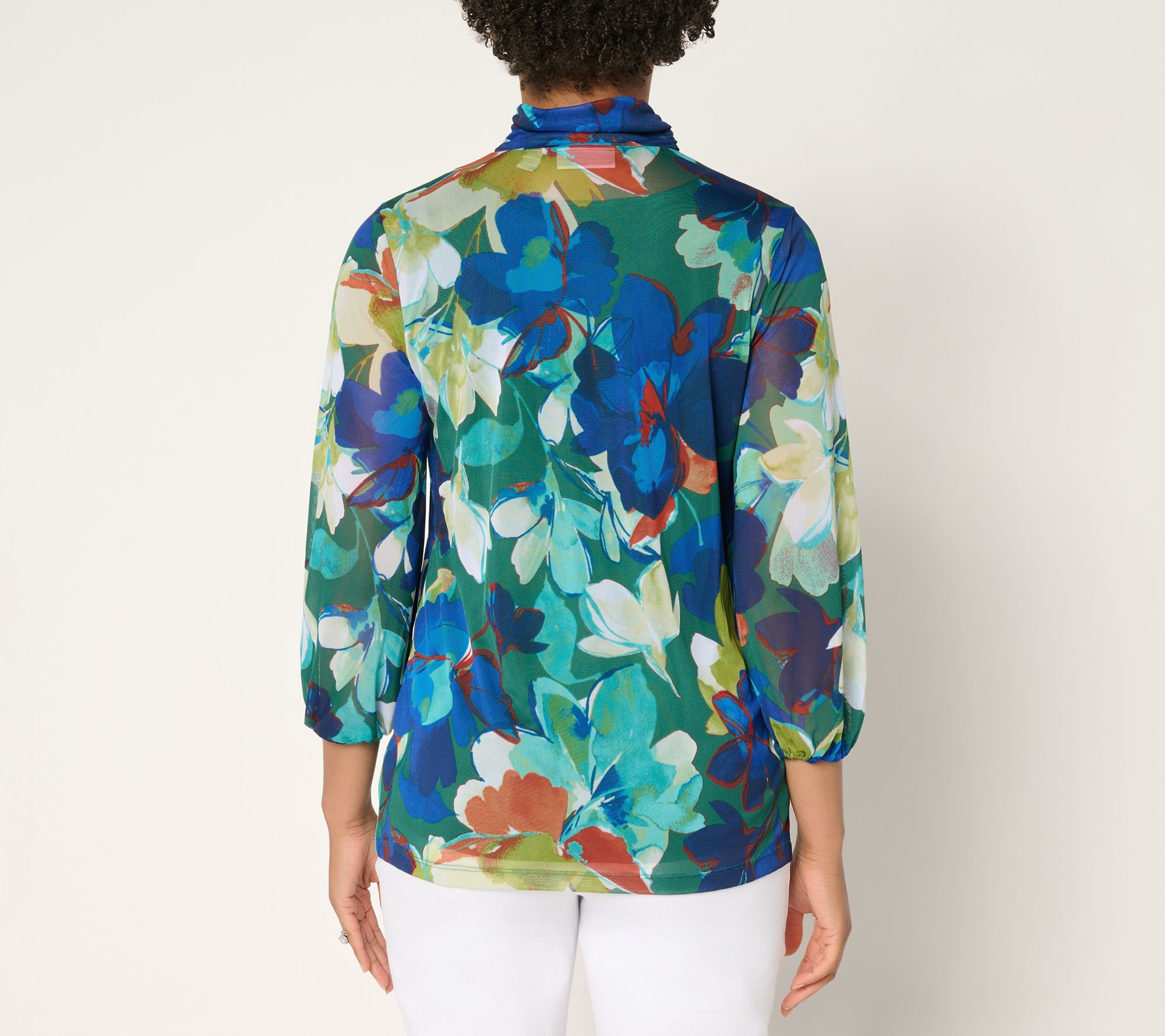 • Top Features: allover print, pullover style, mock neckline, 3/4-length blouson sleeves, elastic cuffs, straight bottom hem