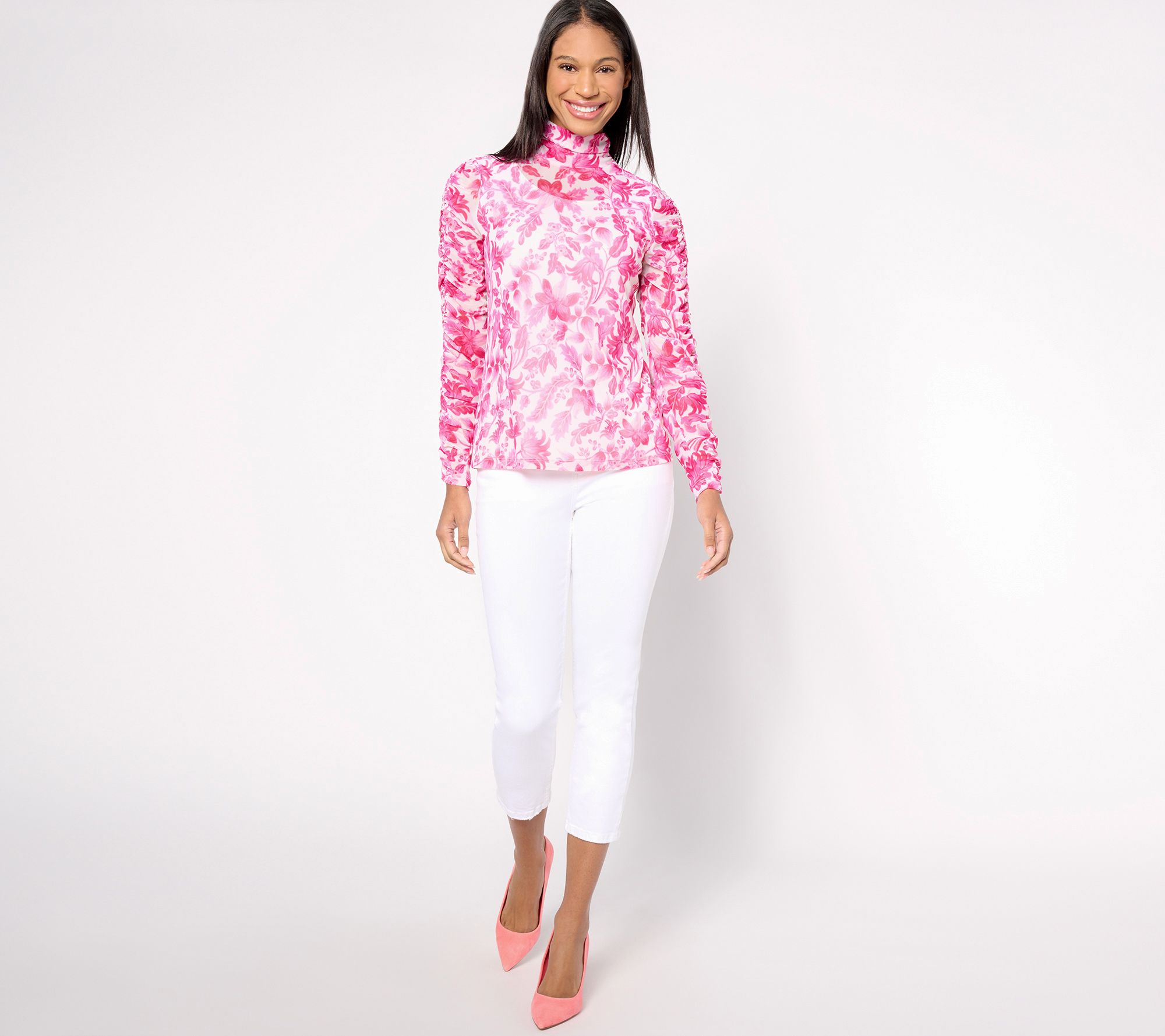 Feel fabulous when you're wearing this mesh mock-neck top. The elegant print and ruched detail makes all the difference when it comes to this show-stopping style. From Susan Graver.