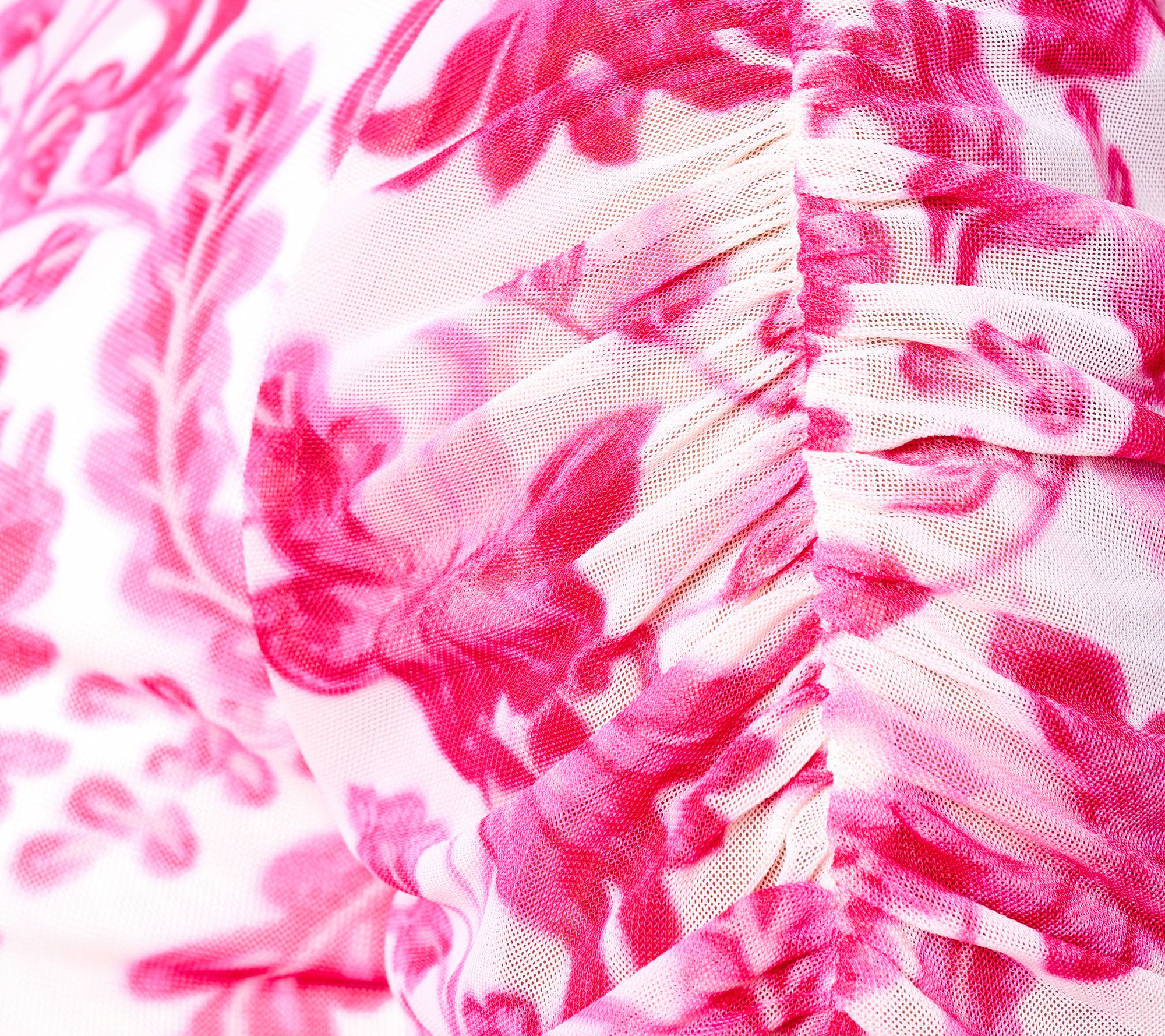 • Features: allover print, mesh, ruched mock neck collar, forward shoulder, long sleeves with elastic ruching at sleeve outside seams, lining attached on body only