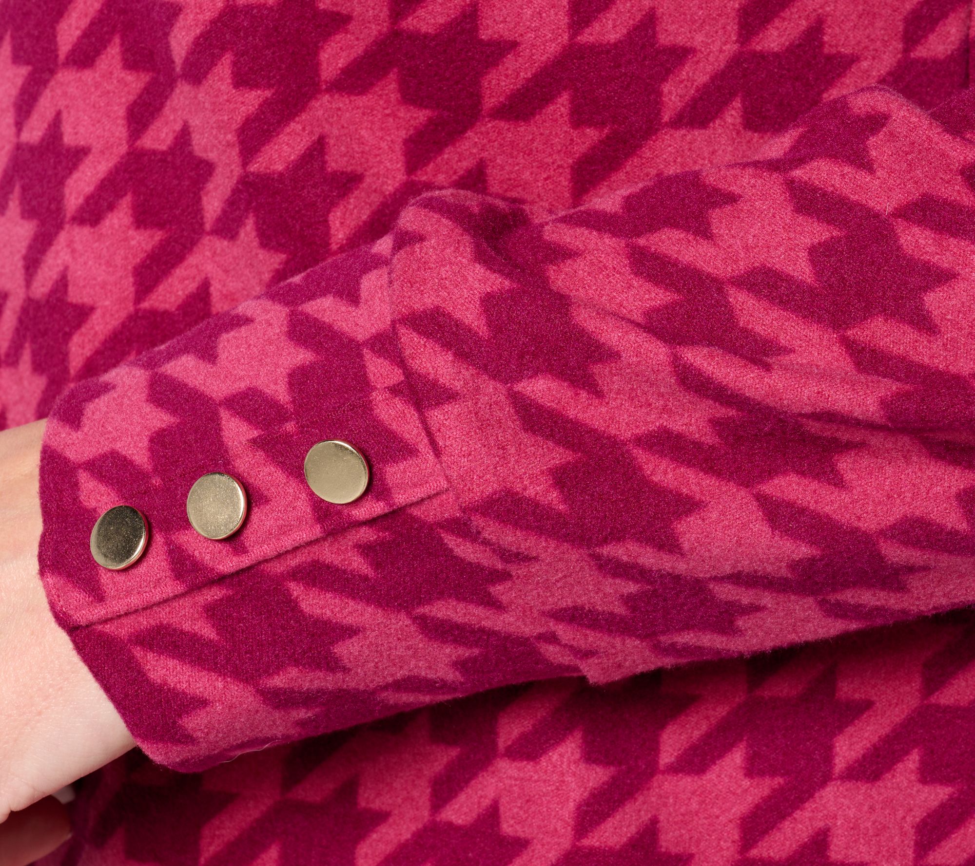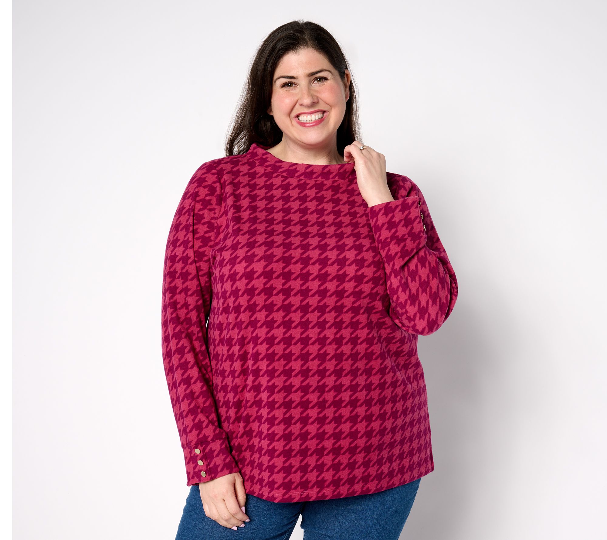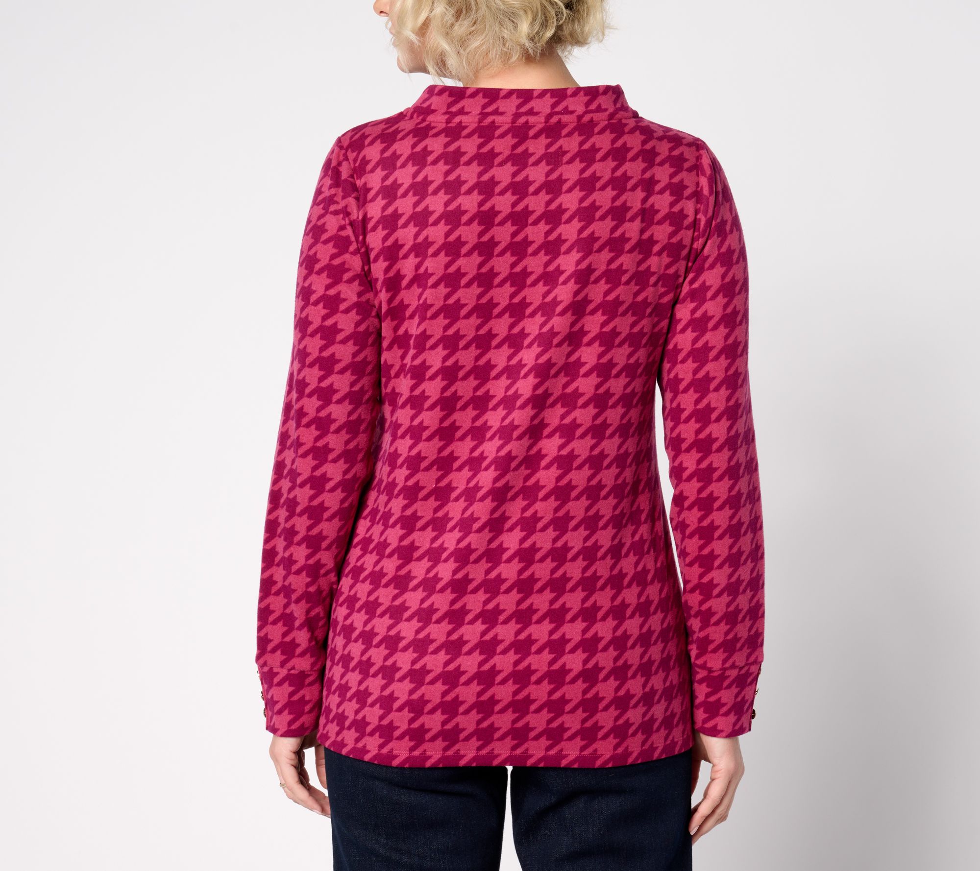 Enhance your wardrobe with this printed microfleece pullover, a fashionable addition that brings elegance to your attire. This chic top is designed with a wide neck collar and decorative buttons on the cuffs for a sophisticated touch. The side slits offer added comfort, making it ideal for layering during the cooler days. From Susan Graver.