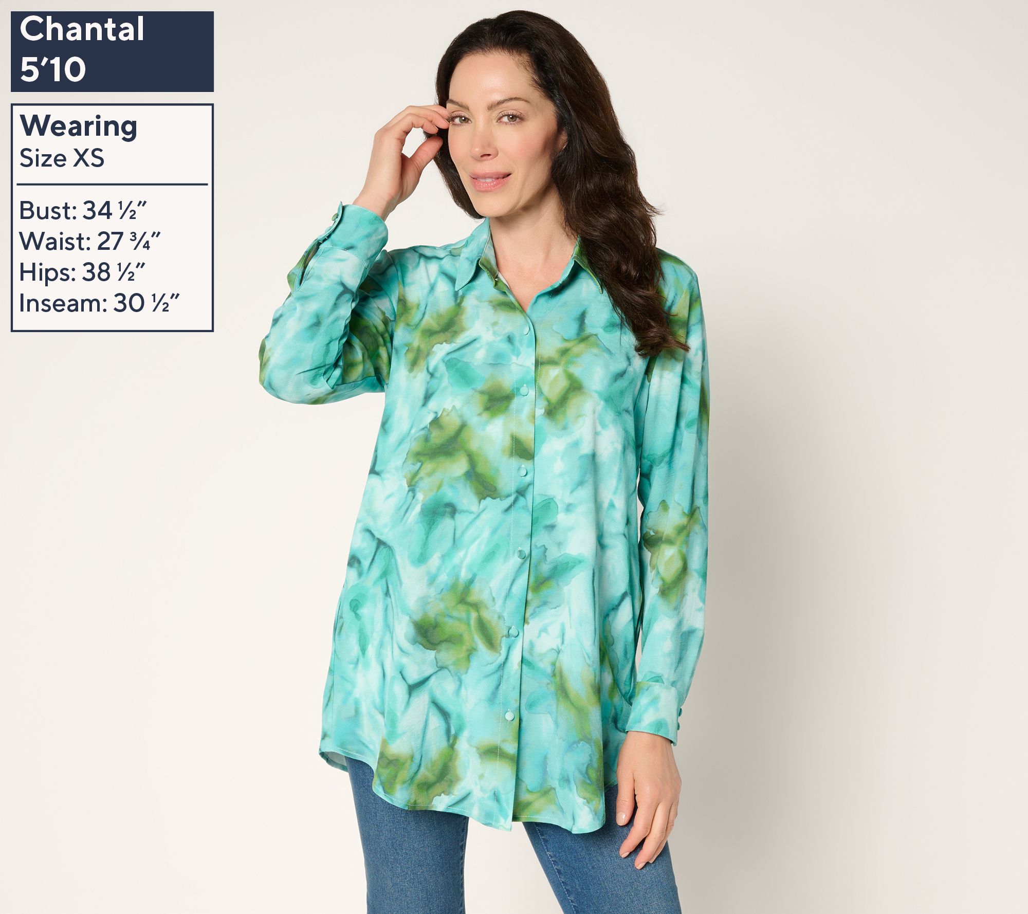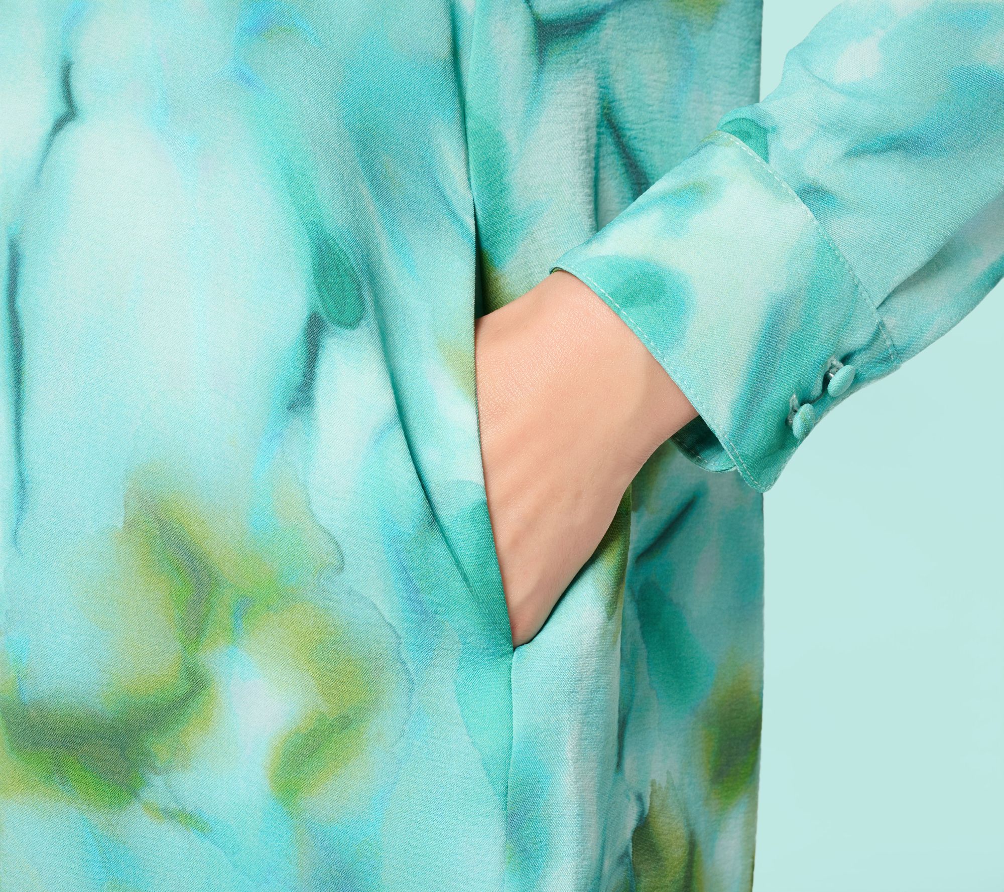 • Features: printed design, duster length, button-front closure, shirt collar, long sleeves, button cuffs, side-seam pockets