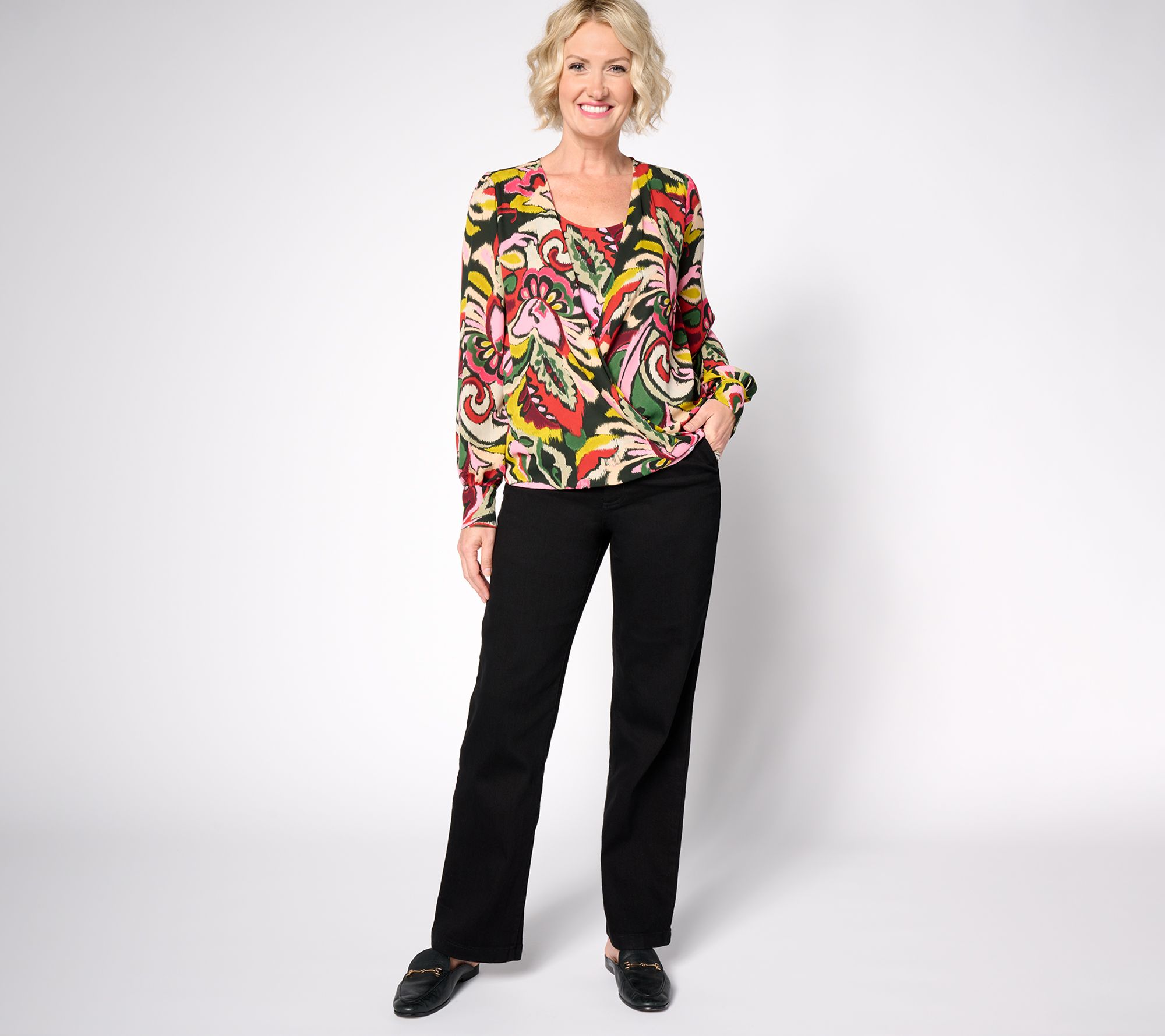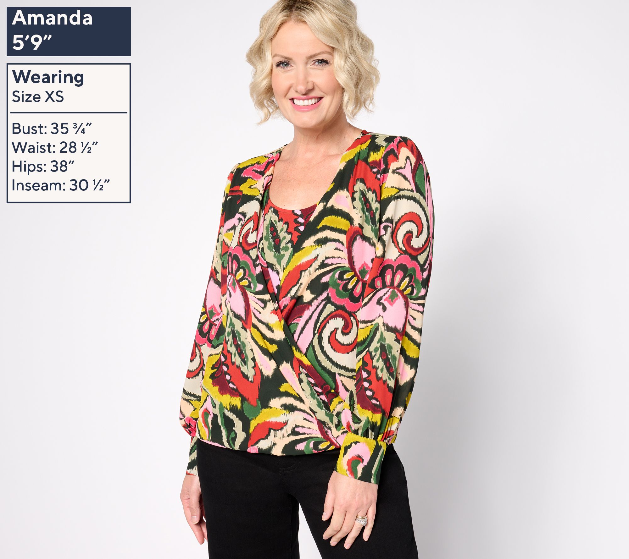 You're busy, and you deserve a top that can keep up with your social calendar. This printed woven blouson top provides an effortlessly chic option that works well with tailored trousers, dark denim, and so much more. Combining a surplice drape front with a printed knit inner tank for added coverage, this colorfully coordinated look can be dressed up for a day in the office or styled more casually for everyday outings. From Susan Graver.