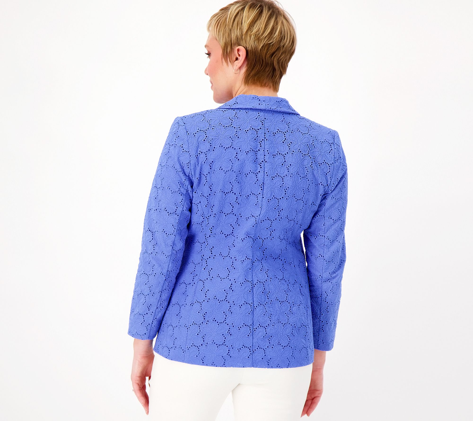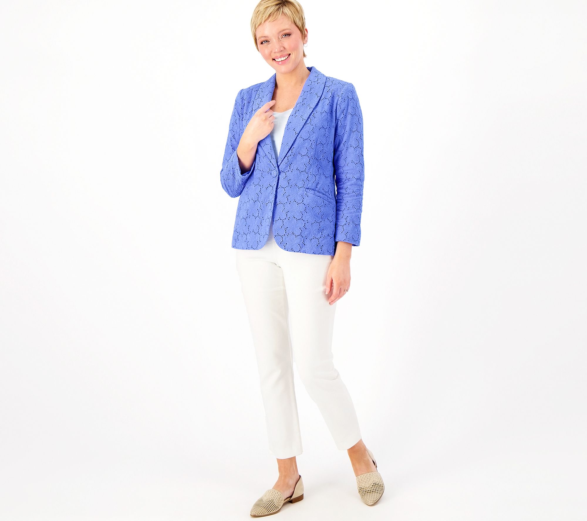 Wondering what to wear for your hybrid work sitch, Sunday services, or al freso dining invites? Pop on this pretty eyelet blazer for instant polish. It layers beautifully with blouses, tees, and tanks, plus the sleeve length is perf for showing off your brand-new bracelet finds! From Susan Graver.